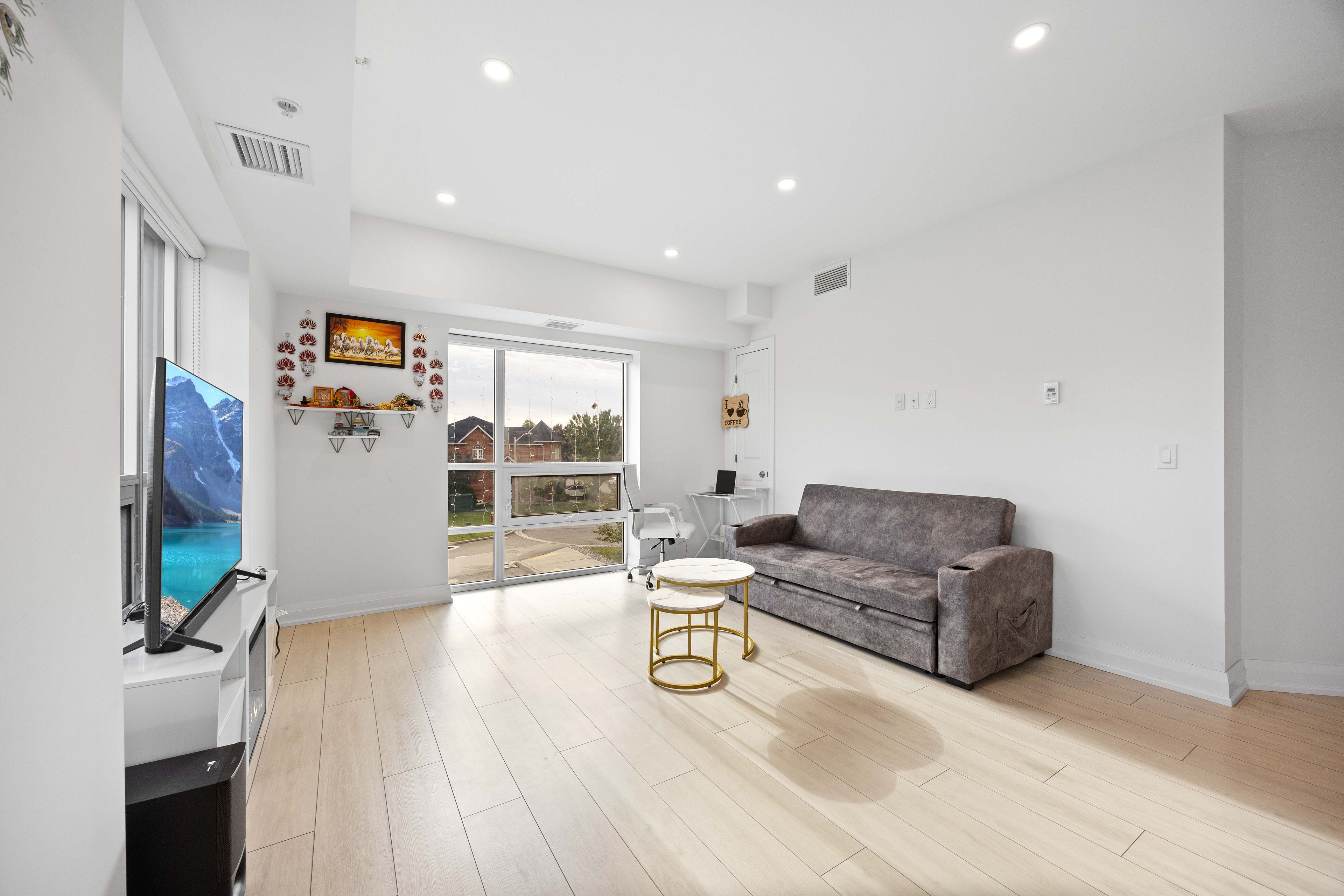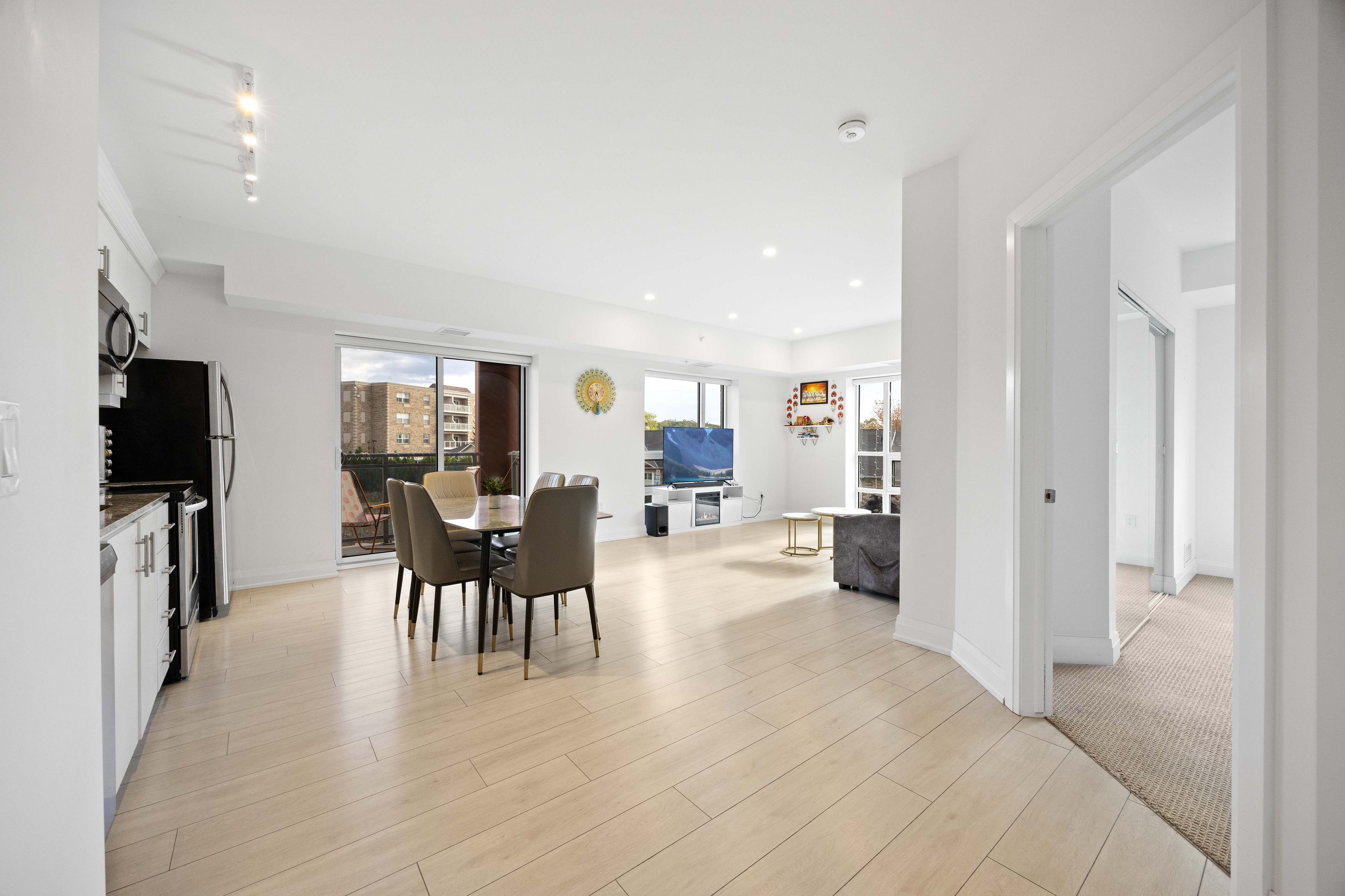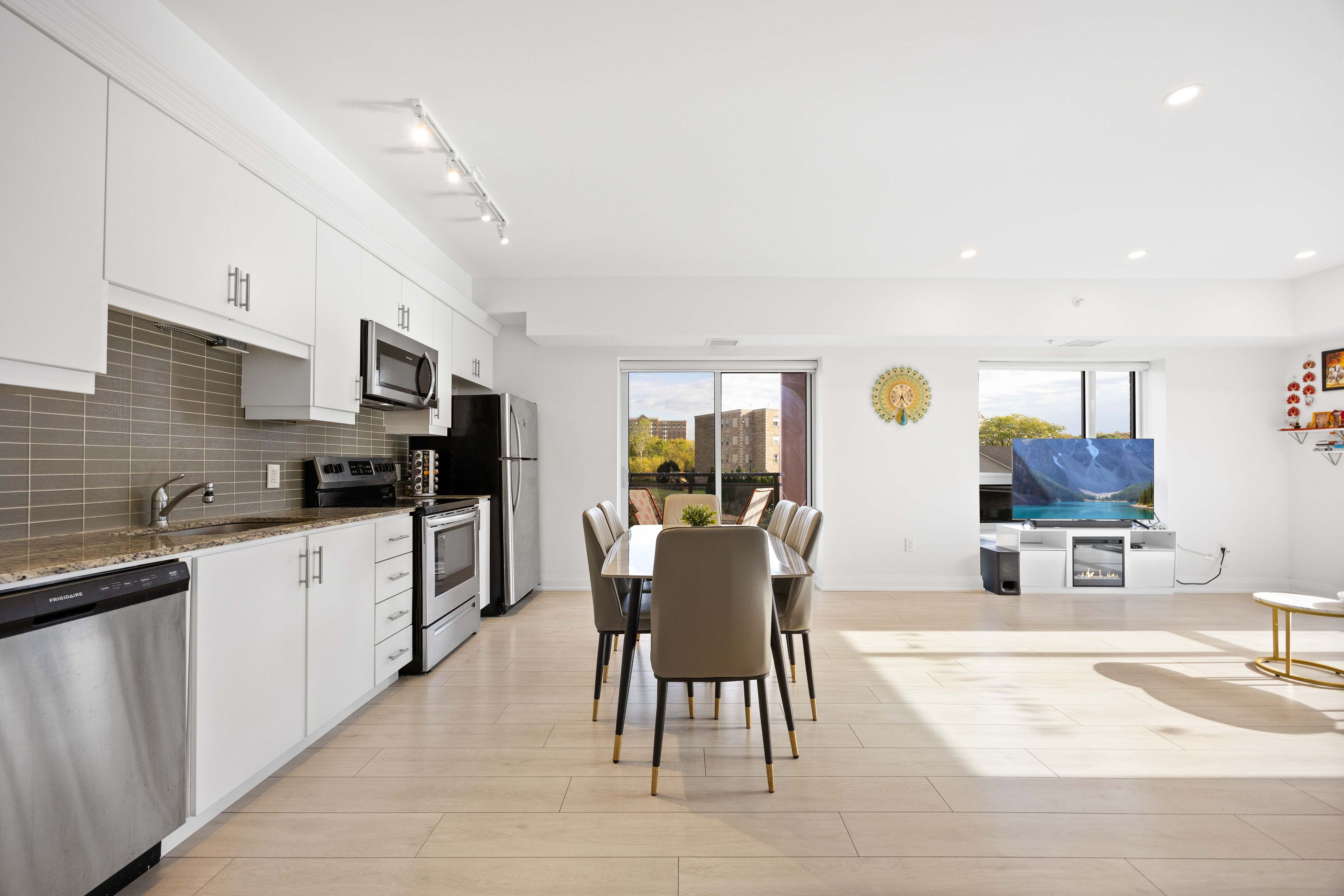 Welcome to this exceptional corner suite, perfectly situated in the heart of the highly sought-after tansley neighbourhood. This bright and beautifully designed 2-bedroom, 2-bathroom residence offers an open-concept layout enhanced by soaring 9-foot ceilings and expansive floor-to-ceiling windows that flood the space with natural light while capturing tranquil south and east-facing views. With no neighbours on either side, the suite offers a rare sense of privacy, complemented by a private balcony ideal for relaxing or entertaining. The spacious primary bedroom features a luxurious 4-piece ensuite, while the second bedroom is thoughtfully appointed with wall-to-wall closets, providing generous storage. Elegant wide-plank laminate flooring flows throughout the home, leading into a contemporary kitchen complete with sleek white flat-panel cabinetry, granite countertops, and stainless-steel appliances-perfectly blending style and functionality. Additional highlights include in-suite laundry, abundant closet space, a storage locker on the same floor for convenience, and one underground parking space. Ideally located close to shopping, dining, parks, and transit, this refined condo offers the perfect balance of comfort, sophistication, and everyday convenience, an exceptional place to call home.