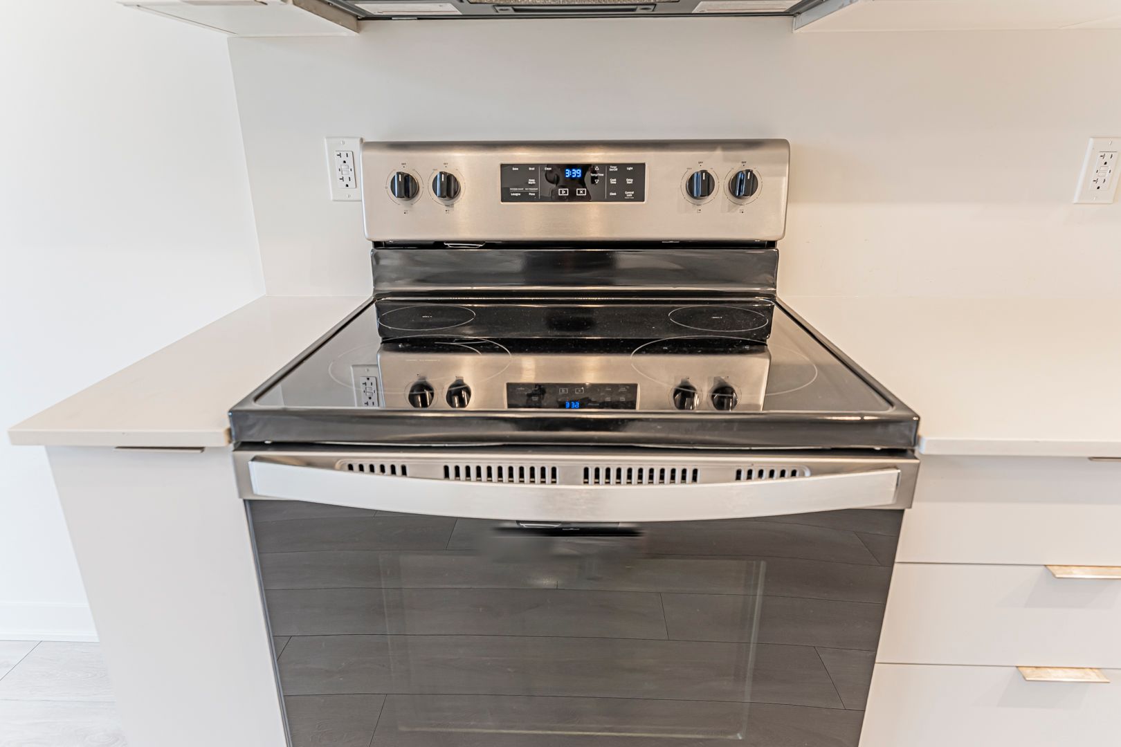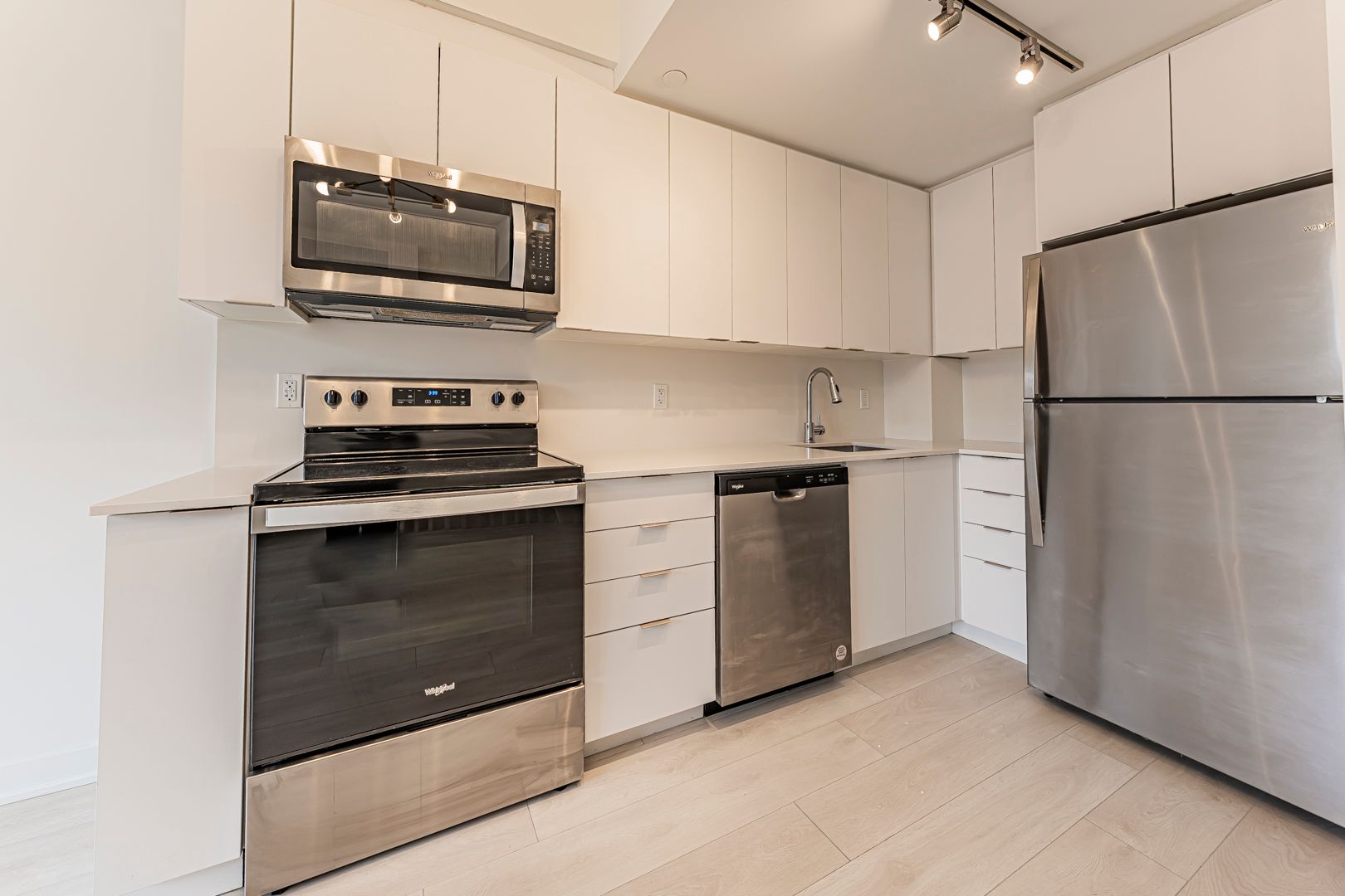 • Contemporary kitchen with quartz countertops and stainless steel appliances.