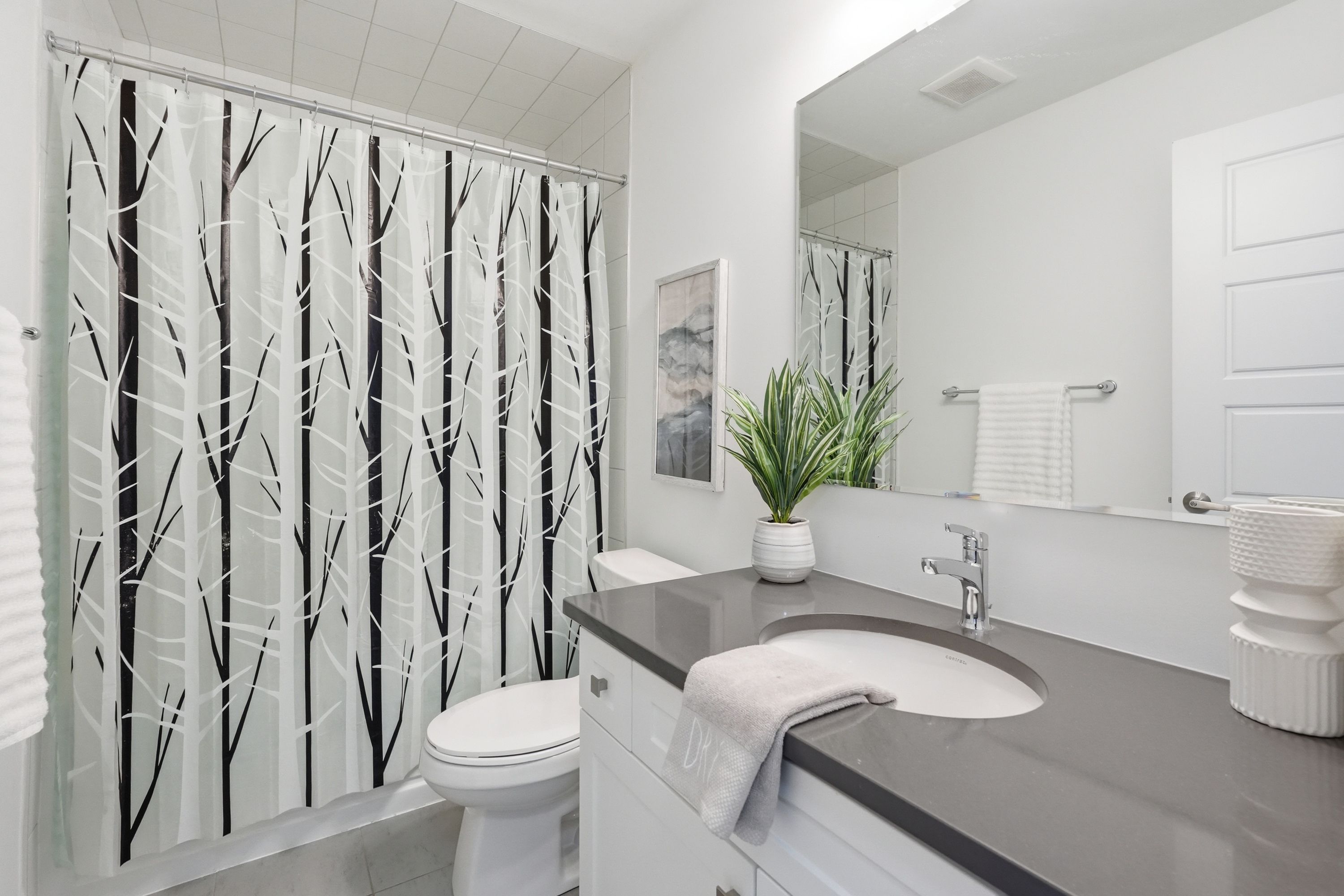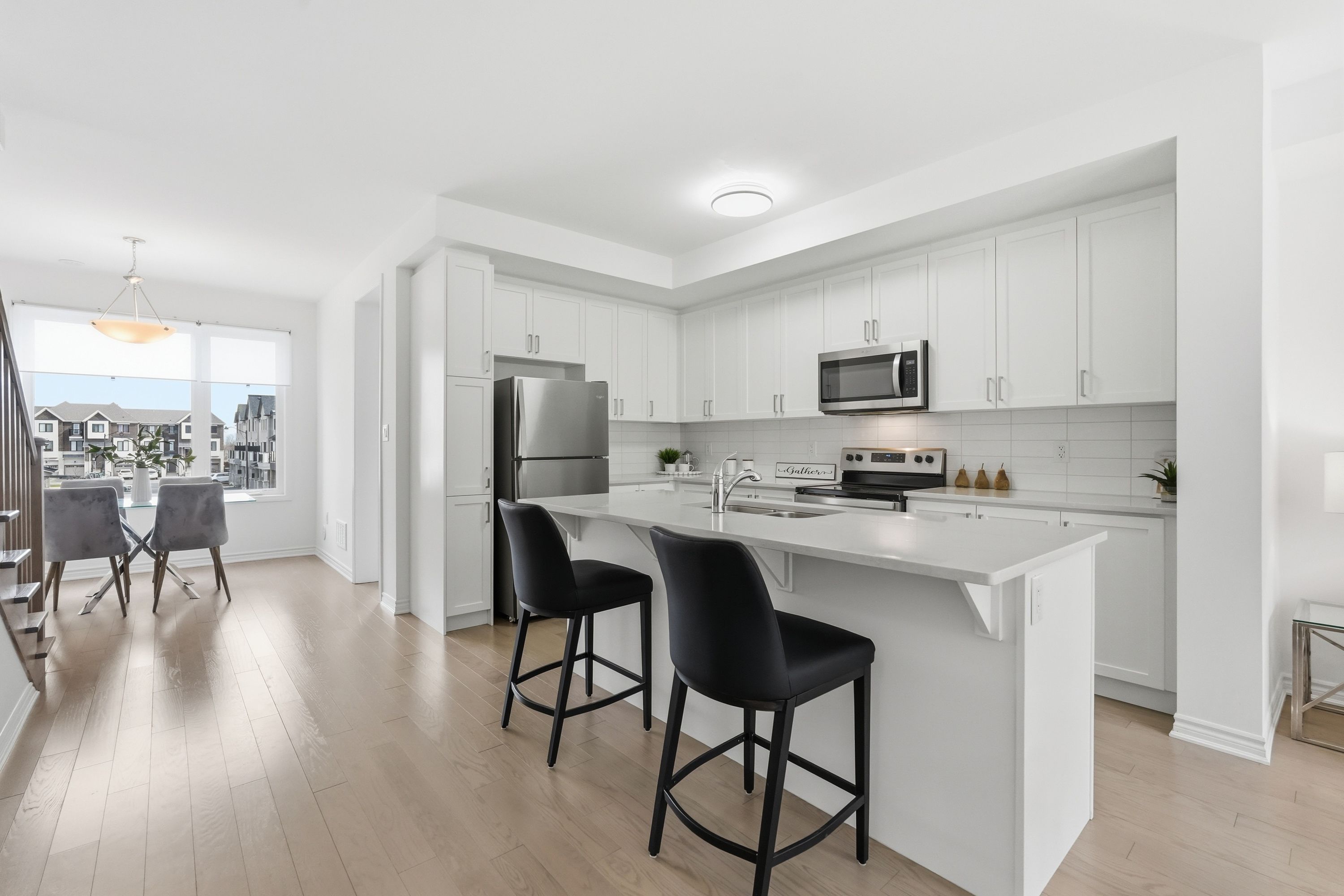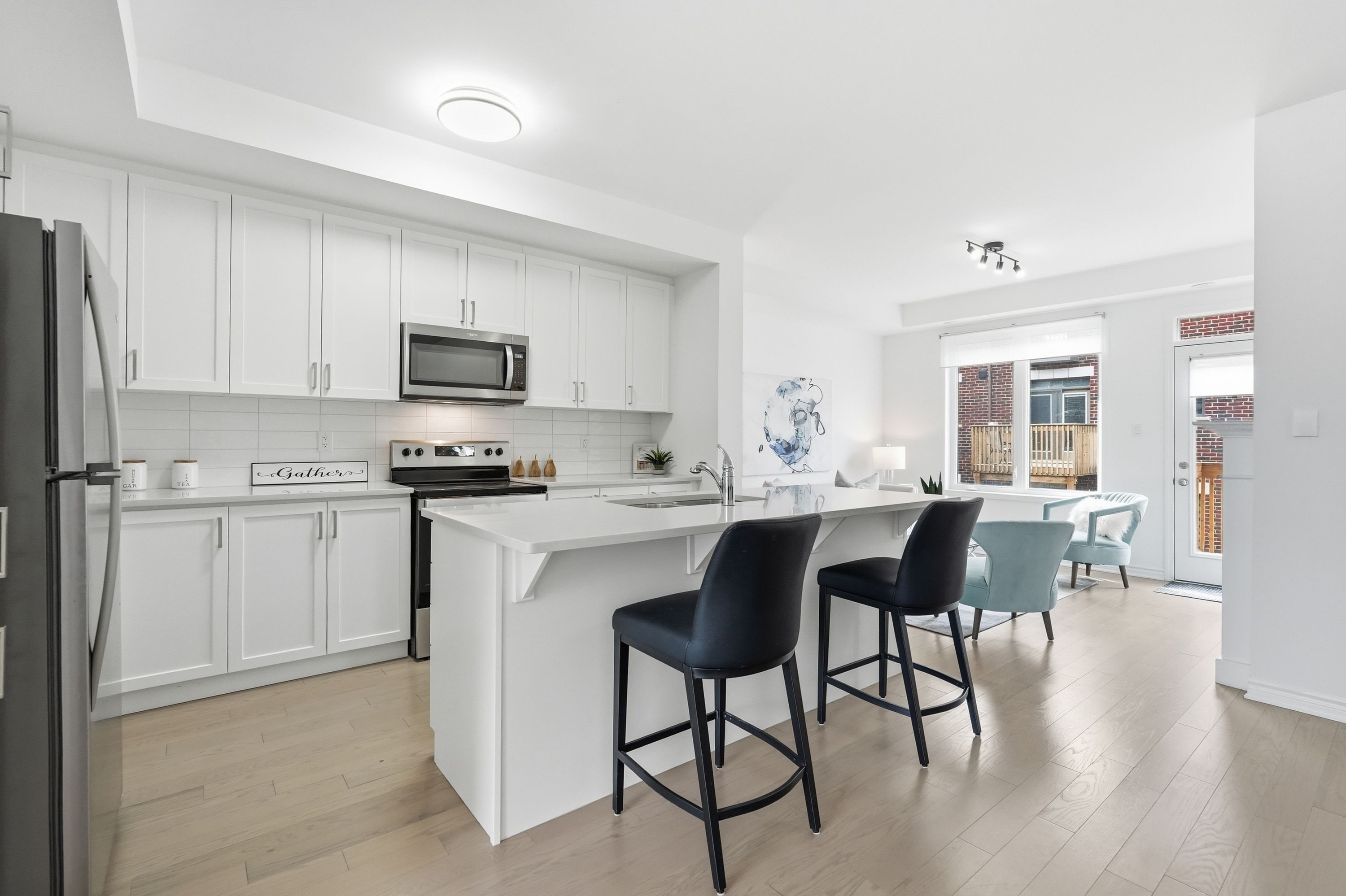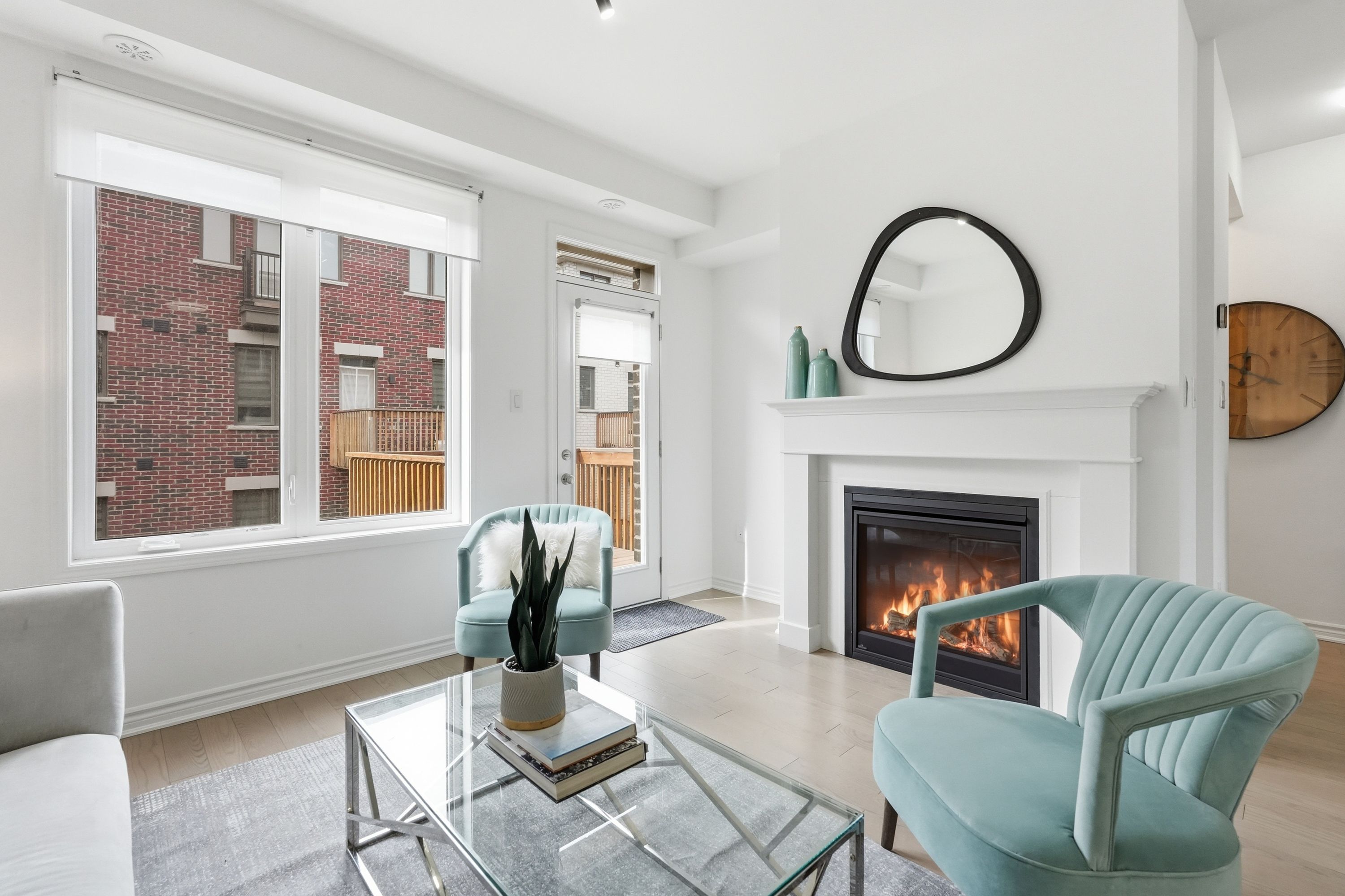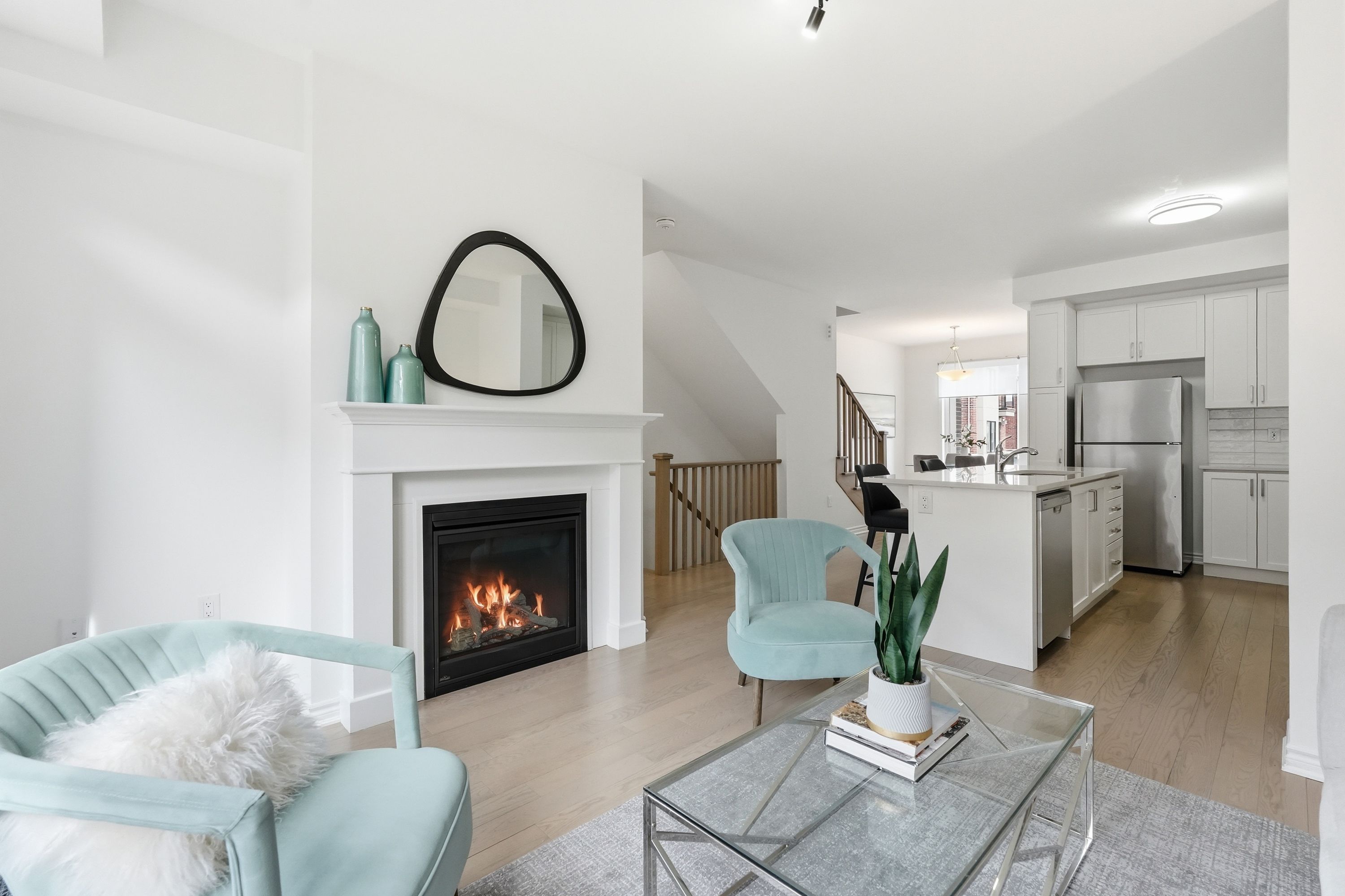 • Stylish kitchen with quartz countertops and bright living area with a gas fireplace.
