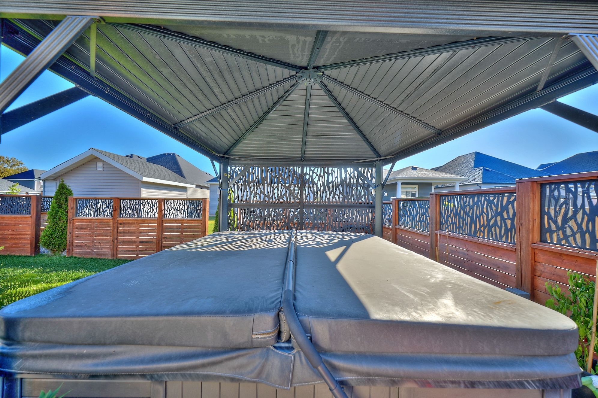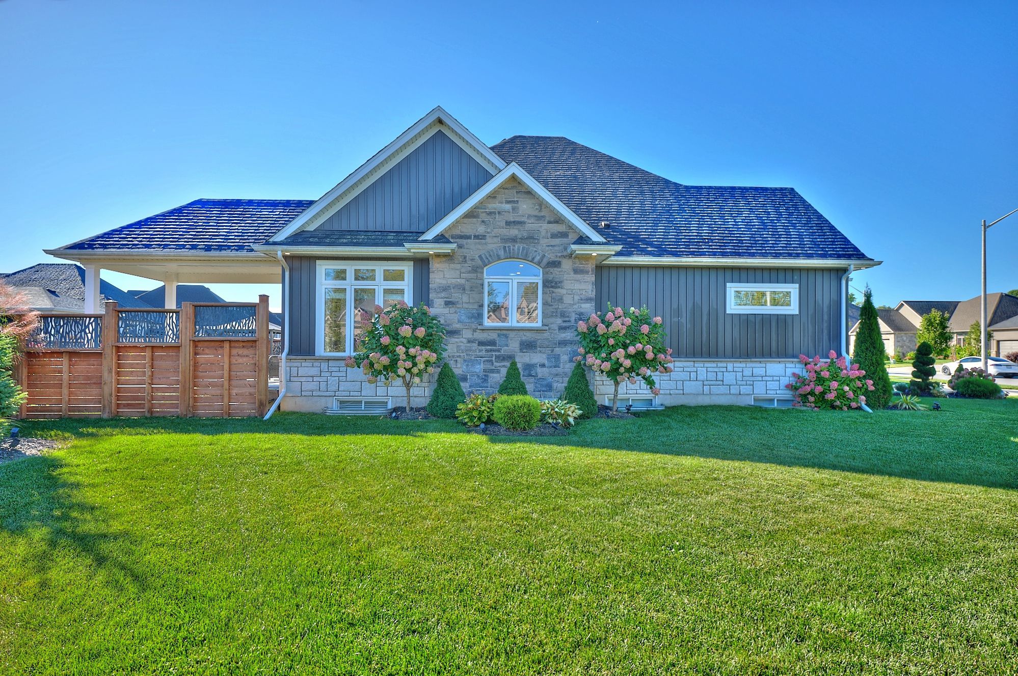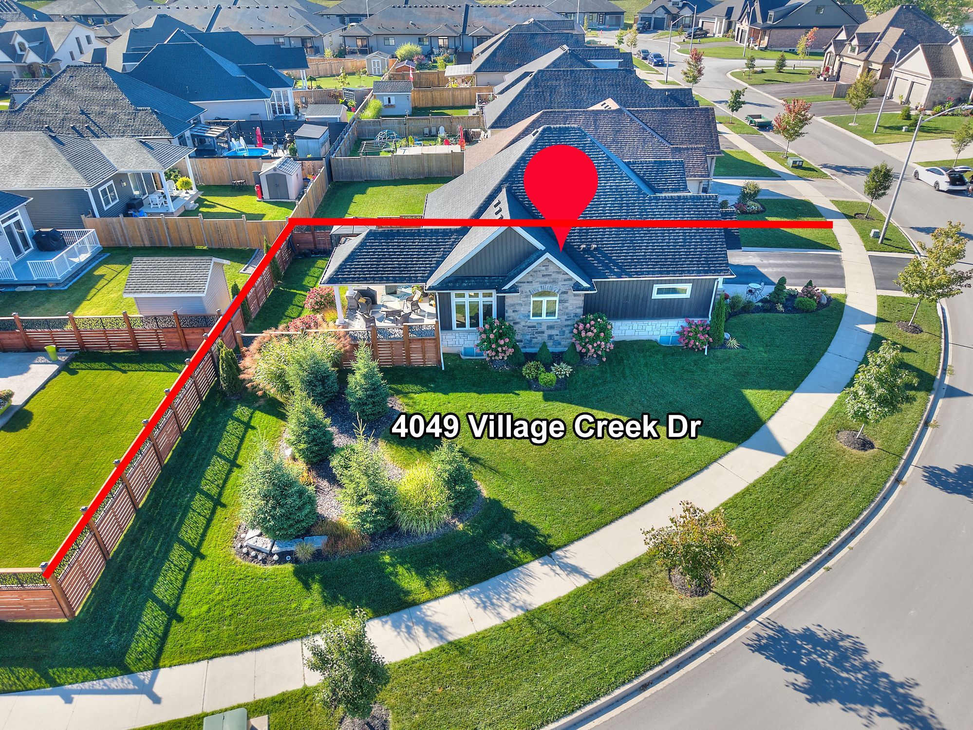 Welcome to 4049 village creek trail. This picturesque 8-year-old bungalow is set on a beautifully landscaped corner lot in one of stevensville's most sought-after communities. This striking home catches the eye with its timeless curb appeal, featuring stone and vertical siding, rich colour contrasts, wood grain textures, and bold front pillars. The lush, rounded lot is surrounded by manicured lawns and perennial gardens, creating a peaceful, private retreat. Step into the backyard and discover multiple areas designed for relaxation and entertaining, including a 15' x 11' covered concrete deck, a spacious 26'6" x 13' concrete patio, and a 6-seat hot tub with a gazebo perfect for enjoying warm summer nights or crisp fall evenings. Inside the open-concept great room is bright and inviting, featuring engineered hardwood floors, vaulted ceilings, quartz countertops, and a gas fireplace with an elegant surround. The kitchen includes a centre island with breakfast bar seating, stainless steel appliances, and sliding doors leading directly to the back deck. The main floor features a primary bedroom complete with a walk-in closet and 4-piece ensuite, plus a second bedroom with ensuite privilege to the main 3-piece bath. The finished basement expands the living space with a cozy recroom, a third bedroom, a 3-piece bathroom, a functional office area, plus plenty of room for storage. Ideally located just a short walk from stevensville mini park and the conservation club, where you can enjoy walking trails, nature views, and fishing. This home is a true balance of comfort, style, and nature. Whether you're relaxing indoors or entertaining outdoors, 4049 village creek trail offers the lifestyle you've been waiting for.