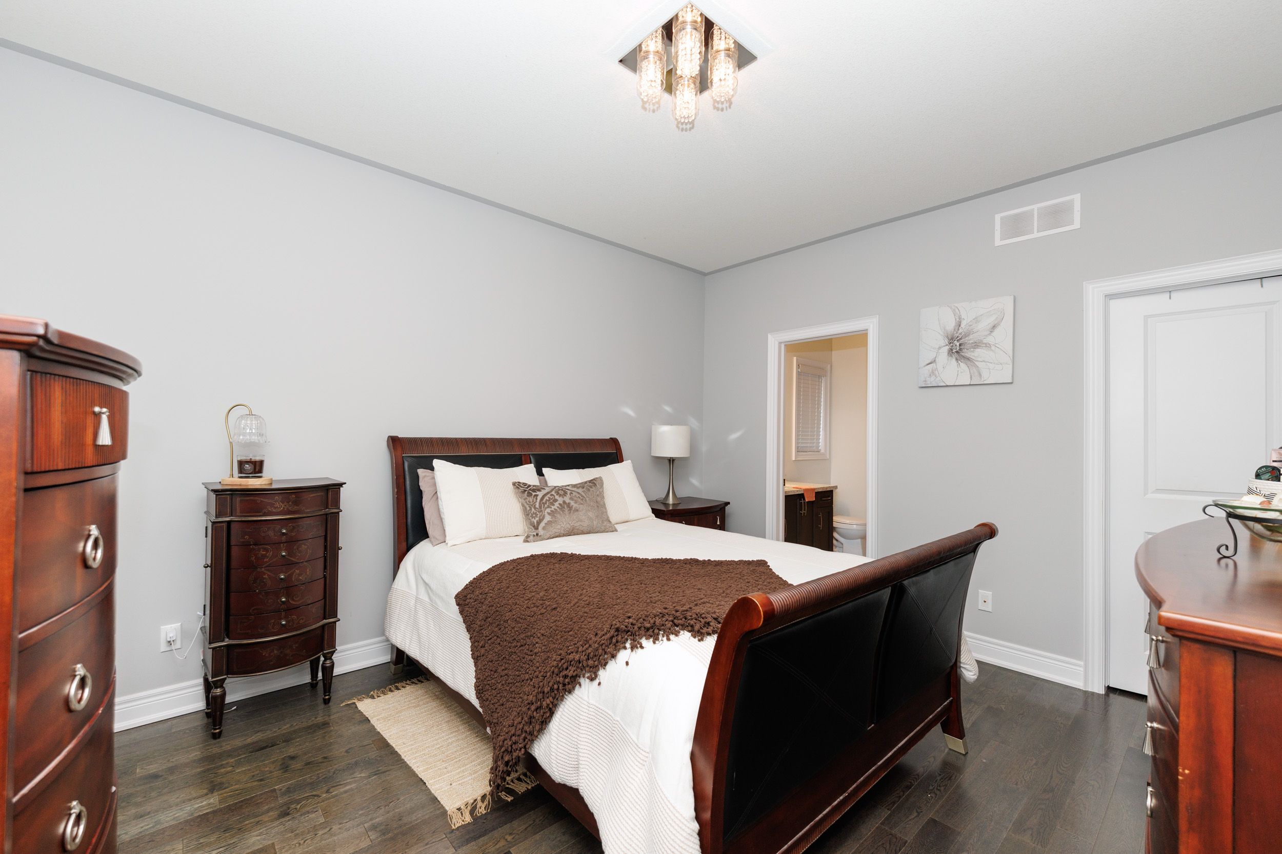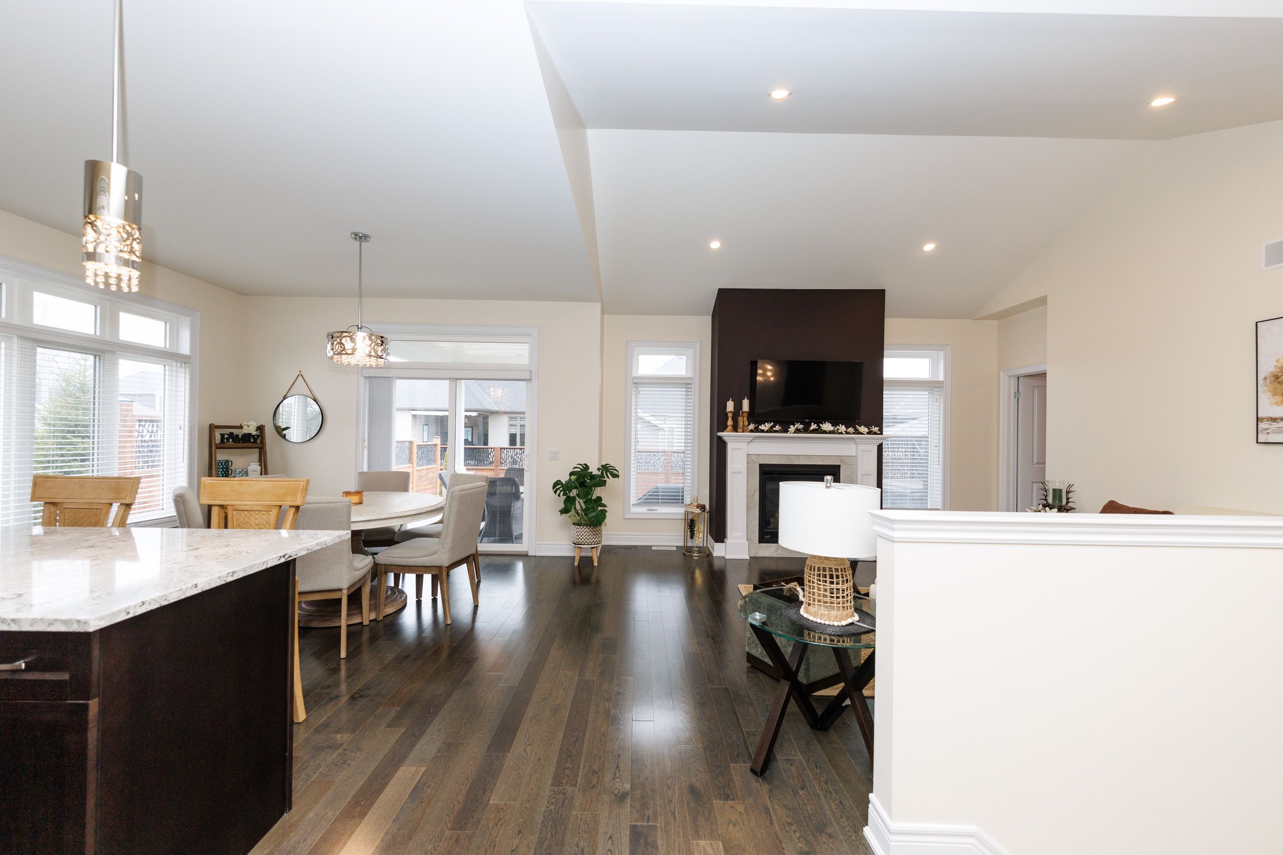 • Bright open-concept great room with hardwood floors and vaulted ceilings.