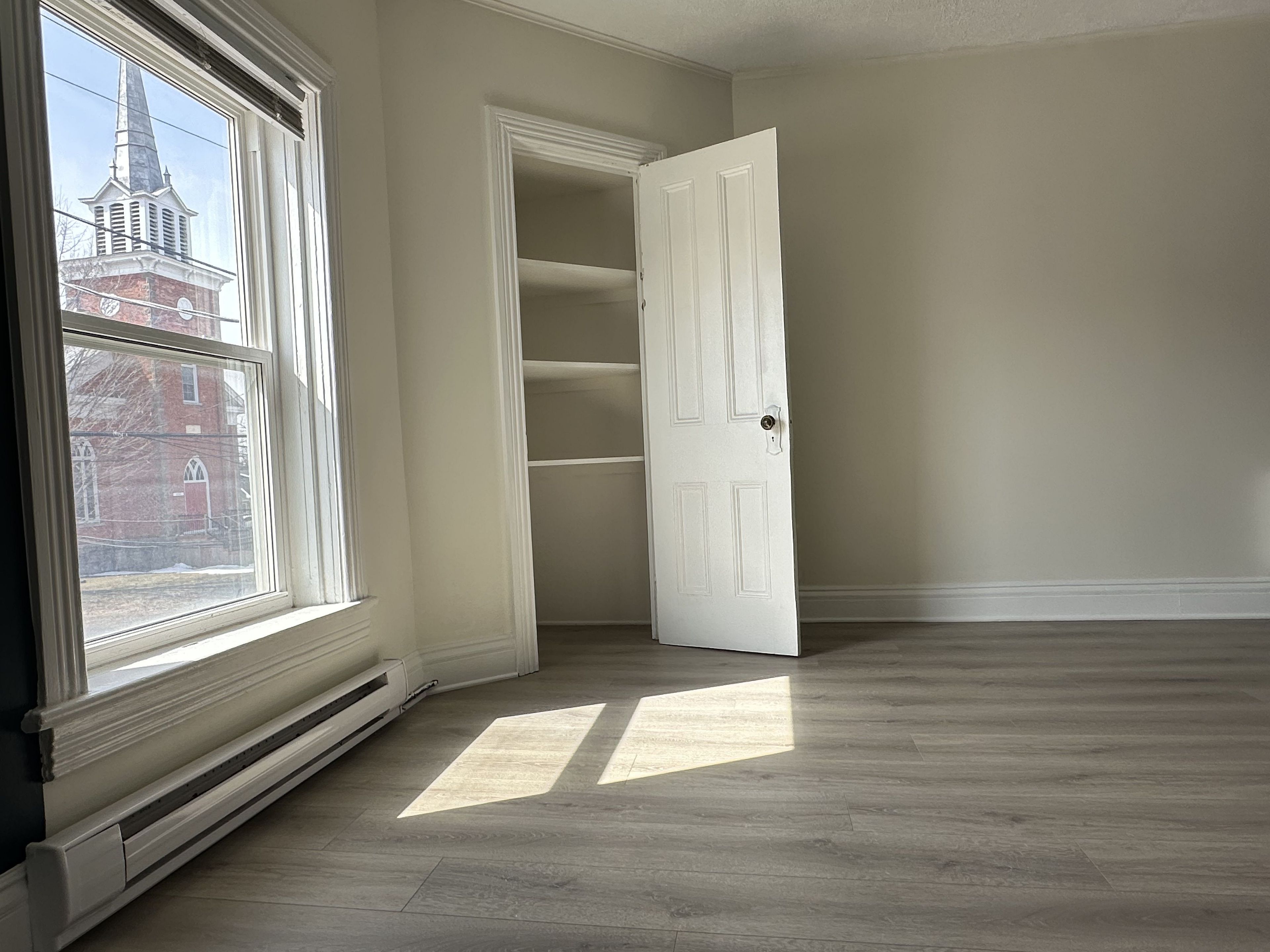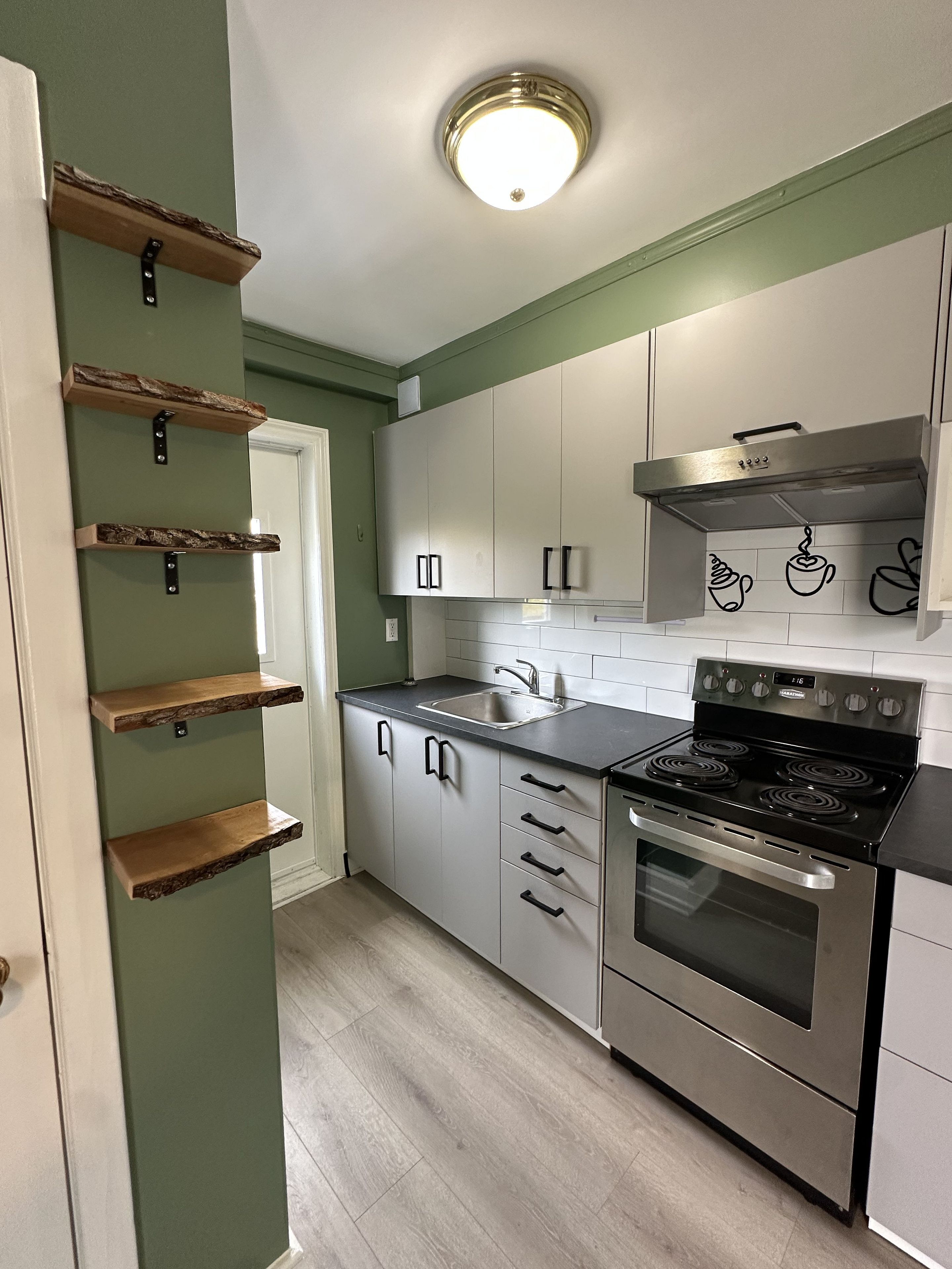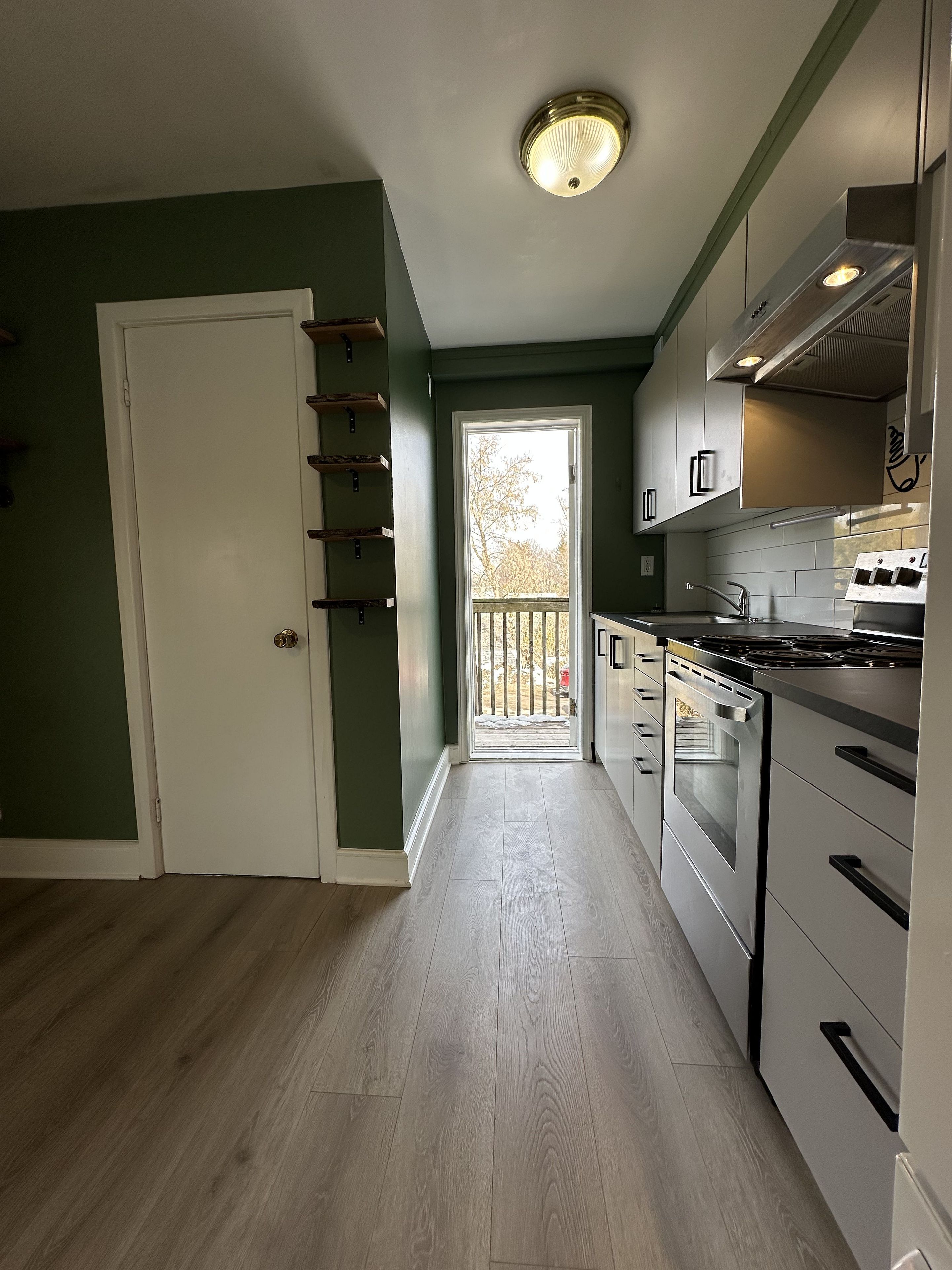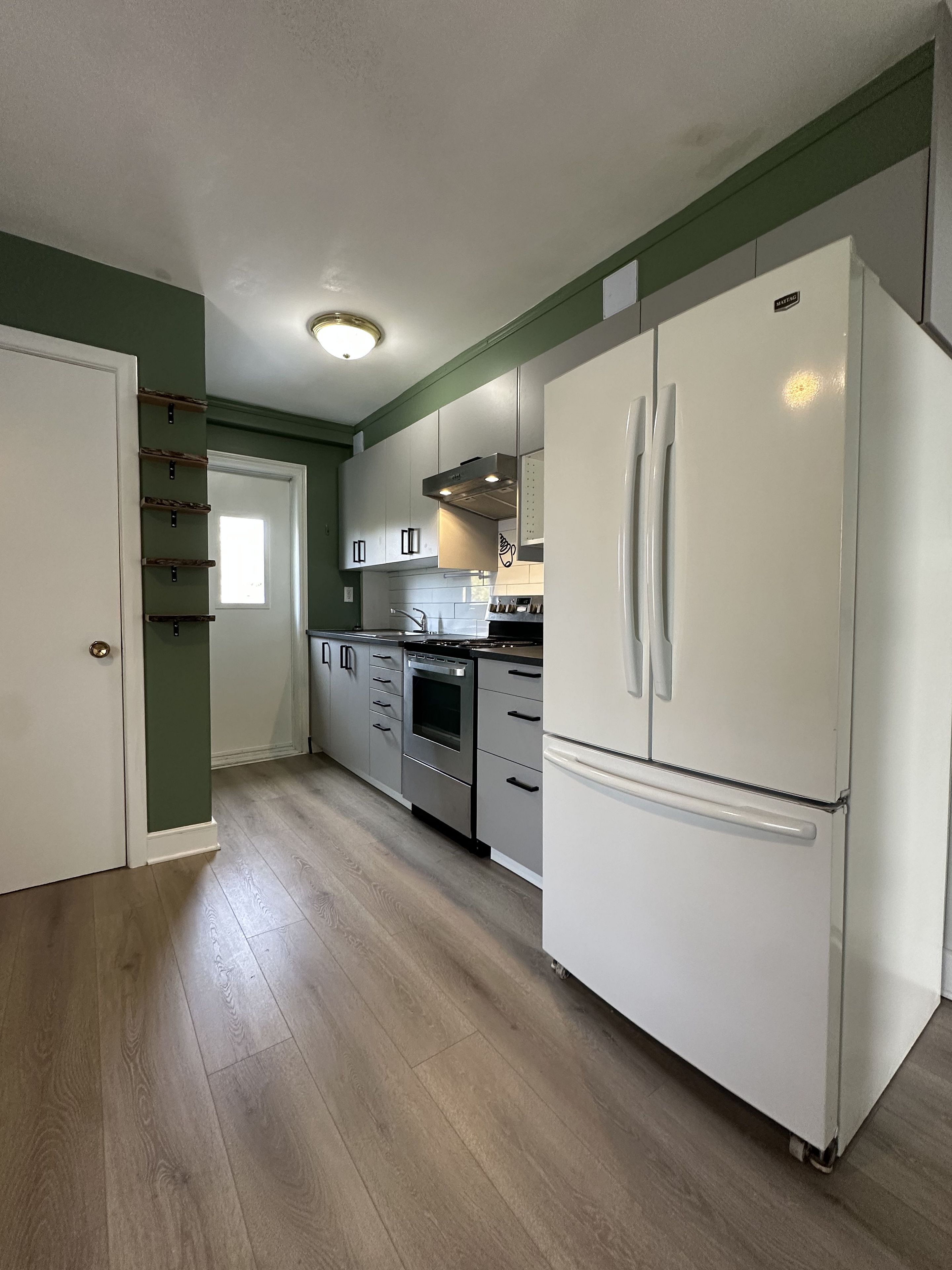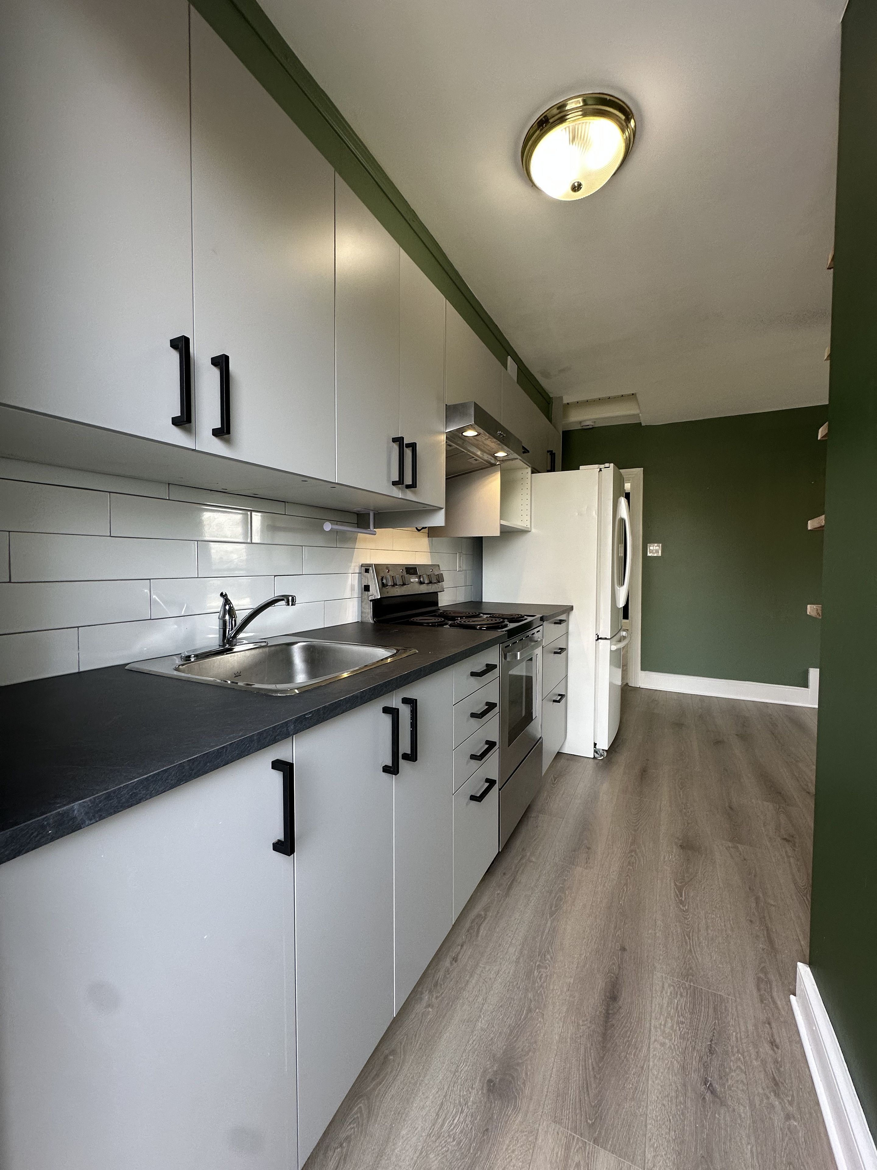 Step into character and comfort with this charming and beautifully maintained one-bedroom upper-level apartment nestled in a century-old fourplex in historic old town kemptville. This unique unit blends vintage charm with a fresh, modern twist. In this unique layout, everything you need is at your fingertips! The living room is full of personality, showcasing rich dark green tones and a botanical-inspired theme, complete with built-in live-edge wood shelving-perfect for books, plants, or curated décor. The spacious bedroom offers plenty of room to unwind, and includes a walk-in closet and a large built-in corner shelf. The galley kitchen is designed to provide ample cupboard space, full-size fridge and stove, in a well thought-out footprint within this combined living and dining space. A compact bathroom completes the home, with a shower, pedestal sink, and convenient built-in shelves for towels and toiletries. Large windows flood the bedroom and living room with natural light and offer picturesque views of old kemptville's charming streetscape and nearby church steeples. Enjoy the convenience of a private entrance from the rear parking area leading up to your space. Walk to the library, grocery stores, shopping, local parks, schools, and the vibrant restaurants and nightlife along prescott and clothier street. Easy access to highway 416, kemptville is a convenient 30-minute commute to ottawa or brockville, located in the heart of north grenville along the historic rideau canal river system. Employment letter with income, references and credit check required.