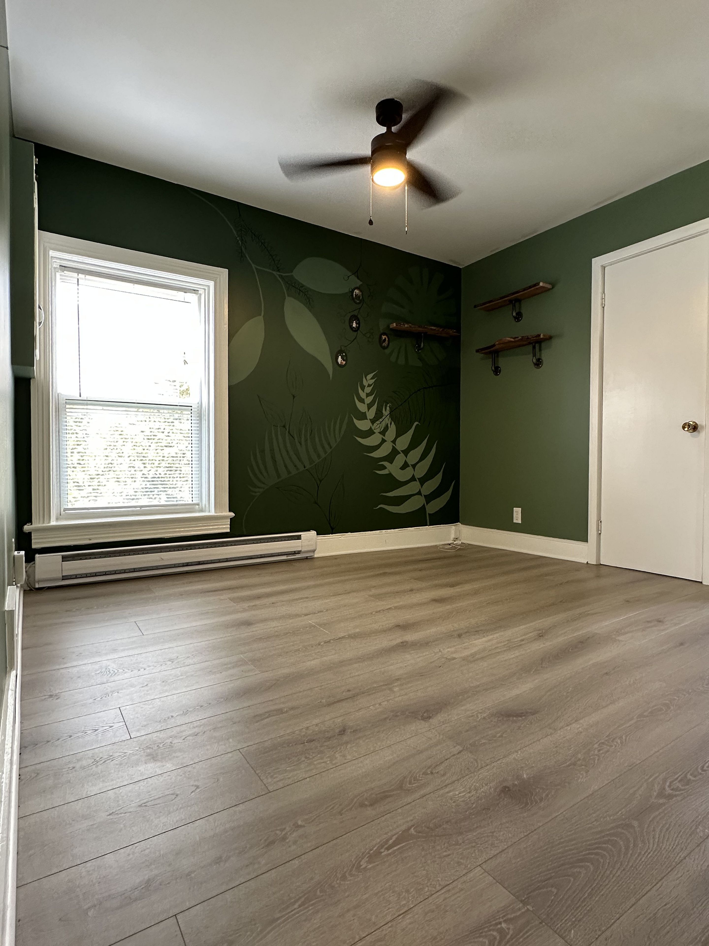 • Spacious bedroom with a walk-in closet and built-in corner shelf.