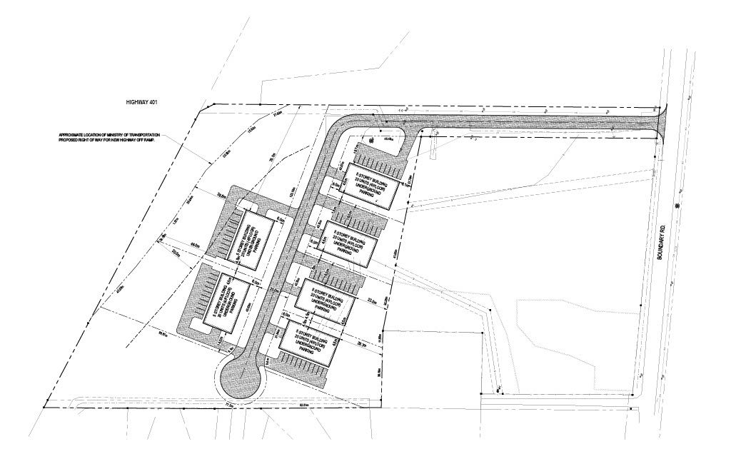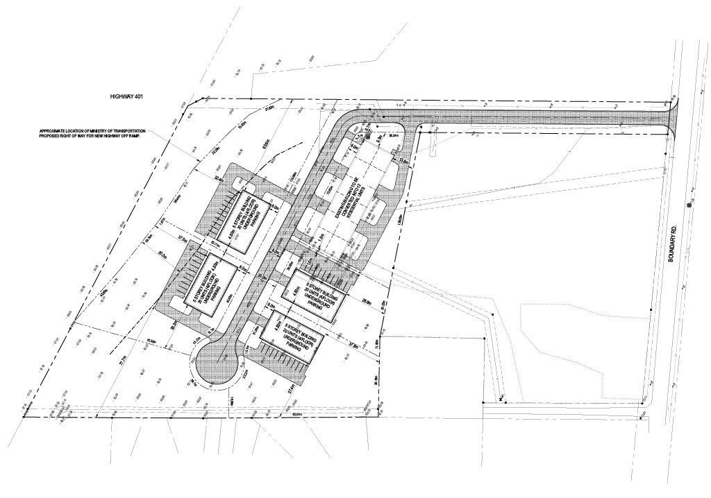 The subject property is a 3. 84 ha site at 405 tollgate rd. Just west of mcconnell ave at the hwy 401 interchange. Zoning is res 20. The proposal as prepared calls for the construction of 4 x 20 unit residential apartments buildings each with underground parking and the redevelopment of an existing building to be converted to house an additional 12 residential row house units. The proposal calls for the site to be fully serviced. Included with the offering are the concept plans, together with a preliminary site plan development proposal prepared by evb engineering and grant marion construction that includes, topographic mapping, preliminary site servicing requirements, run off and storm water storage requirements, an earlier class d site servicing cost and a list of municipal planning requirements is available. Currently there is a large storage building on site that is shown as being retrofitted for residential purposes. This light warehouse/office building is currently used for storage and office use. It is complete with washrooms and is heated and partially air-conditioned. There is a smaller frame building that is attached to the warehouse on site.