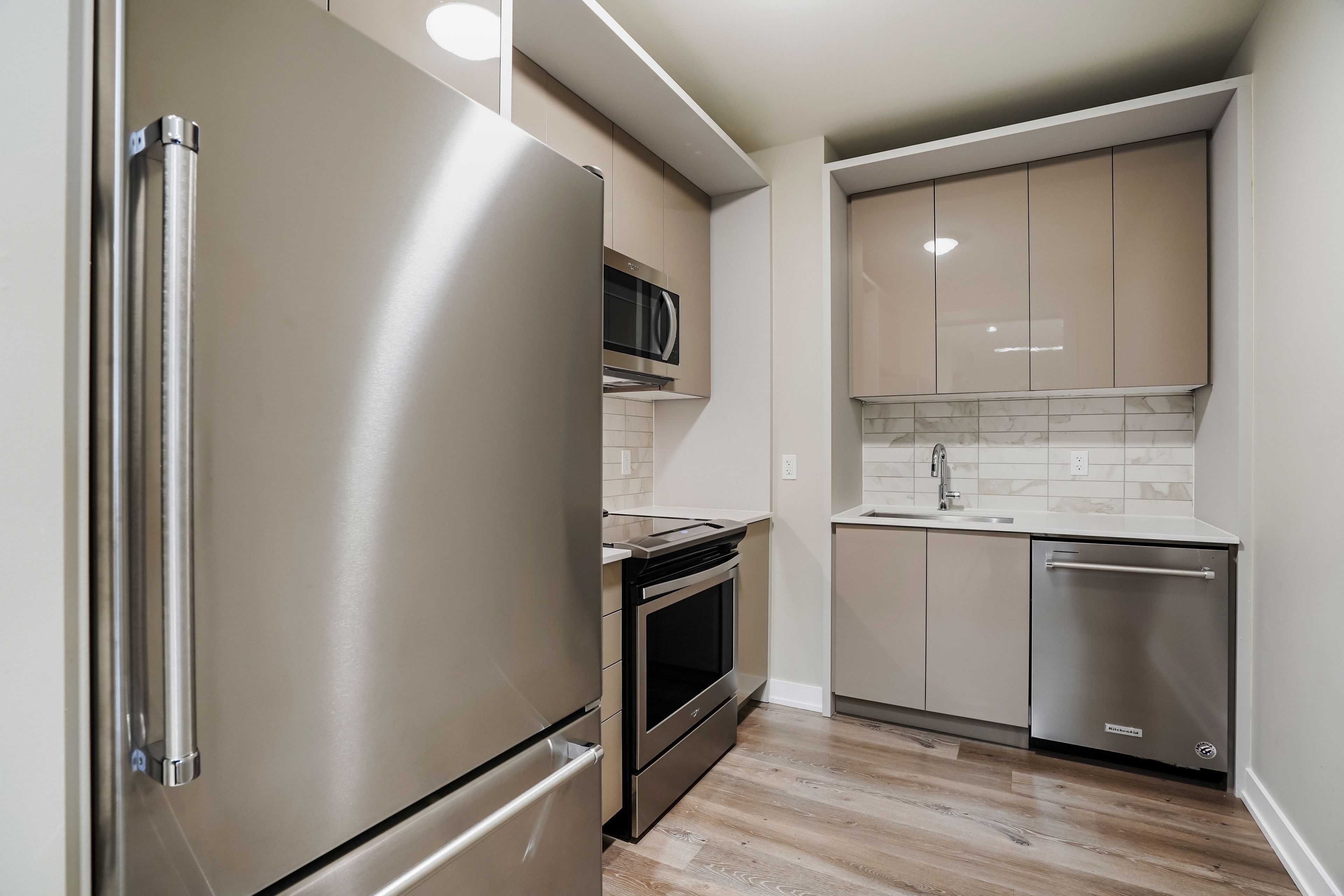 • Sleek kitchen featuring stainless-steel appliances and quartz counters.