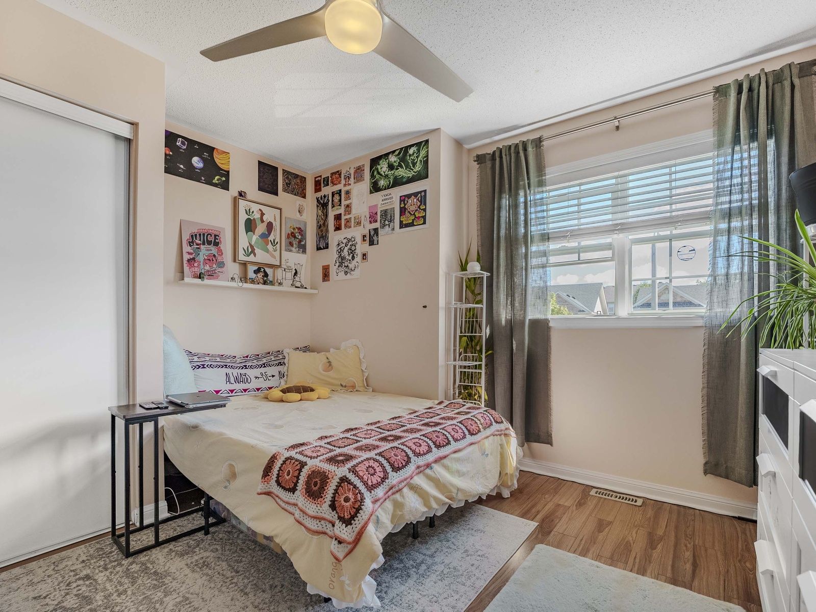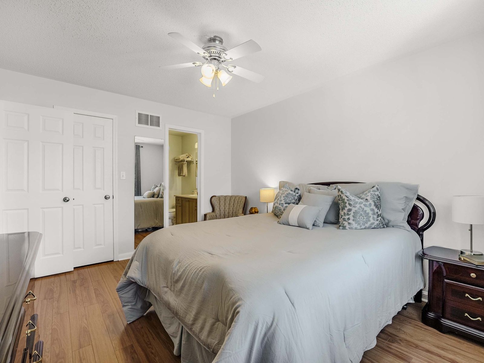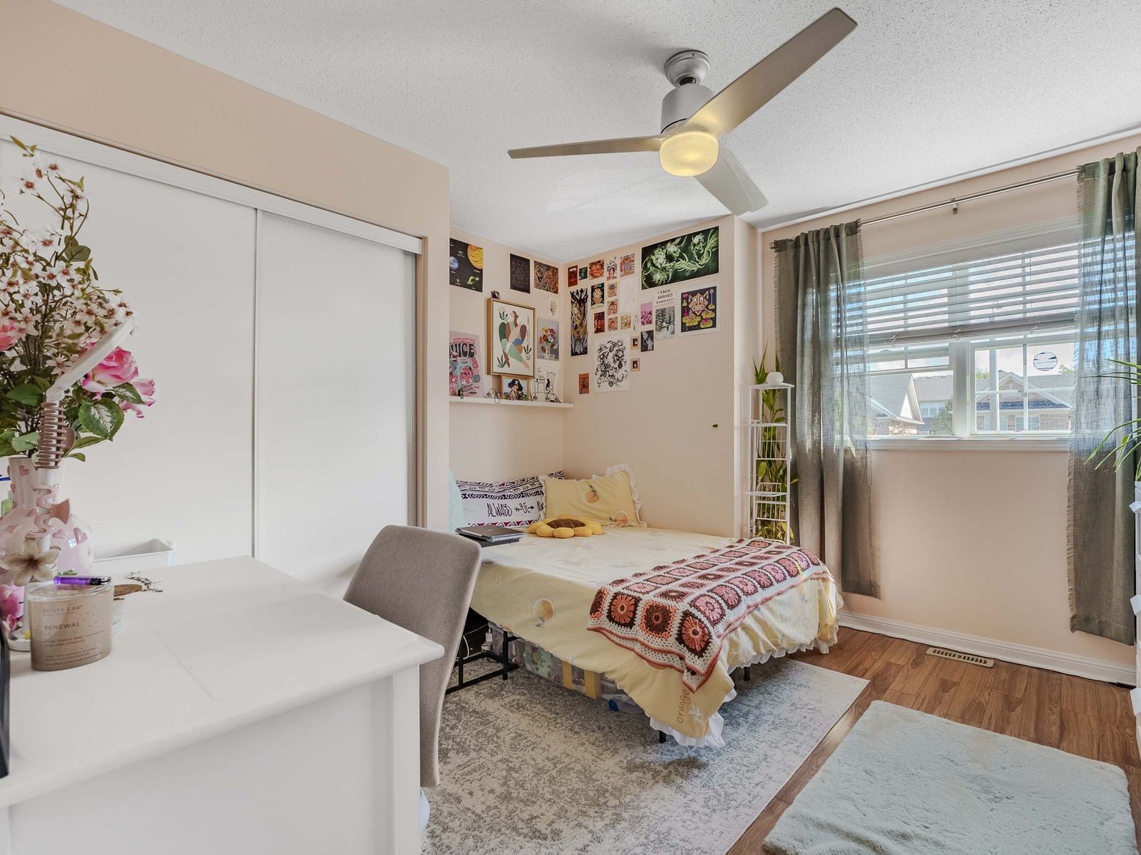 • Spacious bedrooms with custom closet organizers and ceiling fans.