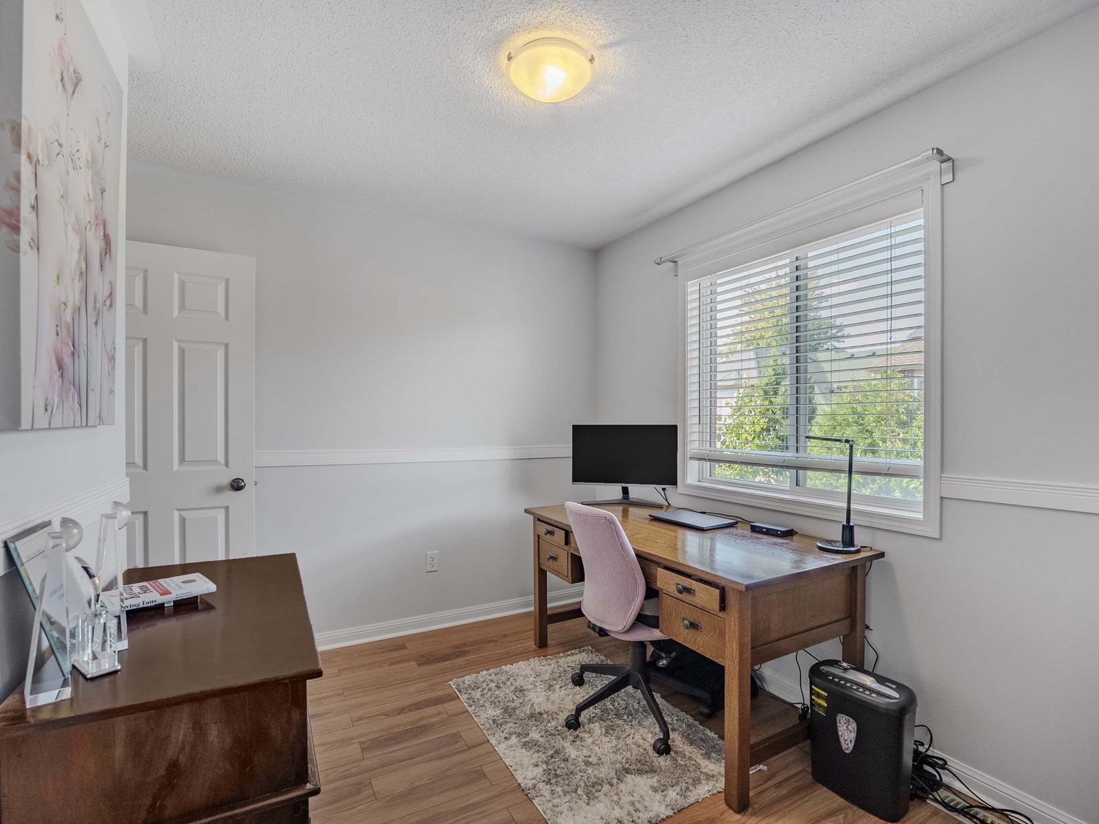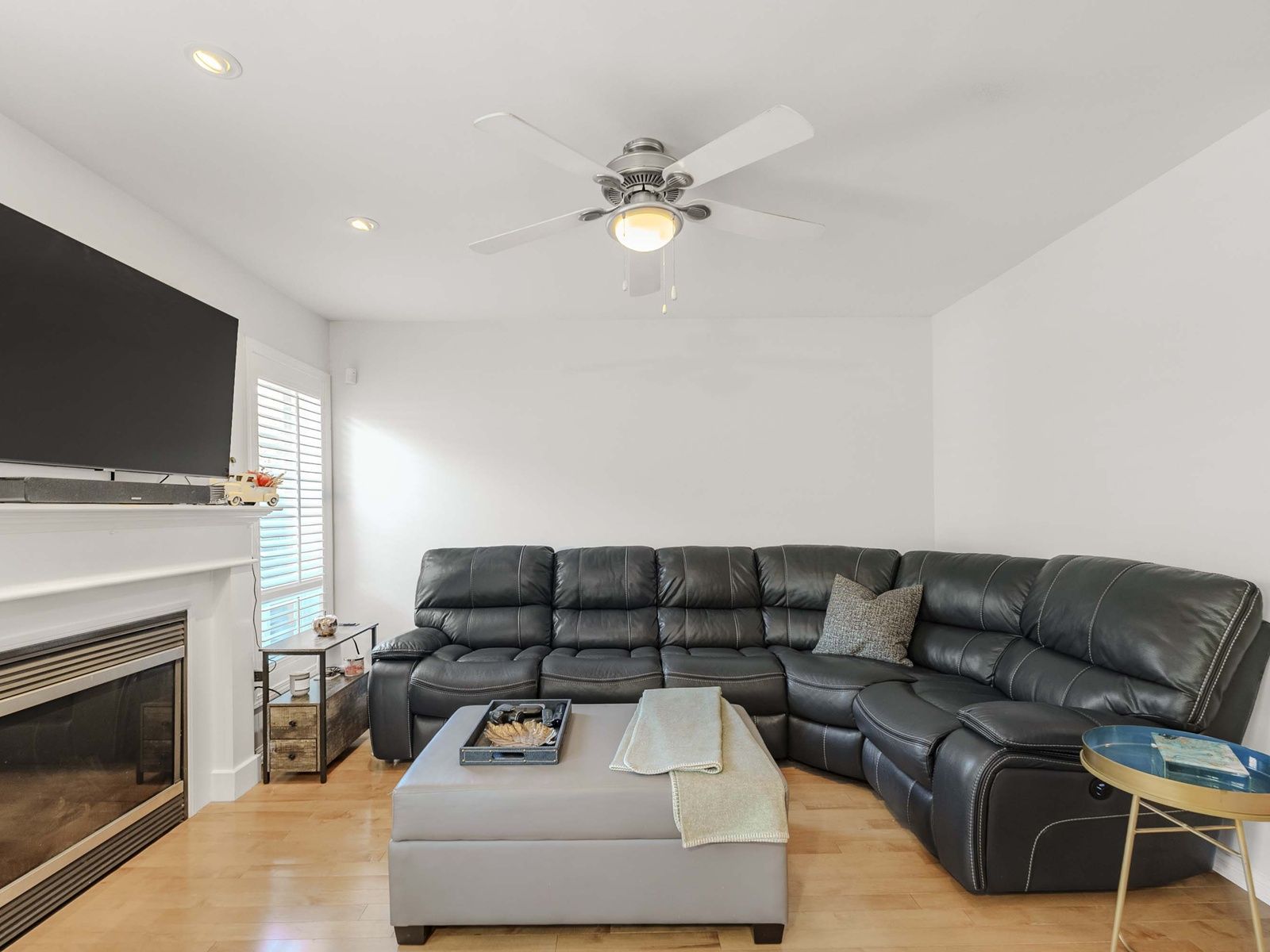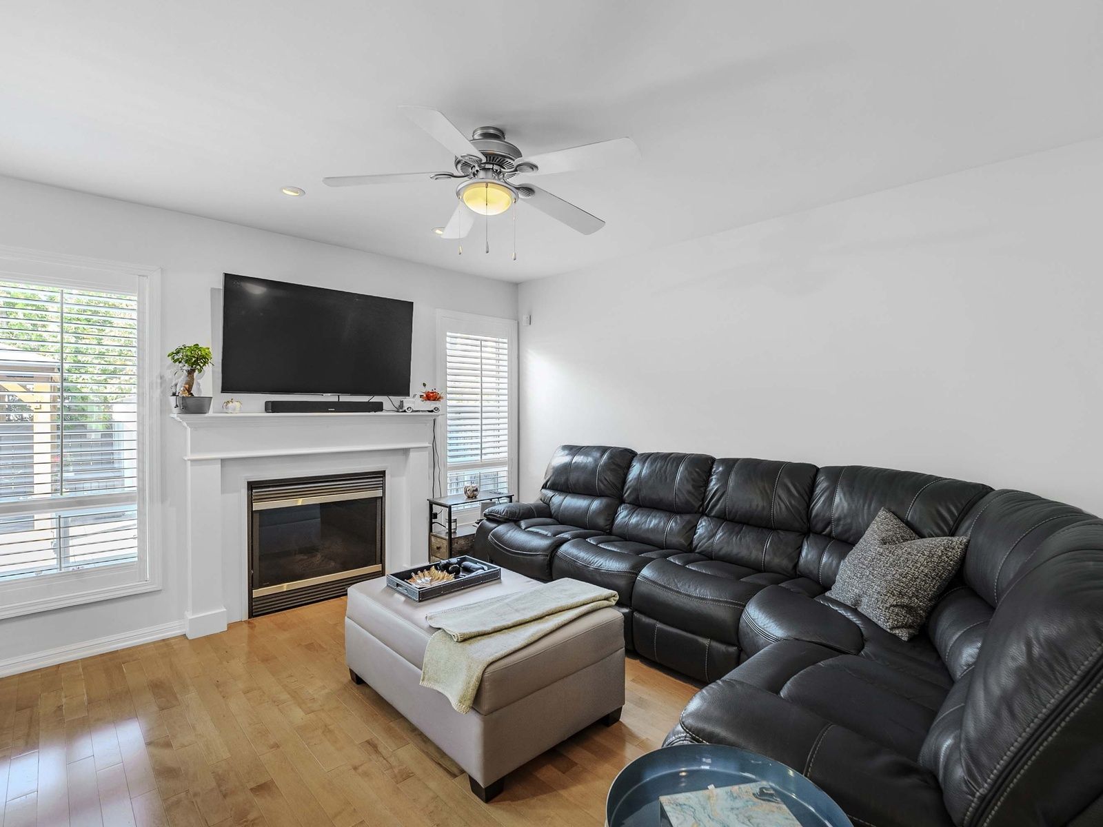 • Spacious bedrooms with custom closet organizers and ceiling fans.