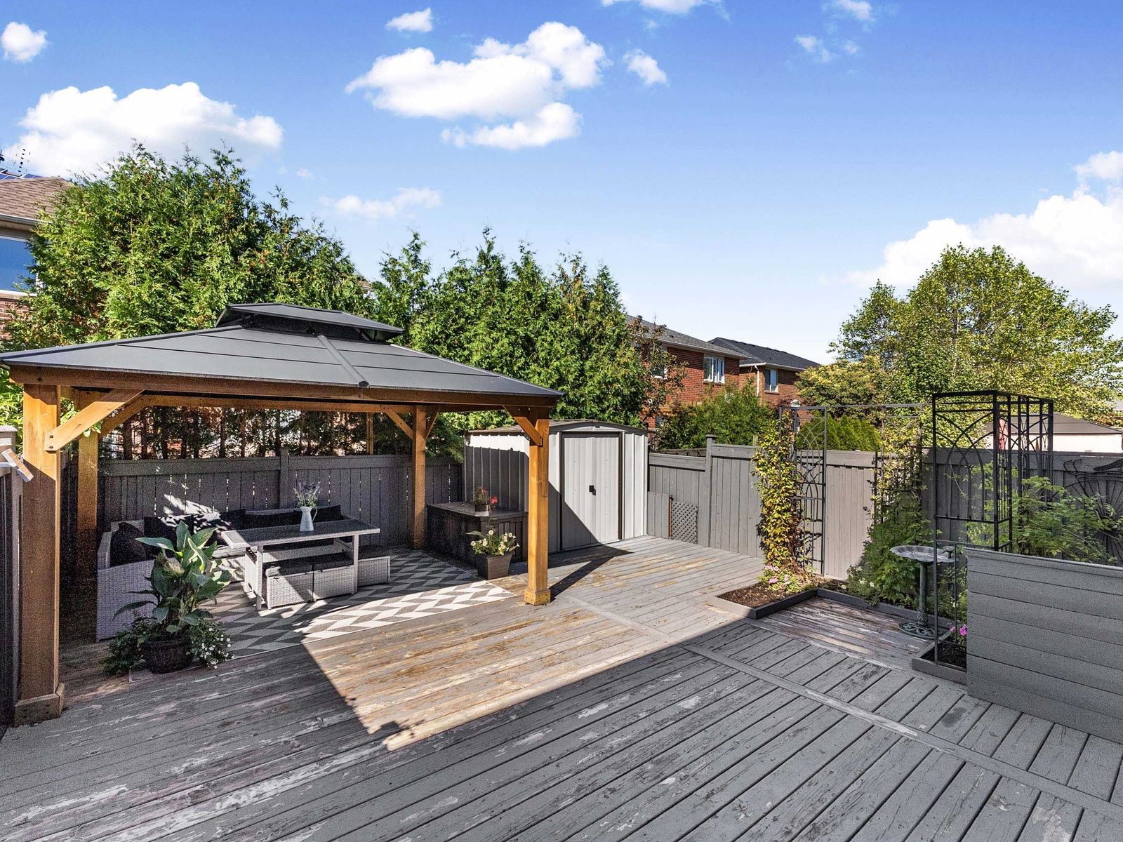 Nestled in the heart of alton village, this beautifully upgraded freehold townhome offers comfort, style, and convenience just minutes from top-rated schools, parks, shopping, and transit. Featuring 3 bedrooms and 3. 5 bathrooms with stylish finishes throughout. The main level boasts hardwood flooring, california shutters, and a stunning kitchen with custom cabinetry, a large centre island with granite countertops, and stainless steel appliances. The family room with a cozy gas fireplace overlooks the kitchen and walks out to a private backyard with a wooden deck, gazebo, and garden shed, perfect for relaxing or entertaining. Upstairs offers 3 spacious bedrooms with ceiling fans and custom closet organizers, including a primary suite with an ensuite bath. The finished basement adds extra living space and features an upgraded full bathroom with designer tiles and a custom glass shower. Move-in ready and located in a highly desirable, family-friendly neighbourhood.