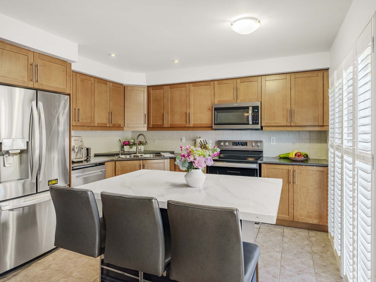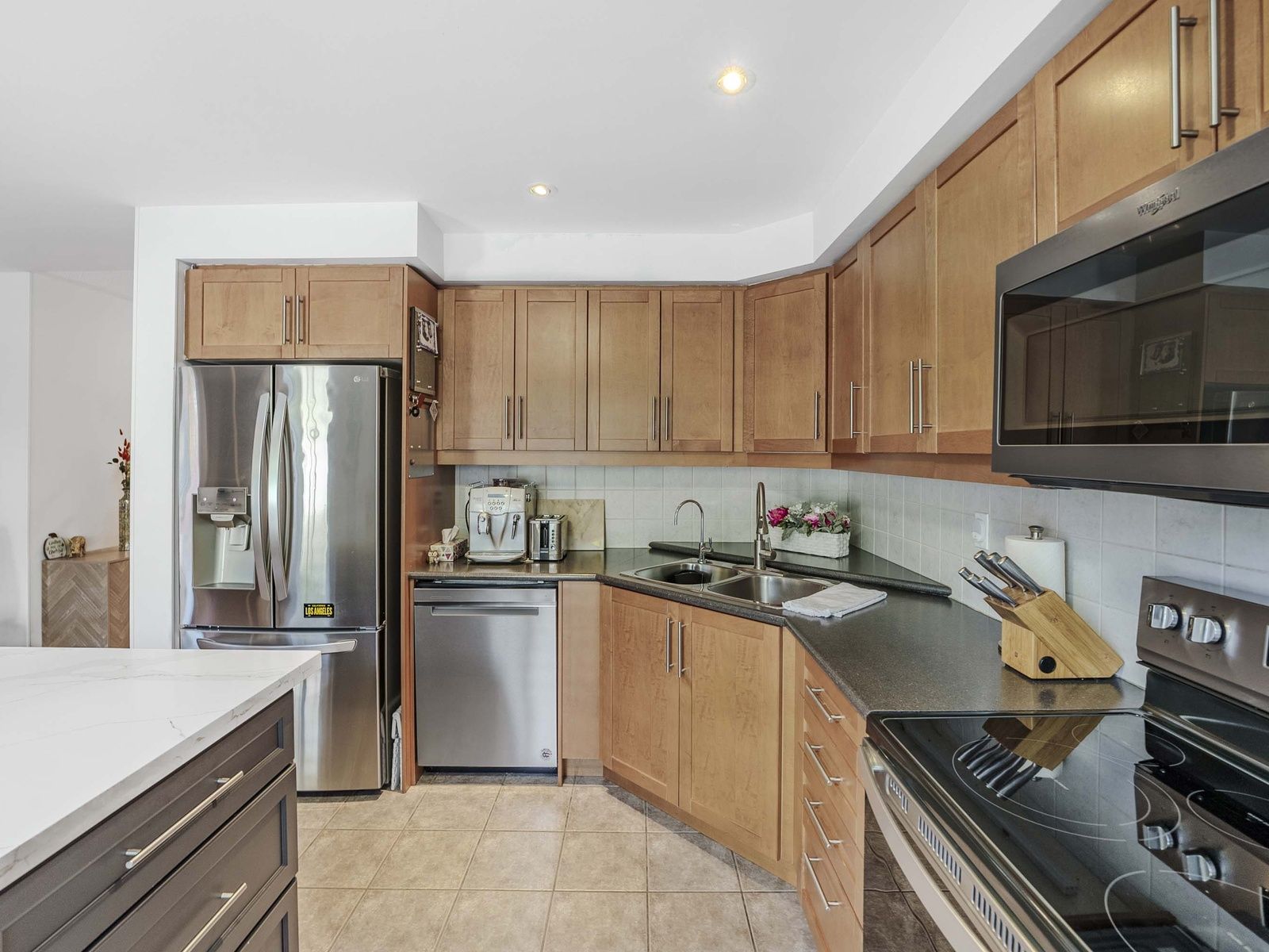 • Stylish kitchen with granite countertops and stainless steel appliances.