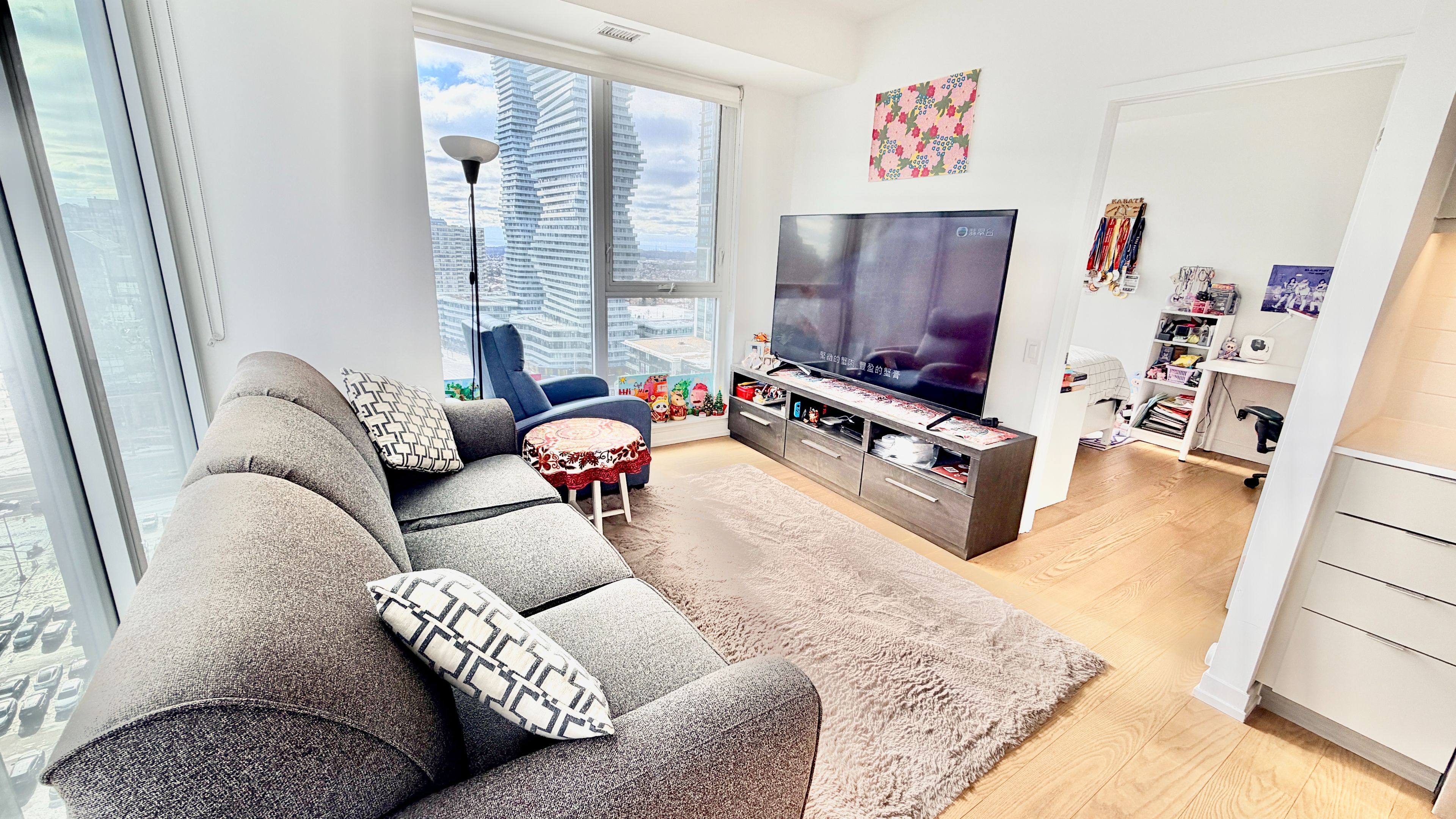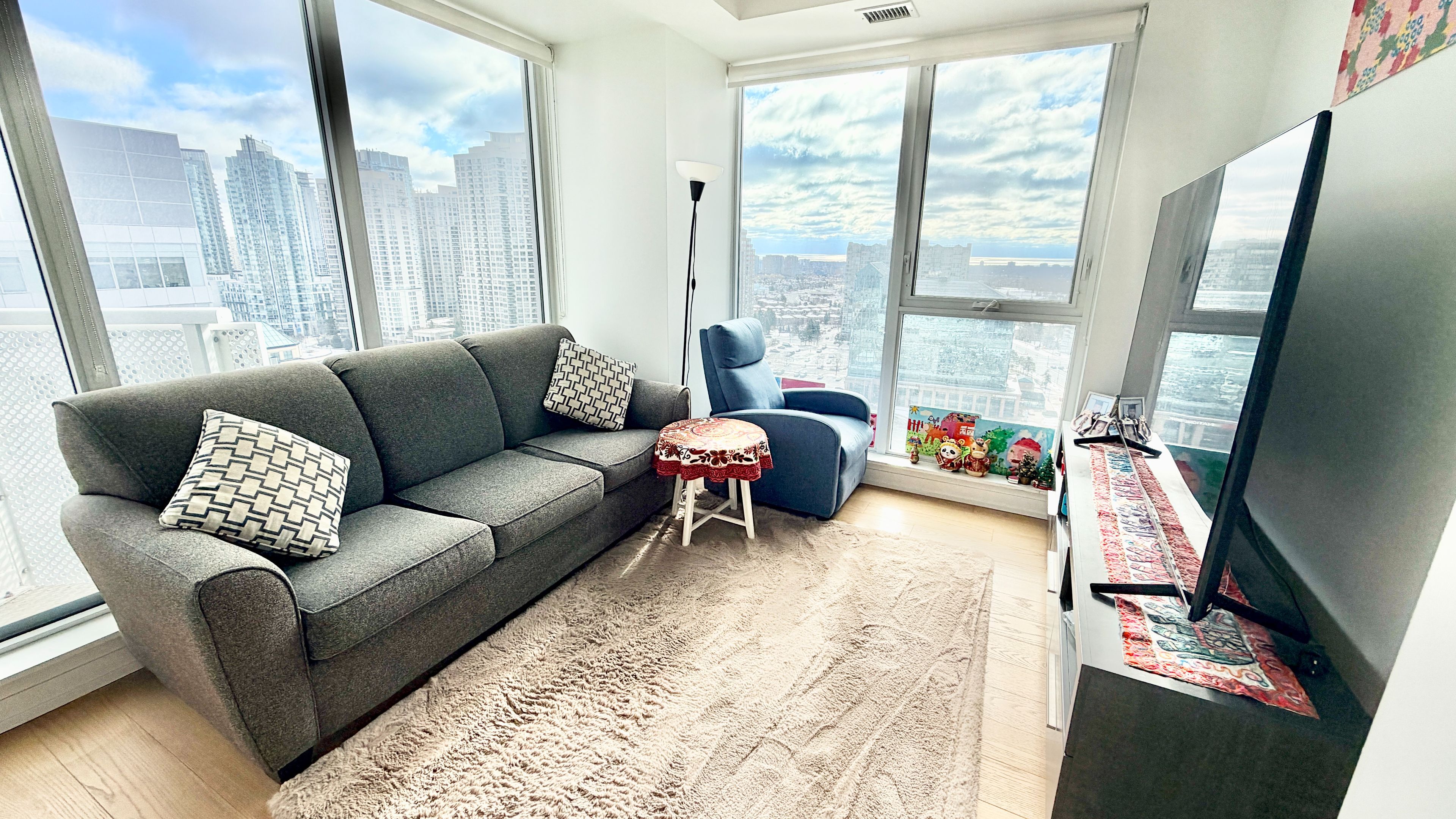 • Modern open concept living room with high ceilings and abundant natural light.