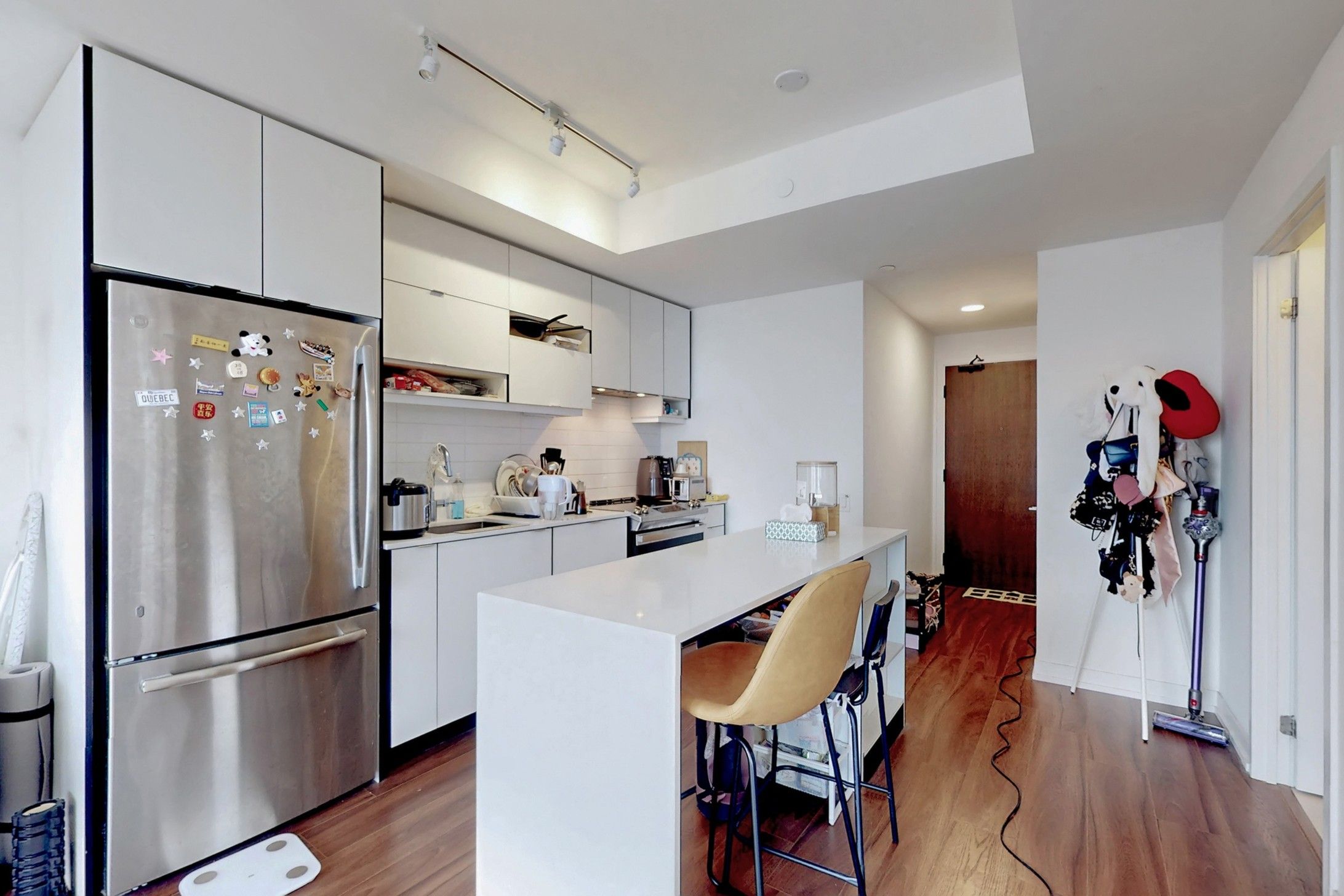 • Modern kitchen features stainless steel appliances and a kitchen island.