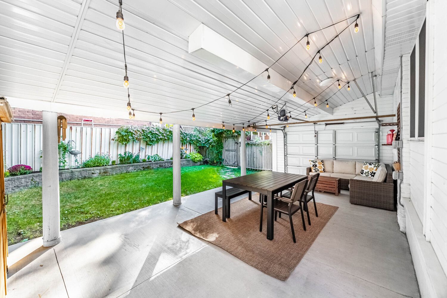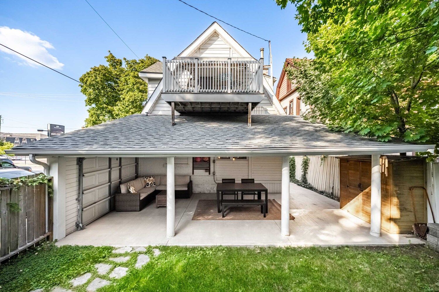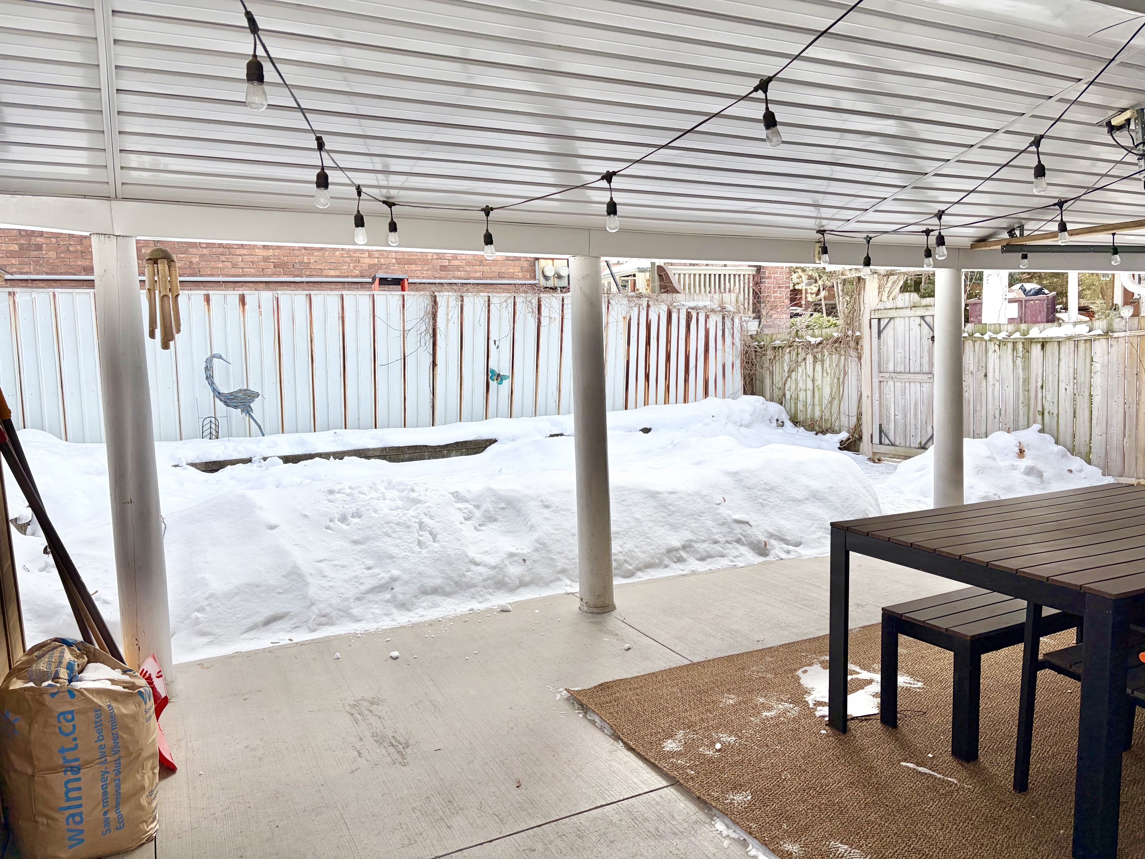 • Cozy yard features shaded overhang and low-maintenance garden.