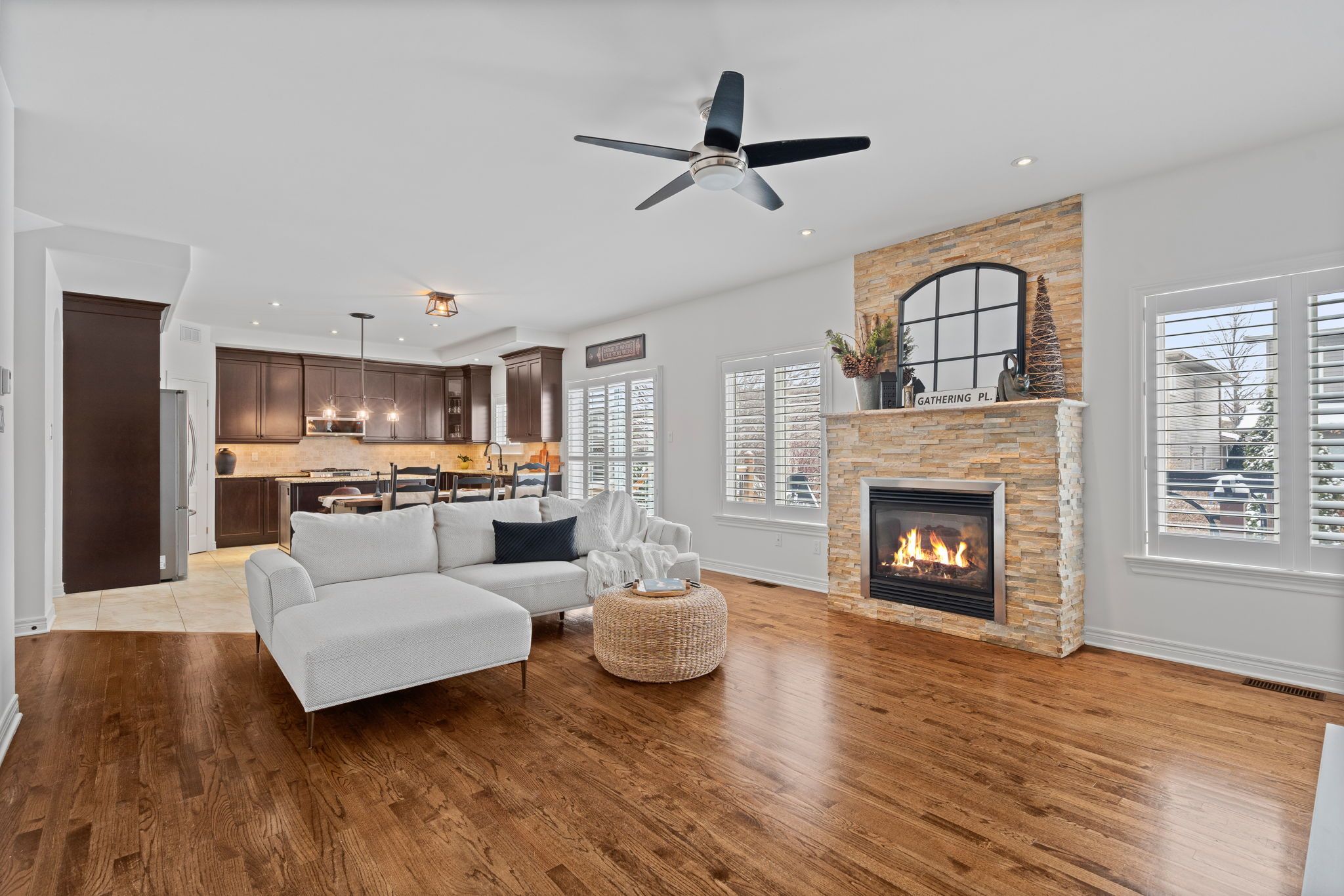 Situated on a quiet street in one of stittsville's most established and family-oriented communities, this beautifully upgraded 4-bedroom home, offers the space, quality, and privacy that is genuinely hard to find. Located minutes from top-rated schools, stittsville's main street, parks, recreation, and quick highway access, this neighbourhood delivers both lifestyle and long-term value. The full brick front sets the tone of craftsmanship and quality throughout the home. Step inside the welcoming foyer and notice the rich hardwood both on the main and upper levels, tying the home together with warmth and continuity. The layout is thoughtfully traditional with a dedicated main floor office and a formal family room open to the dining room, which gives this home a defined structure you will appreciate. The kitchen is well-proportioned featuring upgraded cabinetry, stainless steel appliances, granite counters, and a separate pantry. A spacious eat-in area has direct sightlines to the backyard oasis and into the main living area, where the gas fireplace anchors the room. Upstairs, four generously sized bedrooms offer flexibility for growing families, guests, or a second workspace. A primary retreat with 2 walk-in closets and an updated ensuite bath offering a separate soaker tub, glass shower, and double sinks. The fully finished basement expands the home considerably with a dedicated gym, movie, and games areas, making it a true extension of daily living, not just storage. The fully fenced backyard is beautifully landscaped, centred around the salt-water pool, and mature trees. The privacy of this outdoor space is rare in a neighbourhood setting. Enjoy minimal maintenance in the backyard; perfectly positioned with parks nearby for additional greenspace. This turn-key home features custom california shutters throughout, neutral paint colours, updated fixtures, and numerous upgrades. See attached feature sheet and upgrade sheet for more information.