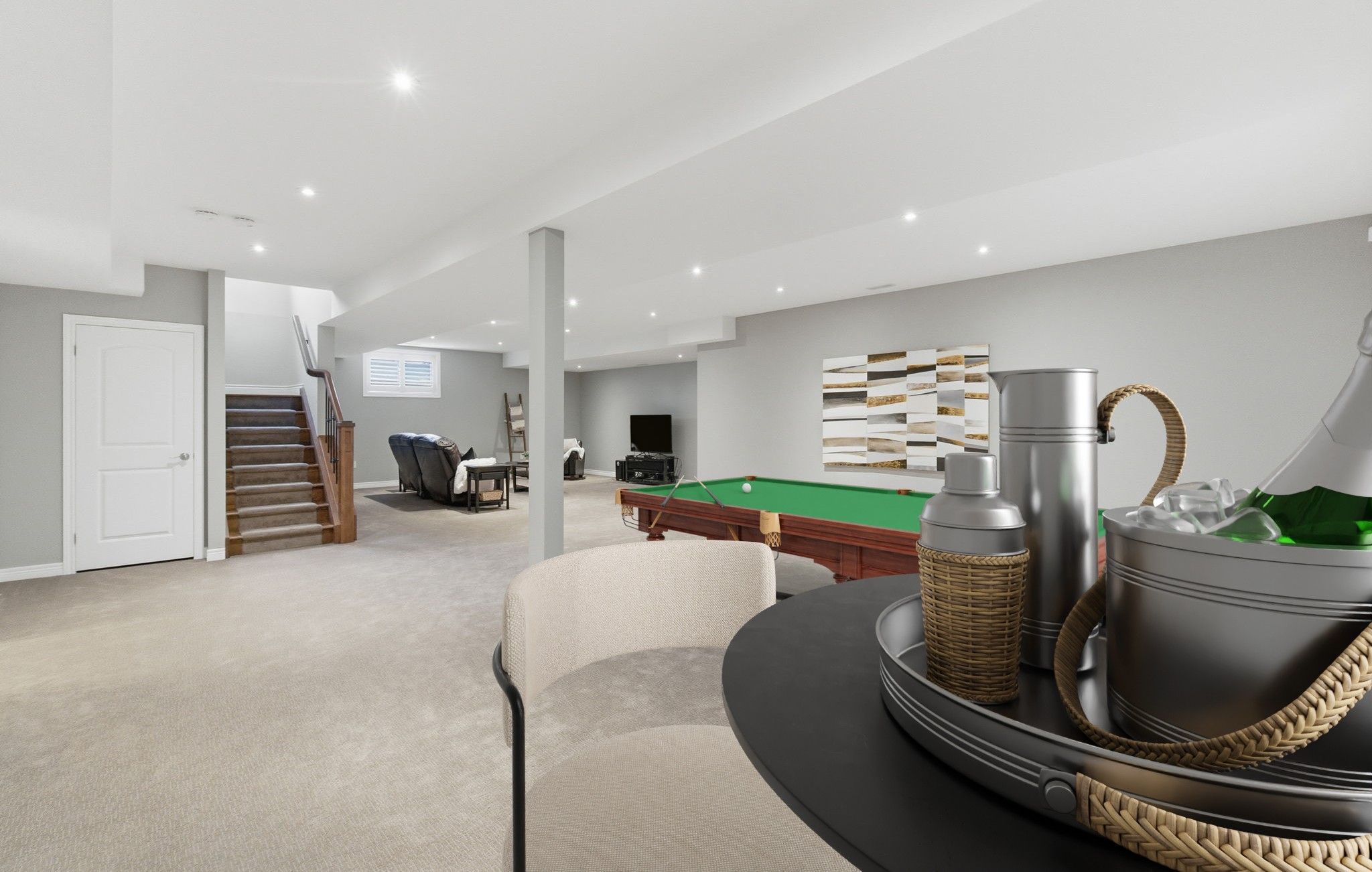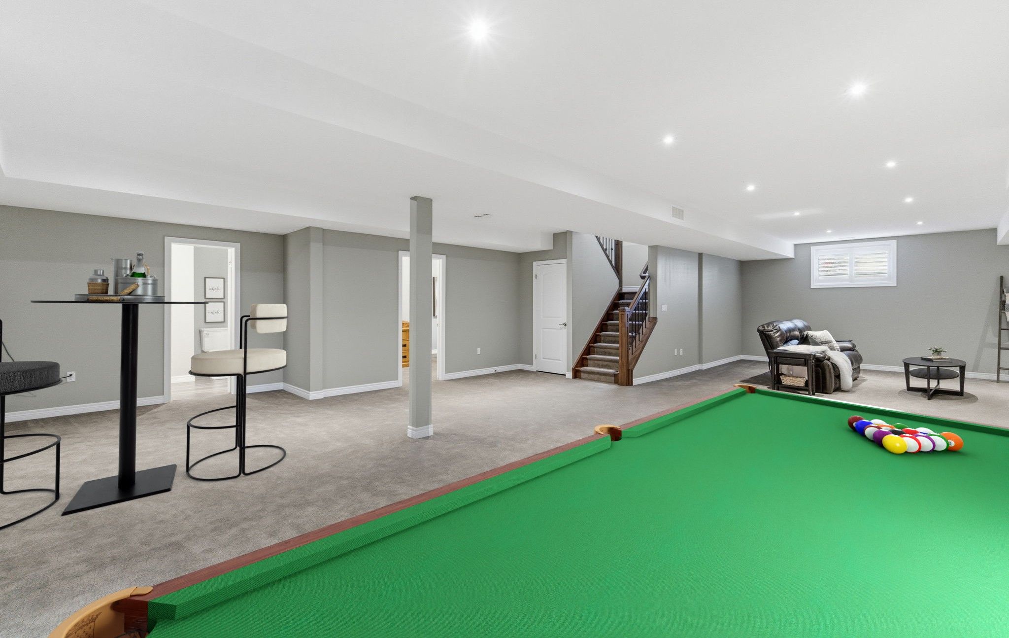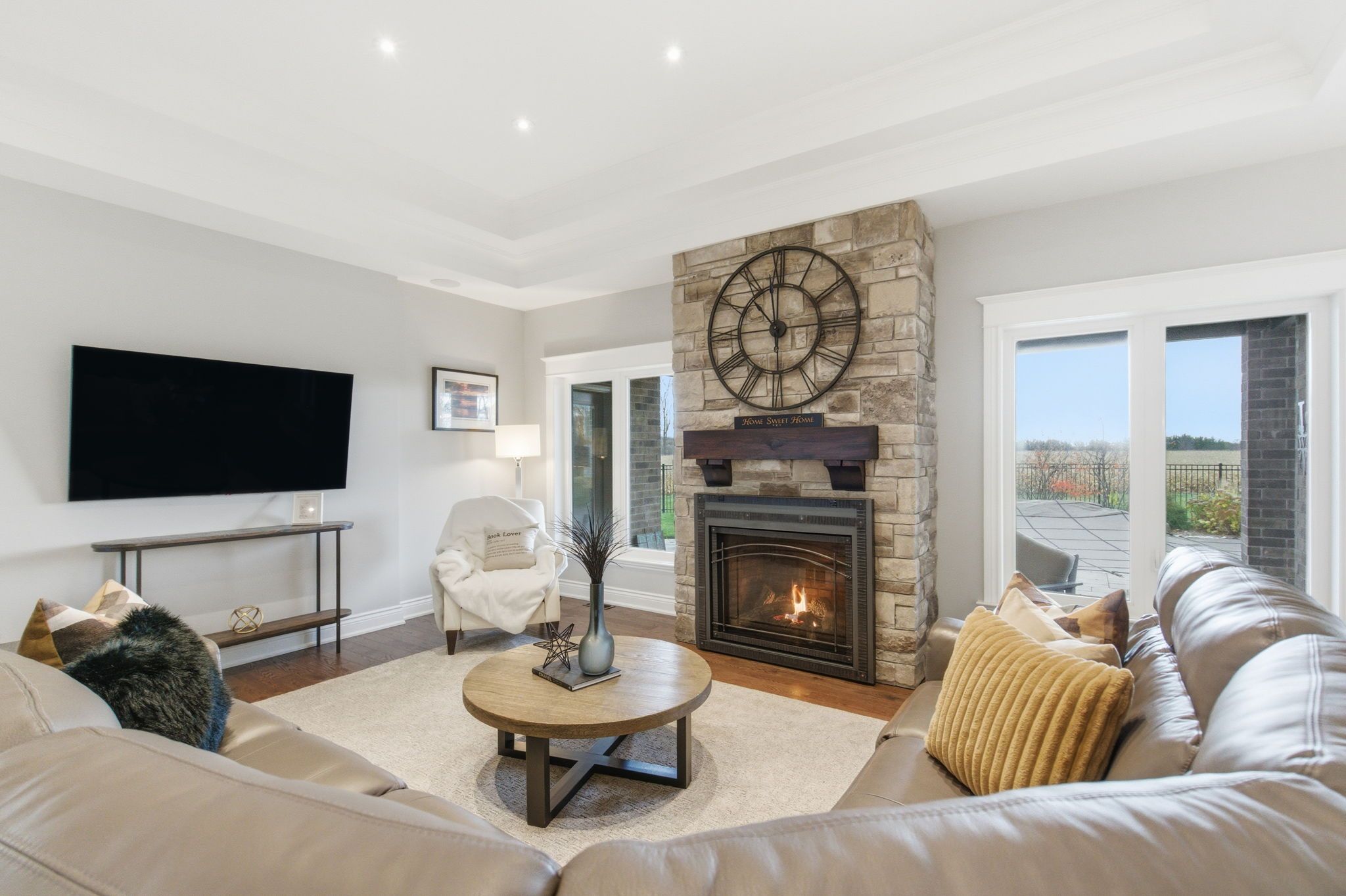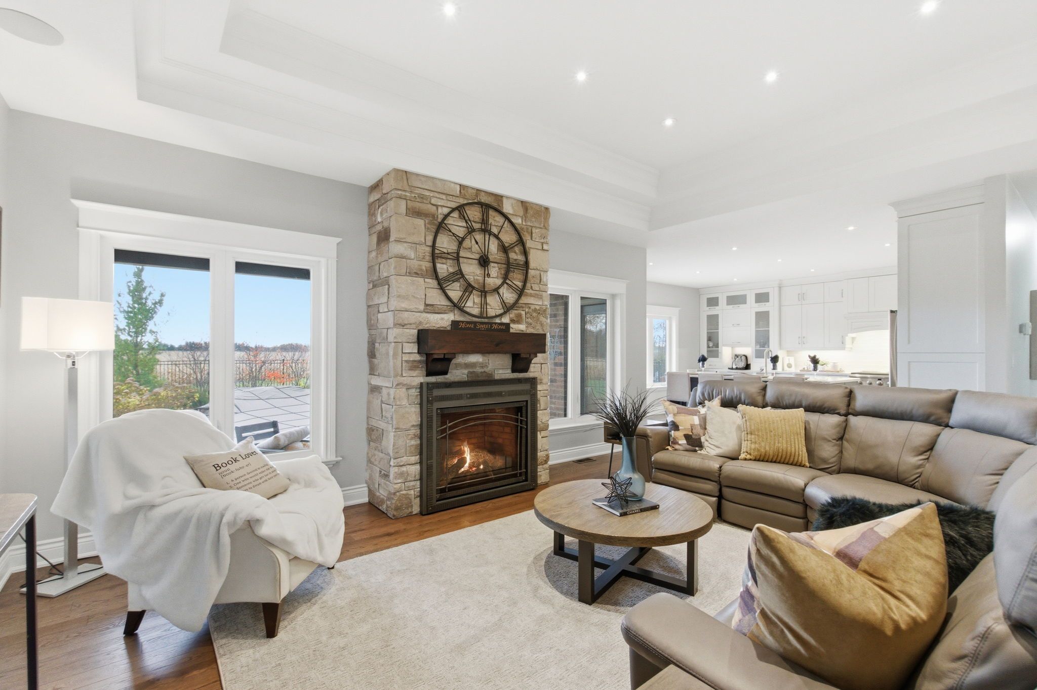 • Spacious open-concept design with gourmet kitchen and vaulted ceiling.