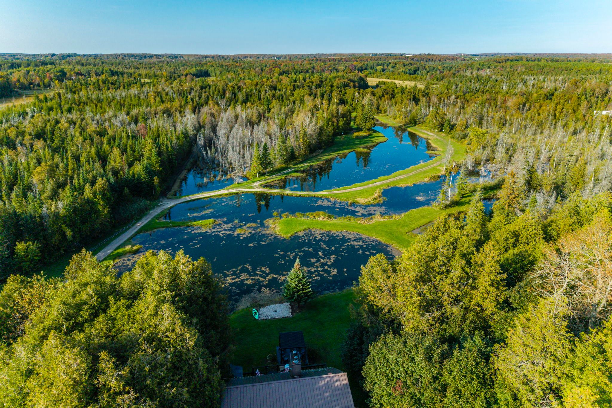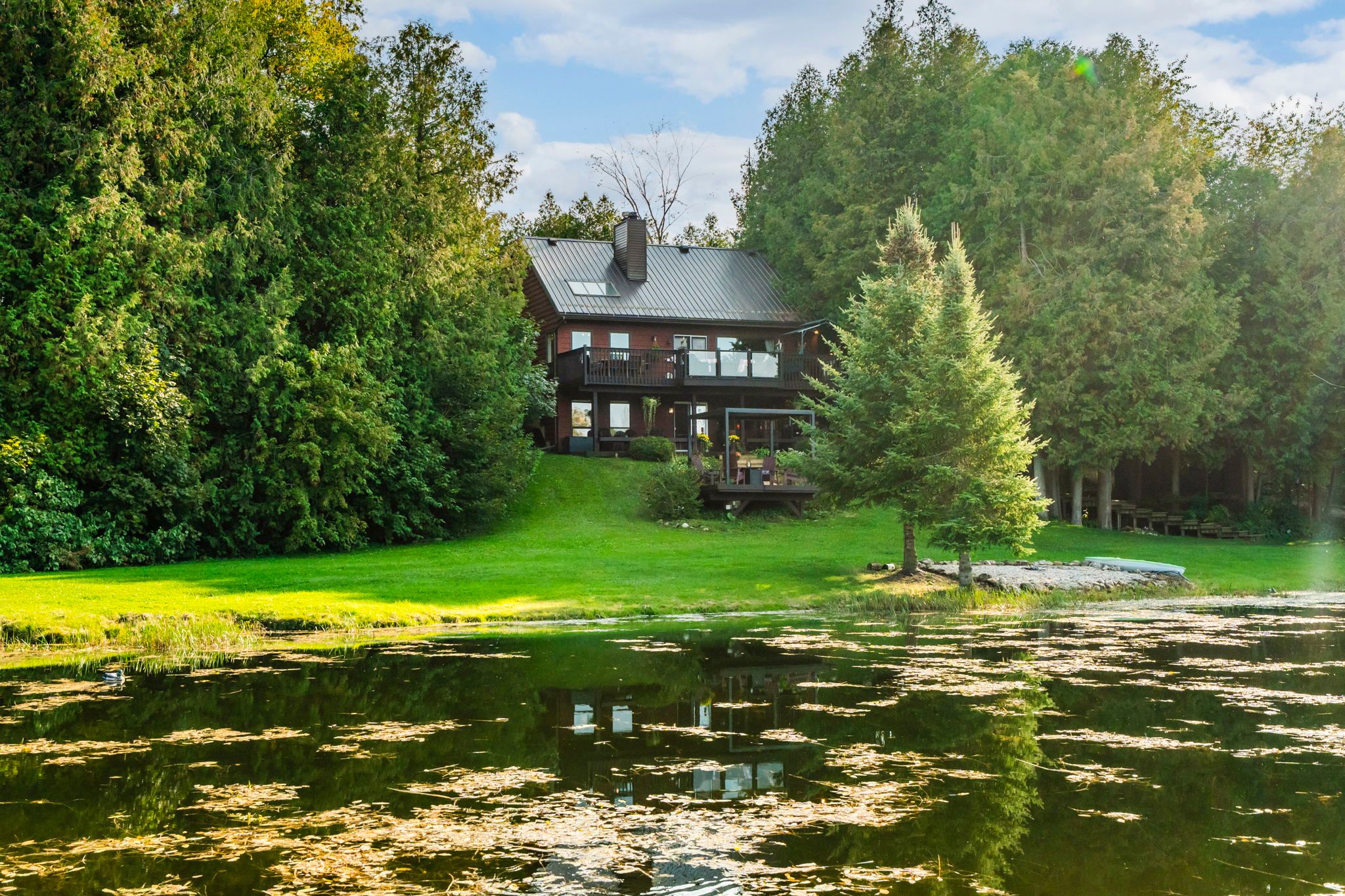 The "westwind" retreat is a one of a kind county estate tucked away on almost 16 acres of natural beauty. Completely out of sight from the main road, discover this serene property with it's beautiful 5 bedroom home with in-law suite, cultivated trails throughout the property, multiple outbuildings, 2 large ponds which flow into little beaver river, connecting to lake eugenia. From the moment you step onto its grounds, you are transported into a realm of enchantment and serenity that captures your imagination. This 5 bedroom chalet style home has a grand open living space, main floor primary bedroom with ensuite bath, 3 bedrooms on the upper level with 3 piece bath and a fully finished lower level with walkout and complete in-law suite featuring a separate kitchen. The home's architecture blends seamlessly with the natural surroundings. Enjoy truly spectacular sunsets off your back deck or back covered patio. Large windows offer panoramic views of the expansive ponds from every corner of the home while multiple outdoor seating areas bring you at one with nature. This property is more than just a place to live, it's a place to unwind, relax and call home. Fish from your own dock, take the kayak for a paddle and fall in love with this spectacular property. With year-round activities such as skiing at beaver valley/devils glen/blue mountain, snowmobiling, and golfing, this property is your gateway to grey highlands' all-season recreational paradise. Located just 5 minutes from flesherton for all your day to day needs with markdale hospital close by, 35 minutes to collingwood and blue mountain, and less than 2 hours from toronto, this home makes for a rare getaway with endless possibilities. Discover the perfect blend of privacy, beauty, and convenience all in one property.