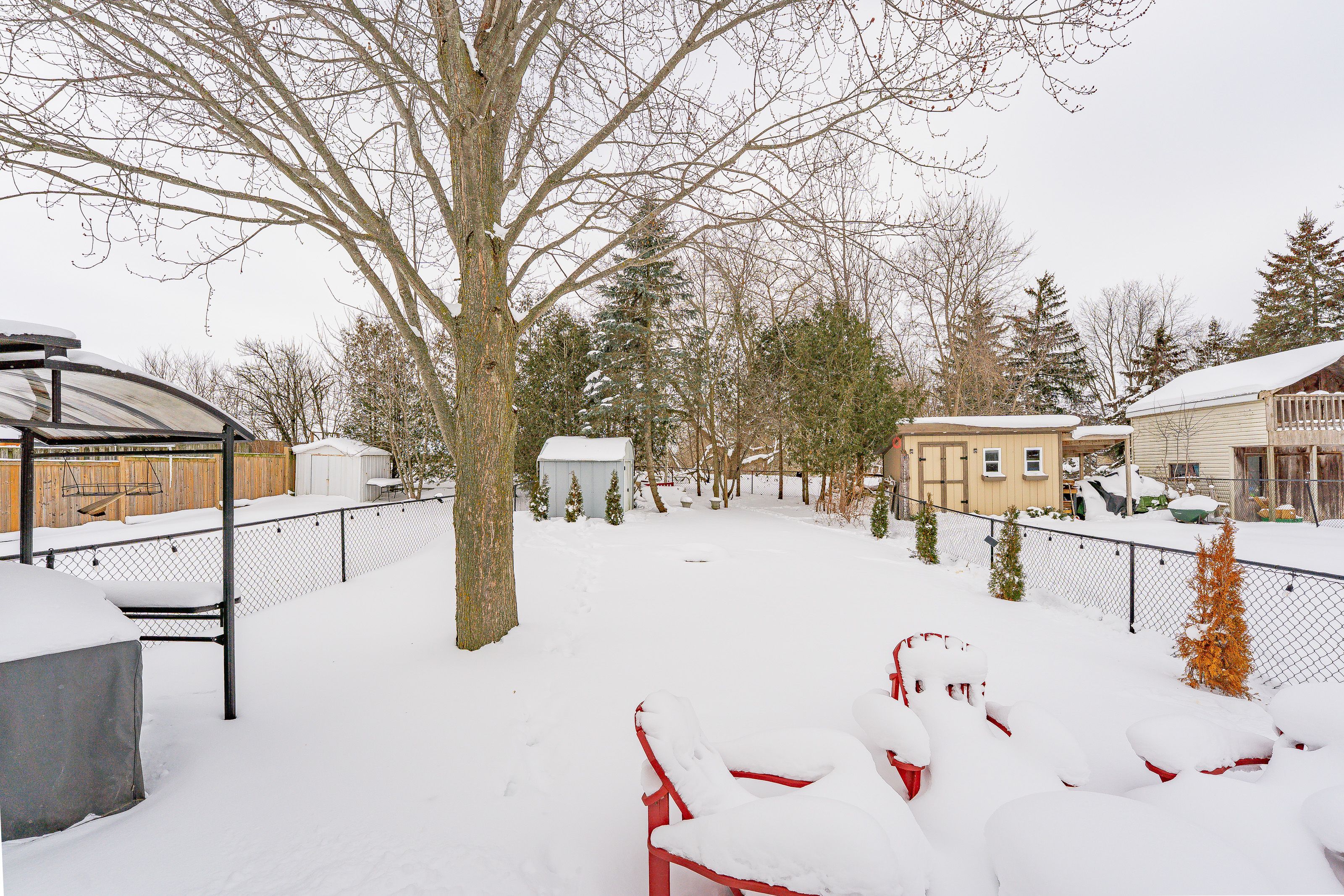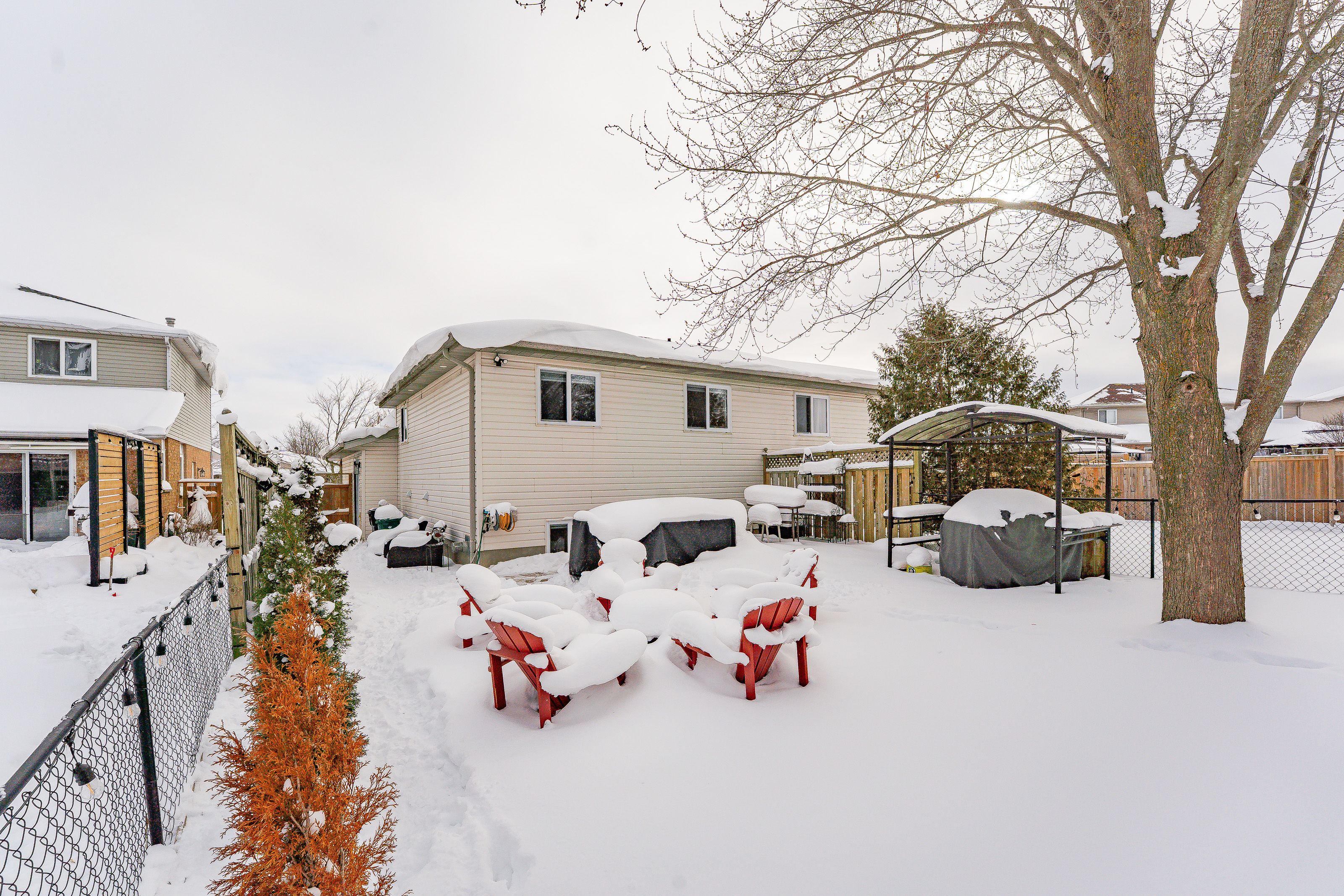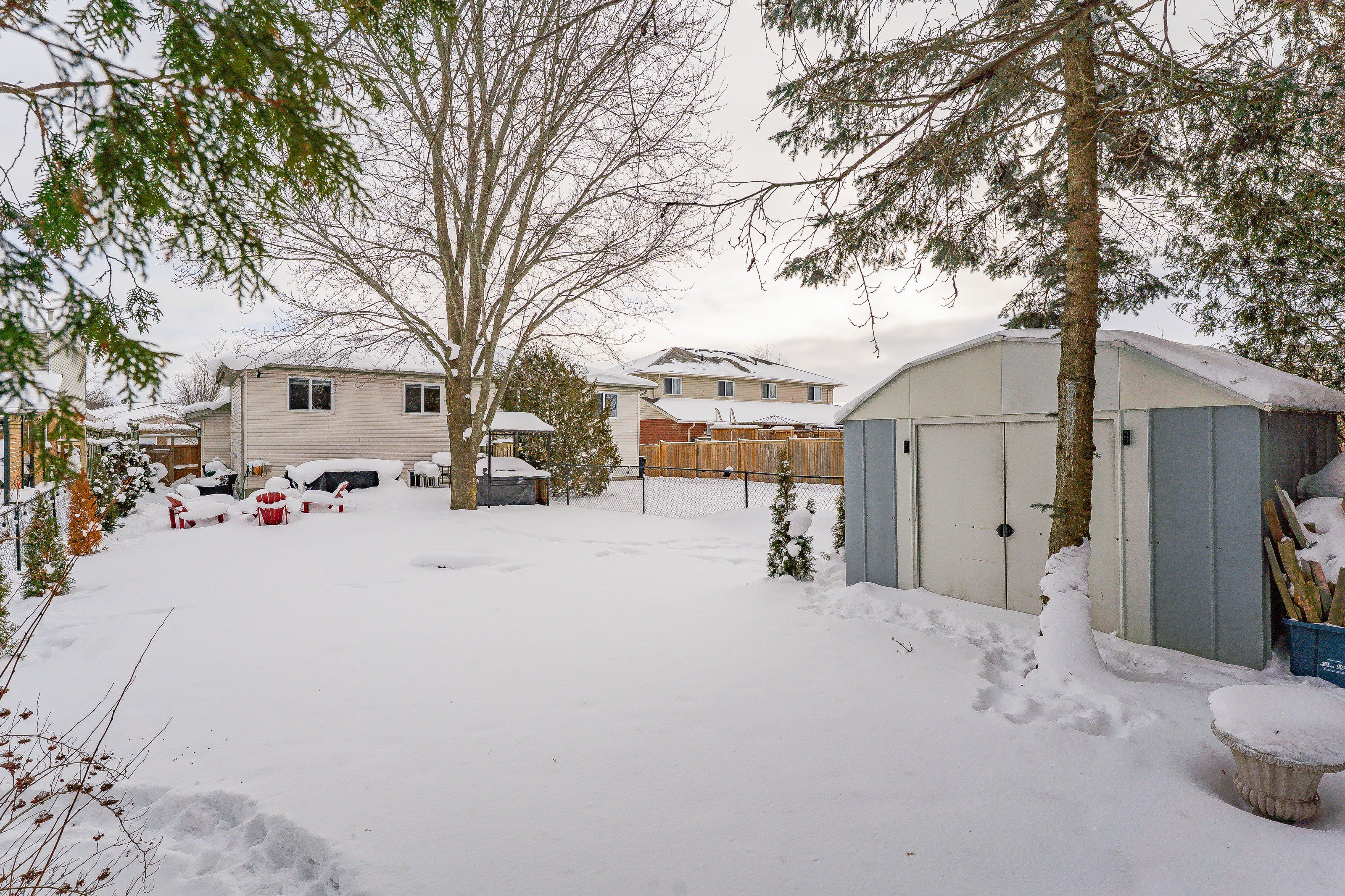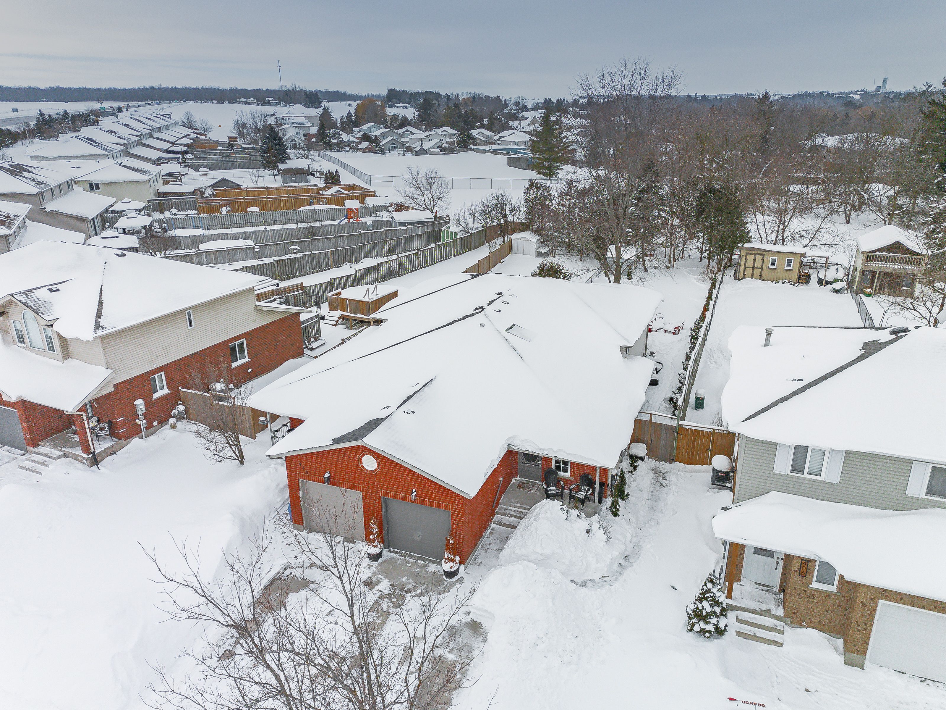 Welcome to 408 joseph street, a beautifully updated semi-detached 4 level backsplit located in family-friendly new hamburg. Offering over 1,500 sq ft of finished living space, this home features 3 bedrooms, 2 full bathrooms, a functional multi-level layout, and a fully finished lower level. The main level showcases a stunning designer kitchen with sleek flat-panel white cabinetry, quartz countertops, a large centre island with seating, stainless steel appliances, gas range, modern hood fan, open shelving, and a skylight that fills the space with natural light. The open-concept living and dining areas are finished with wide-plank flooring, recessed lighting, and a cozy fireplace, creating a warm and contemporary atmosphere ideal for everyday living and entertaining. The primary bedroom offers updated flooring, modern lighting, and generous closet space, while two additional generously sized bedrooms provide excellent flexibility for children, guests, or a home office. The main bathroom has been tastefully renovated with a floating double vanity, dual mirrors, upgraded fixtures, and a tub/shower with sliding glass doors. The lower level features a spacious living area with gas fireplace, and large above-grade windows, along with an second full bathroom, making it ideal for hosting guests. Outside, enjoy a private, fully fenced backyard with no rear neighbours, deck and patio areas, and a garden shed. The exterior offers brick and vinyl siding, an attached garage, and a wide concrete driveway with ample space for 2 vehicles . Close to parks, schools, shopping, and quick highway access. An excellent opportunity for first-time buyers, families, or downsizers.