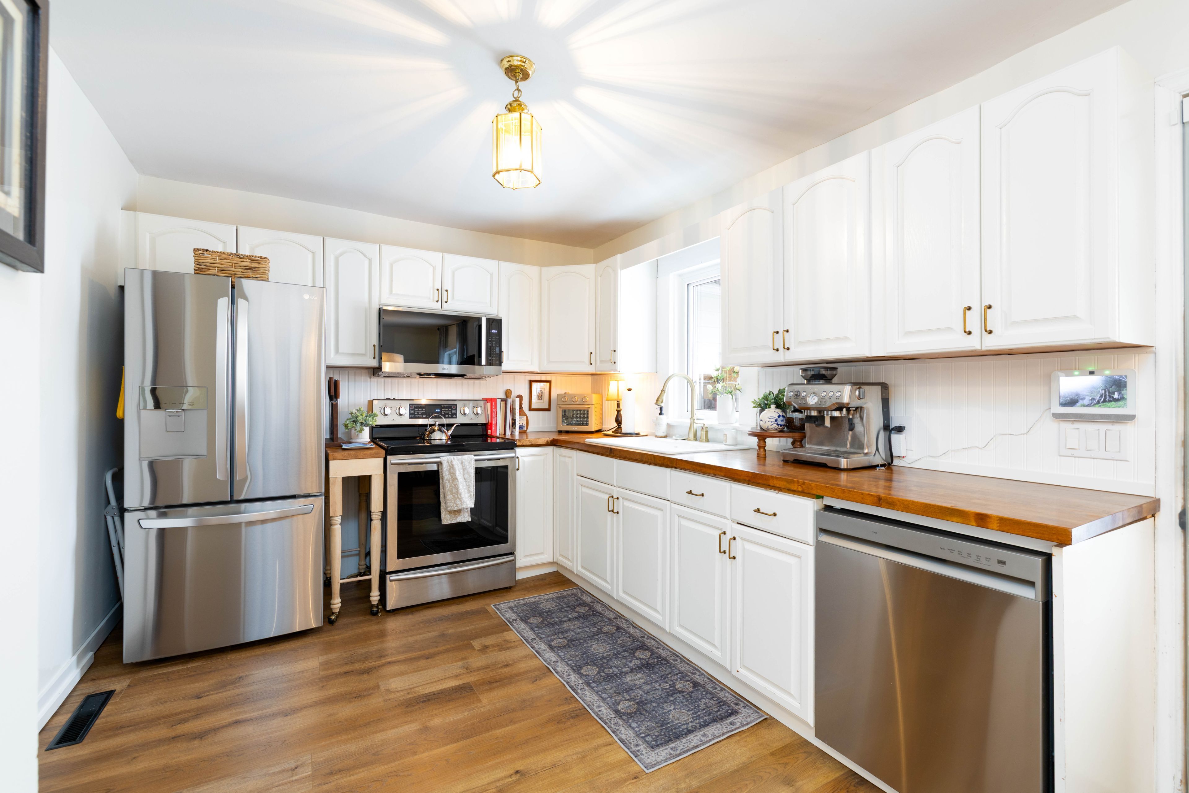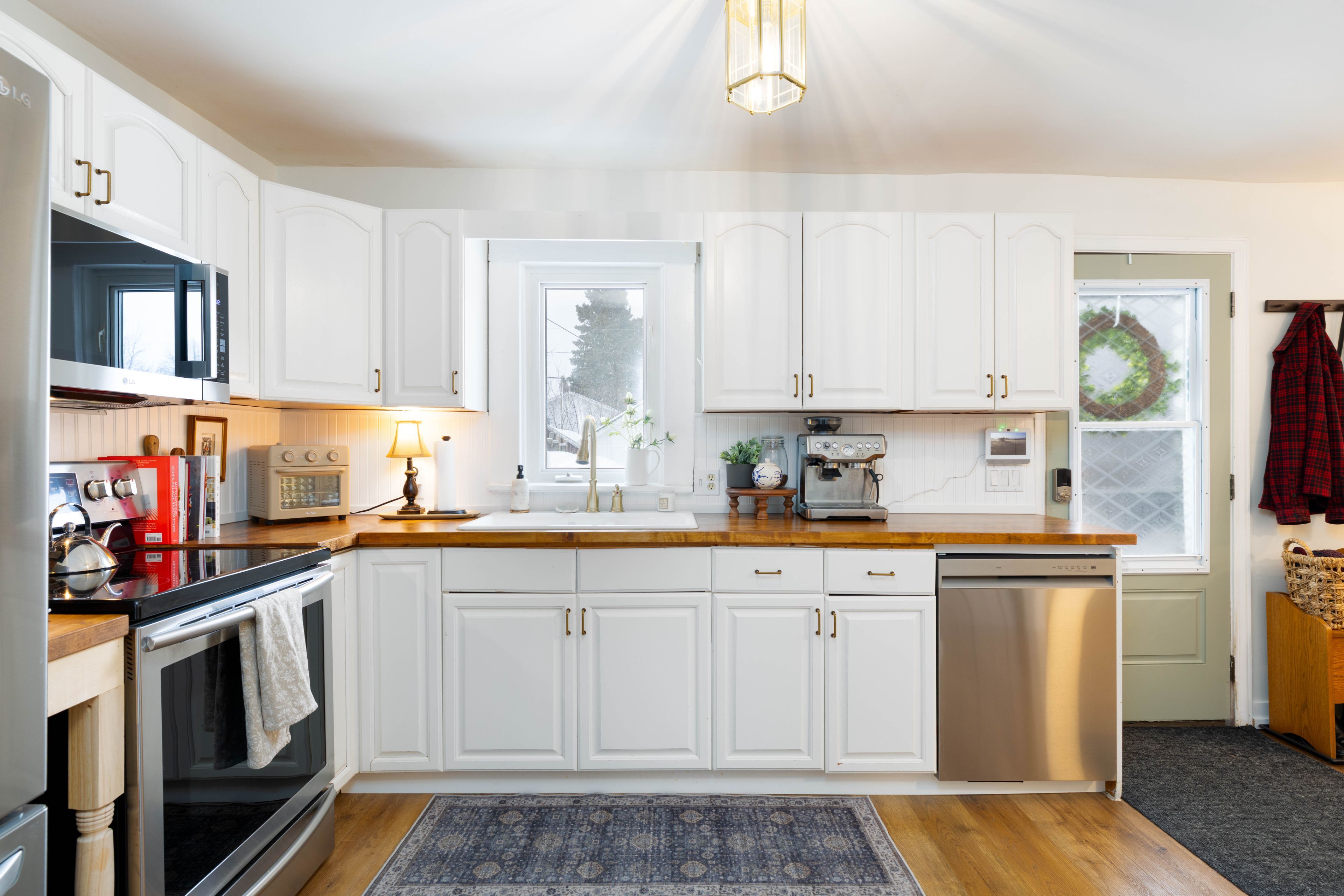 • Updated eat-in kitchen featuring solid wood butcher block counters.