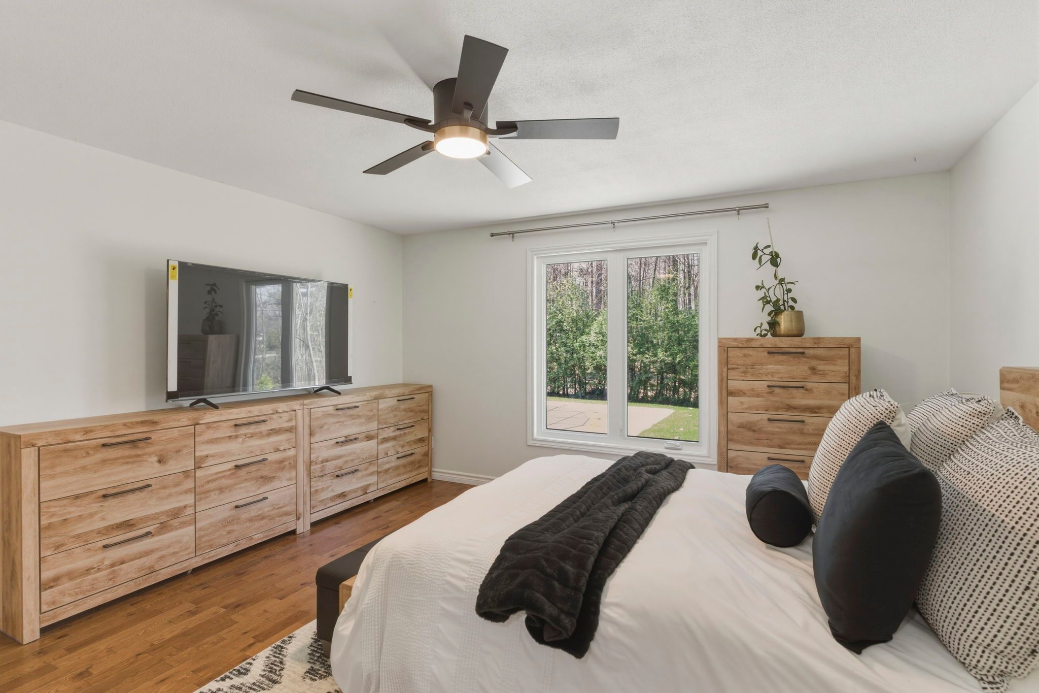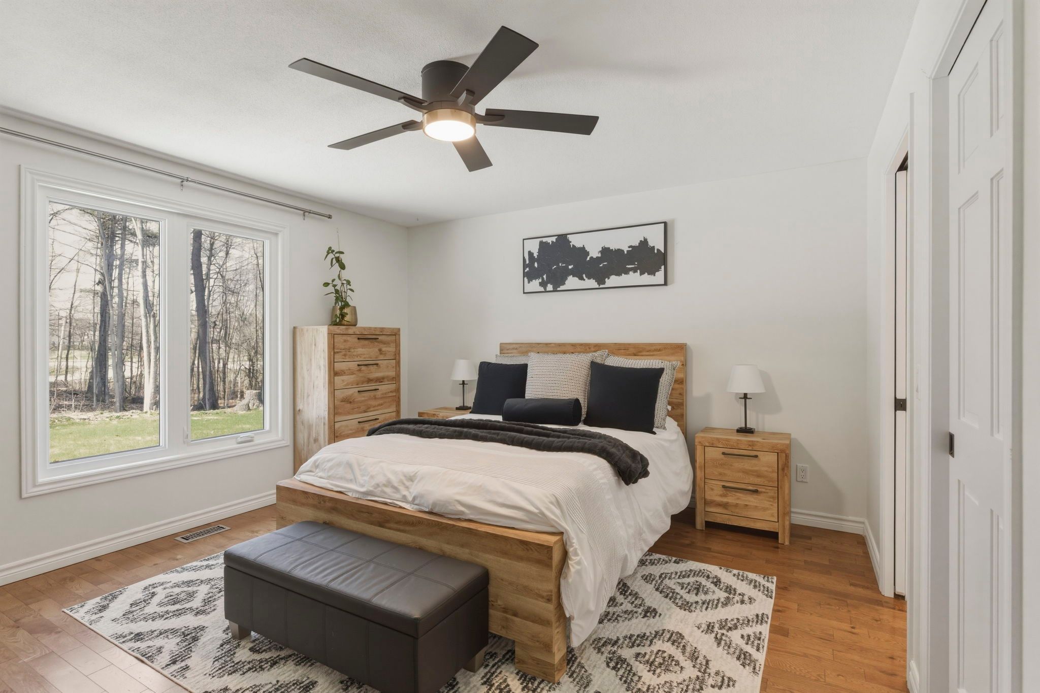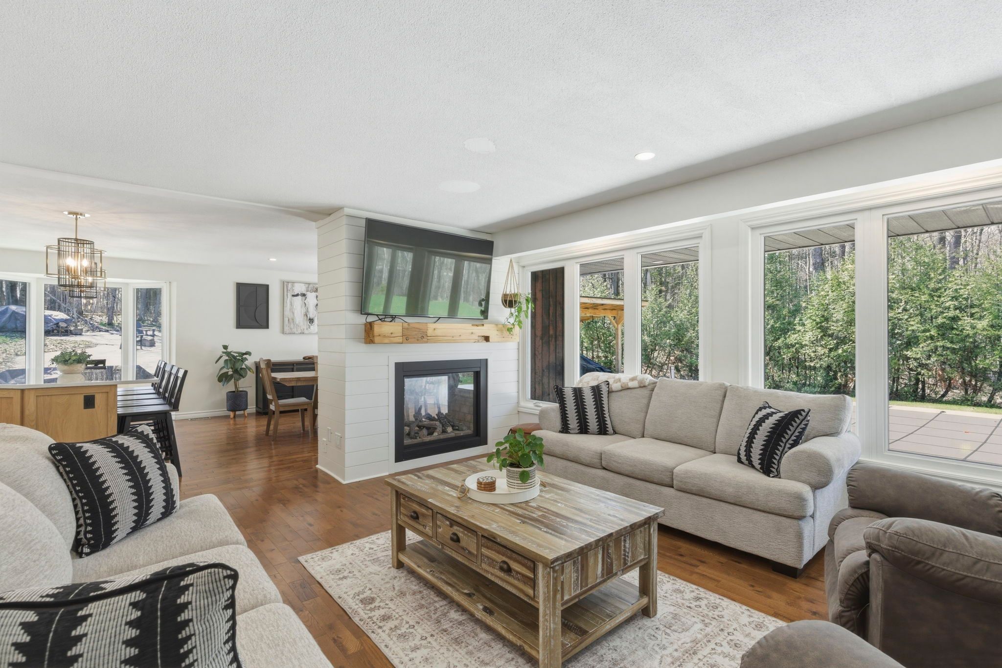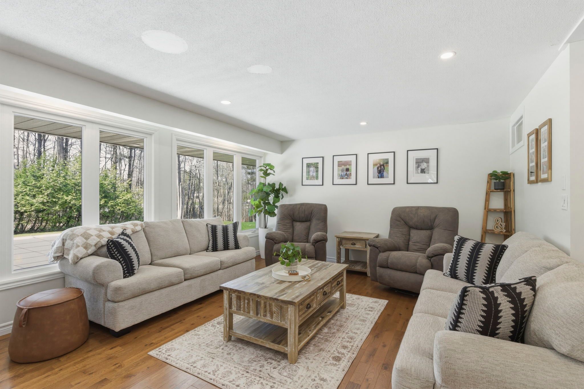 • Bright living room with large windows that bring in natural light.