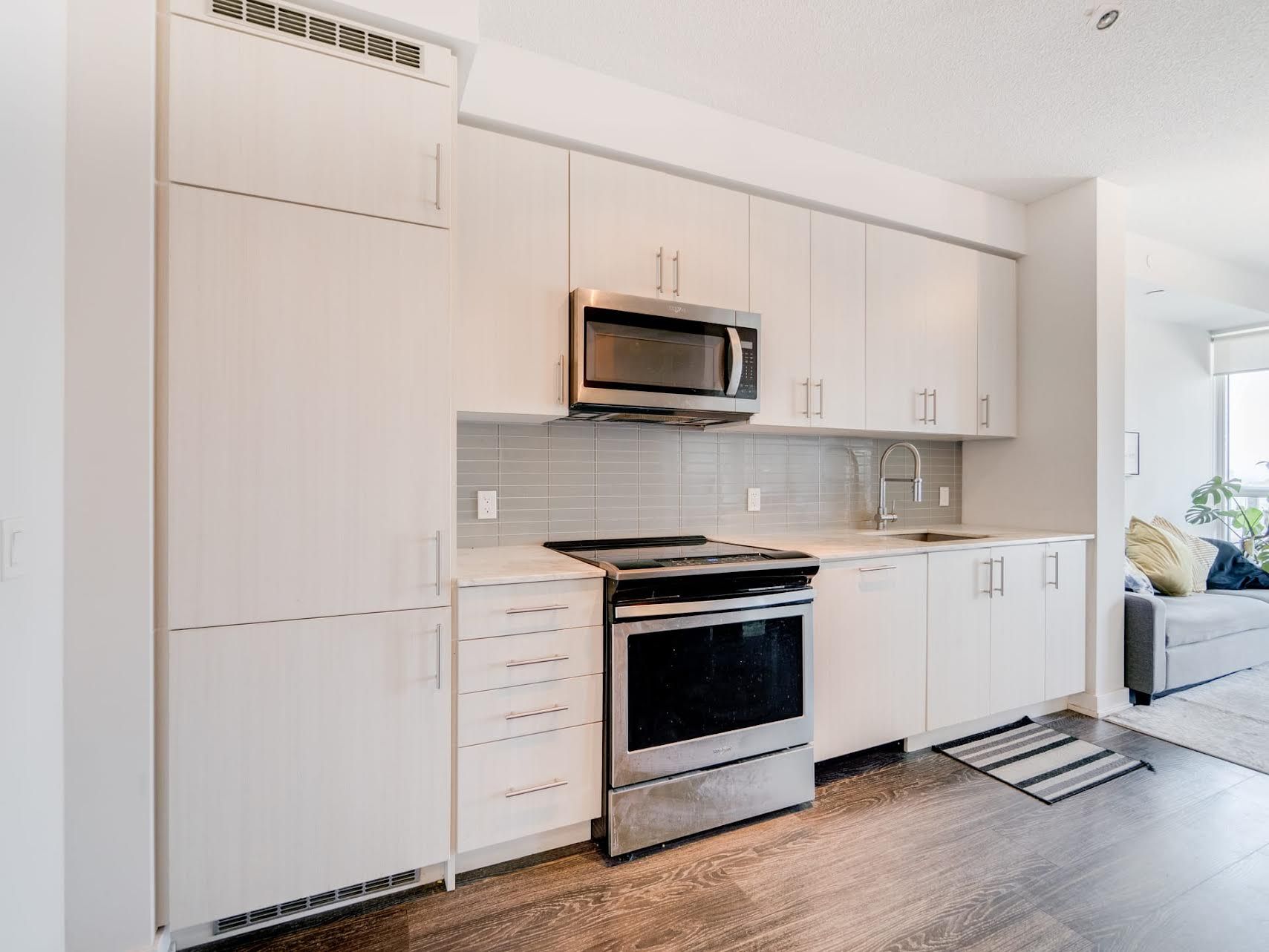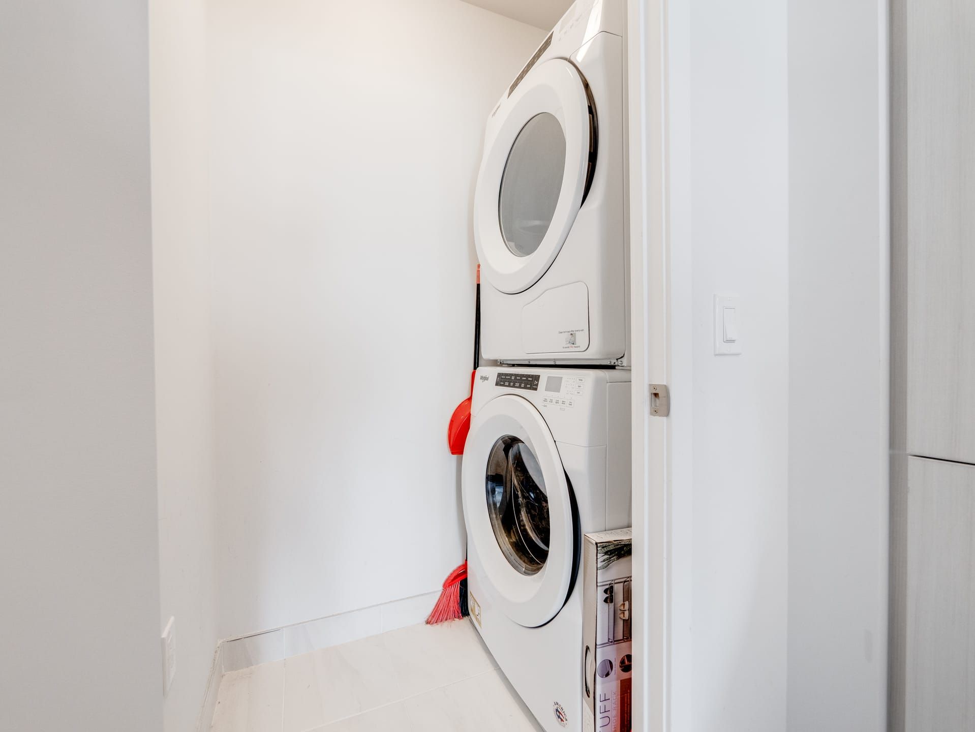 • Modern kitchen and washroom featuring quartz countertops and stainless steel appliances.