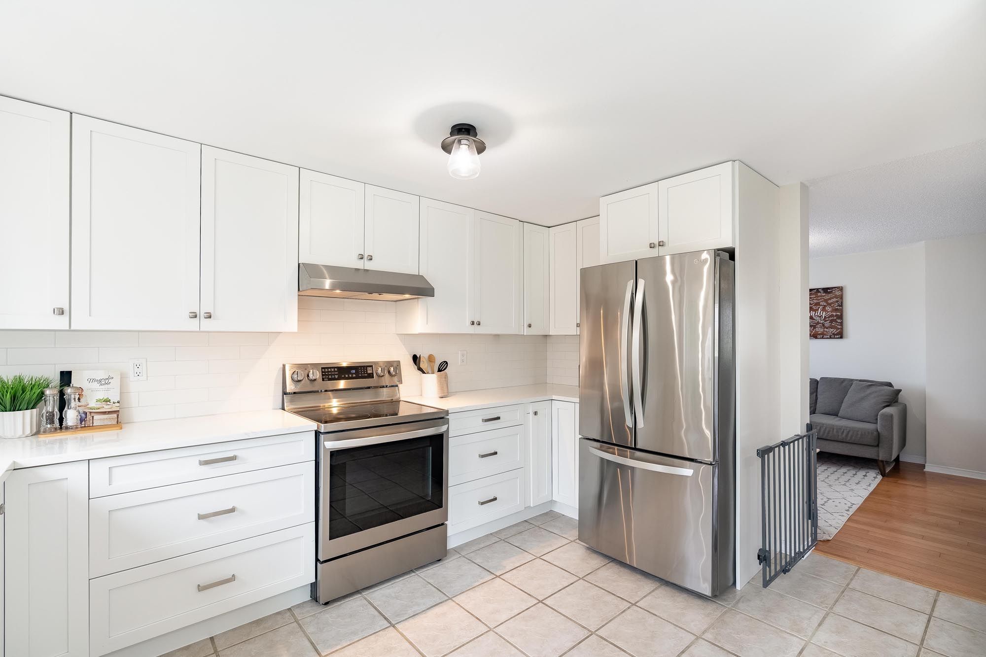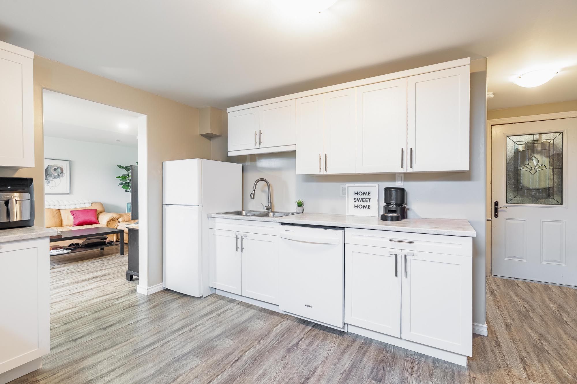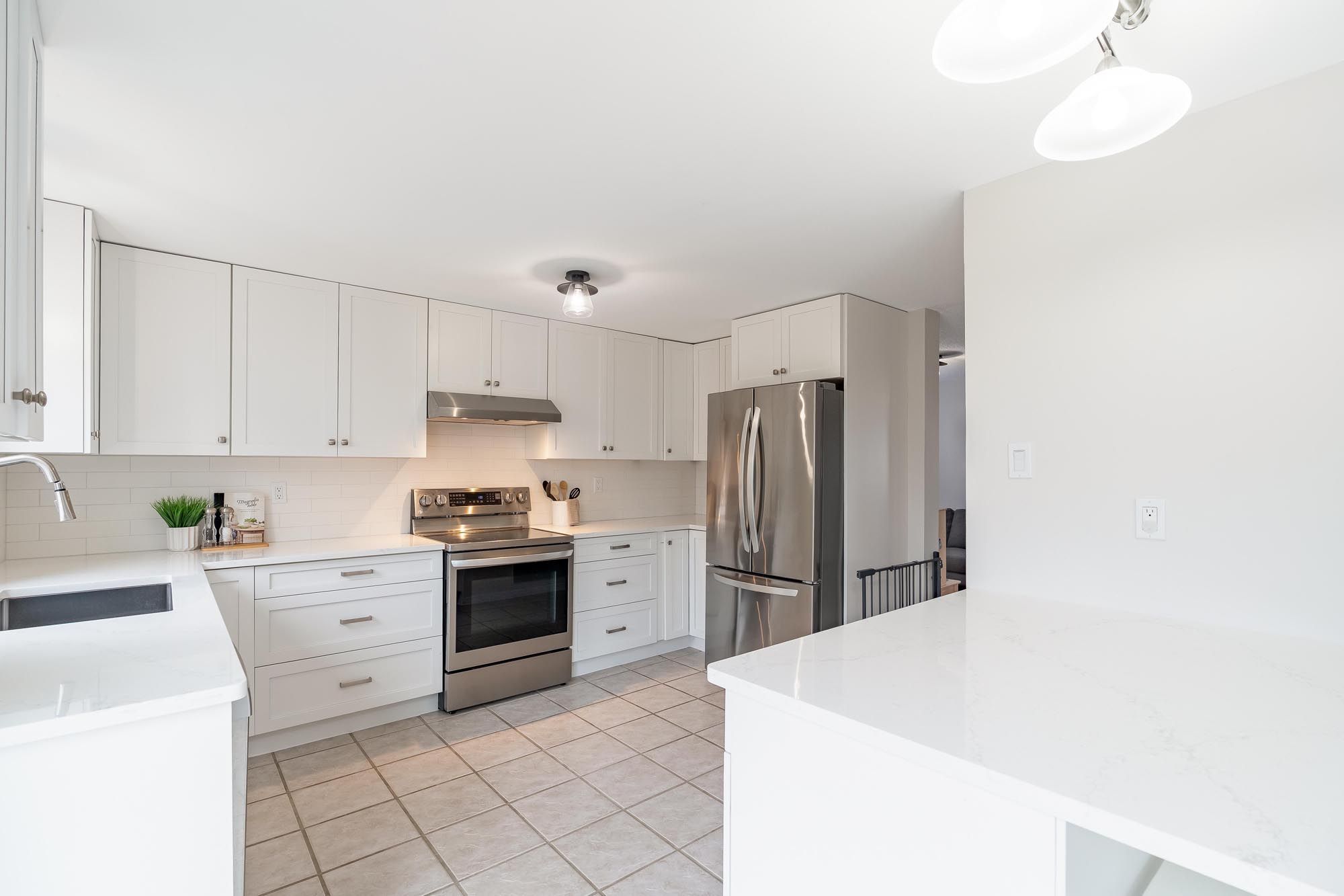• Modern kitchen features quartz countertops and stainless-steel appliances.