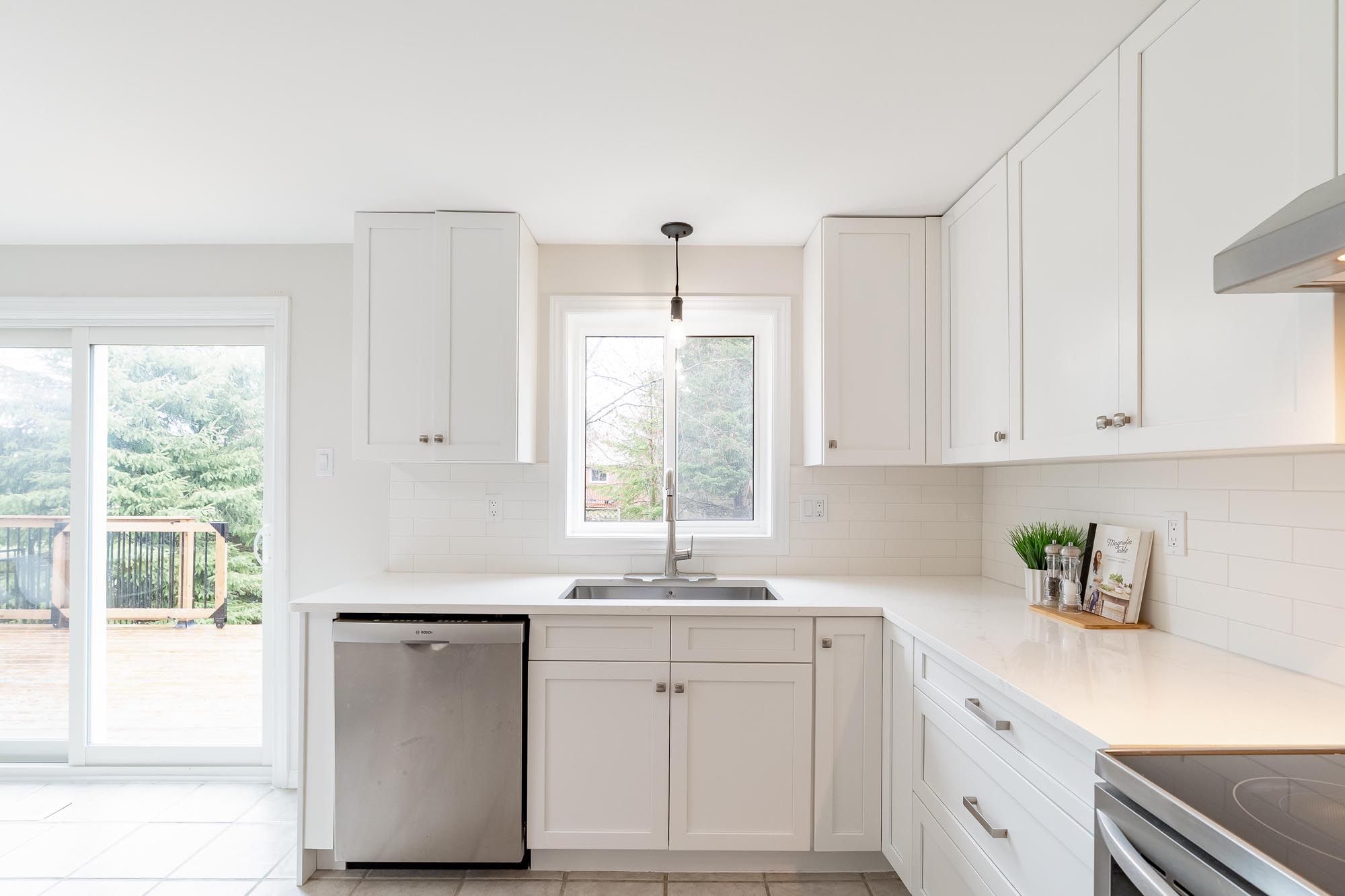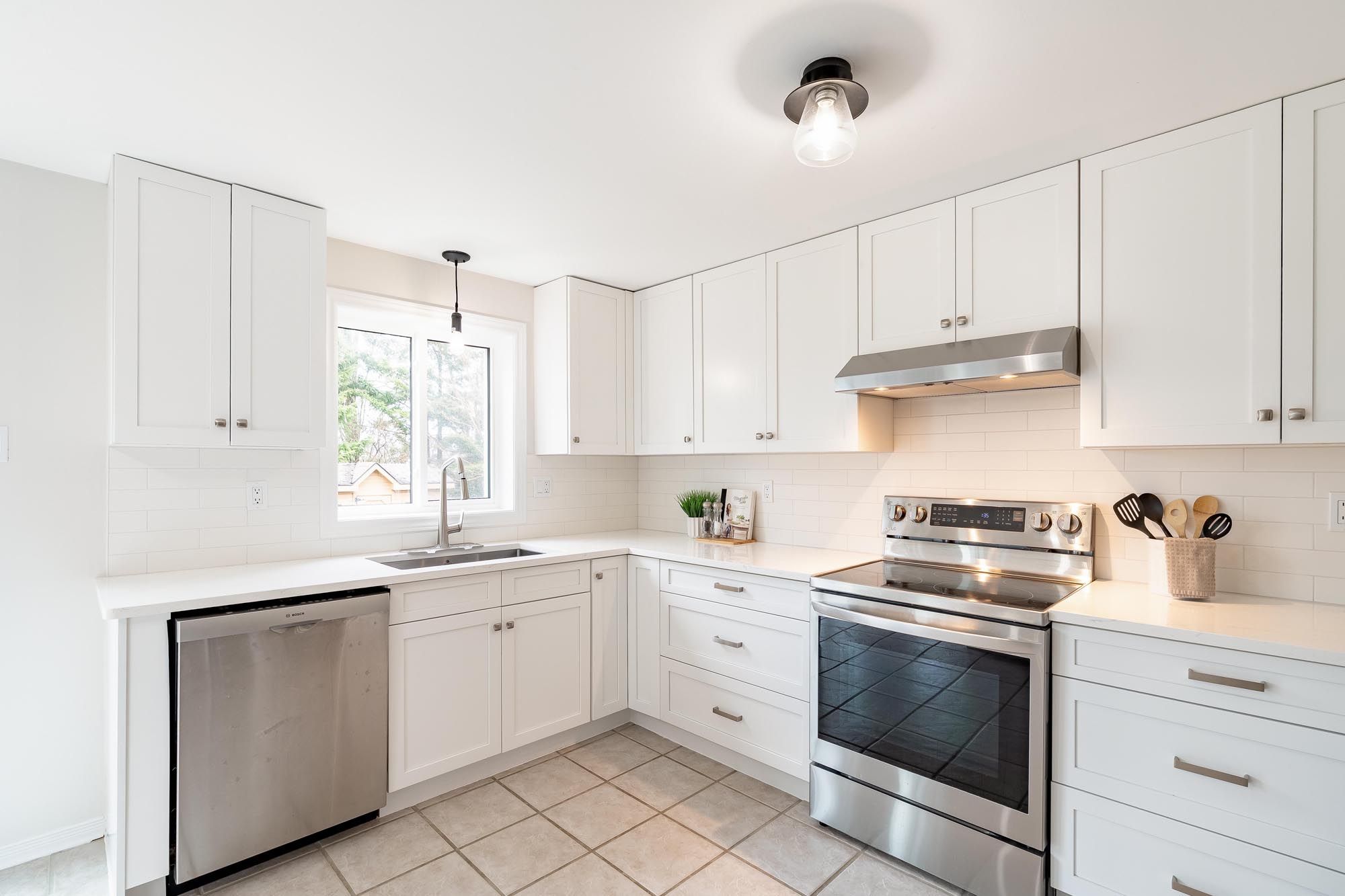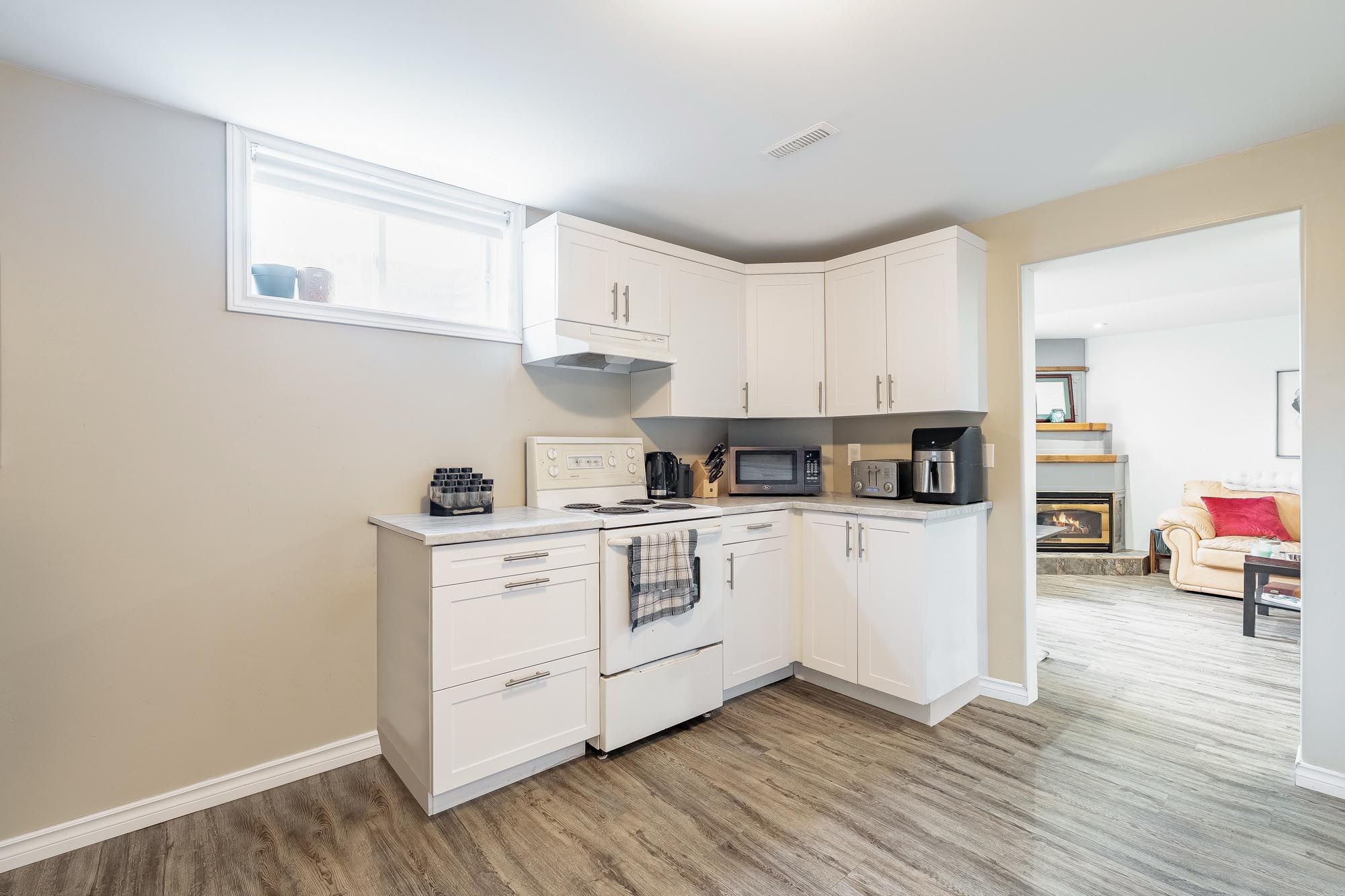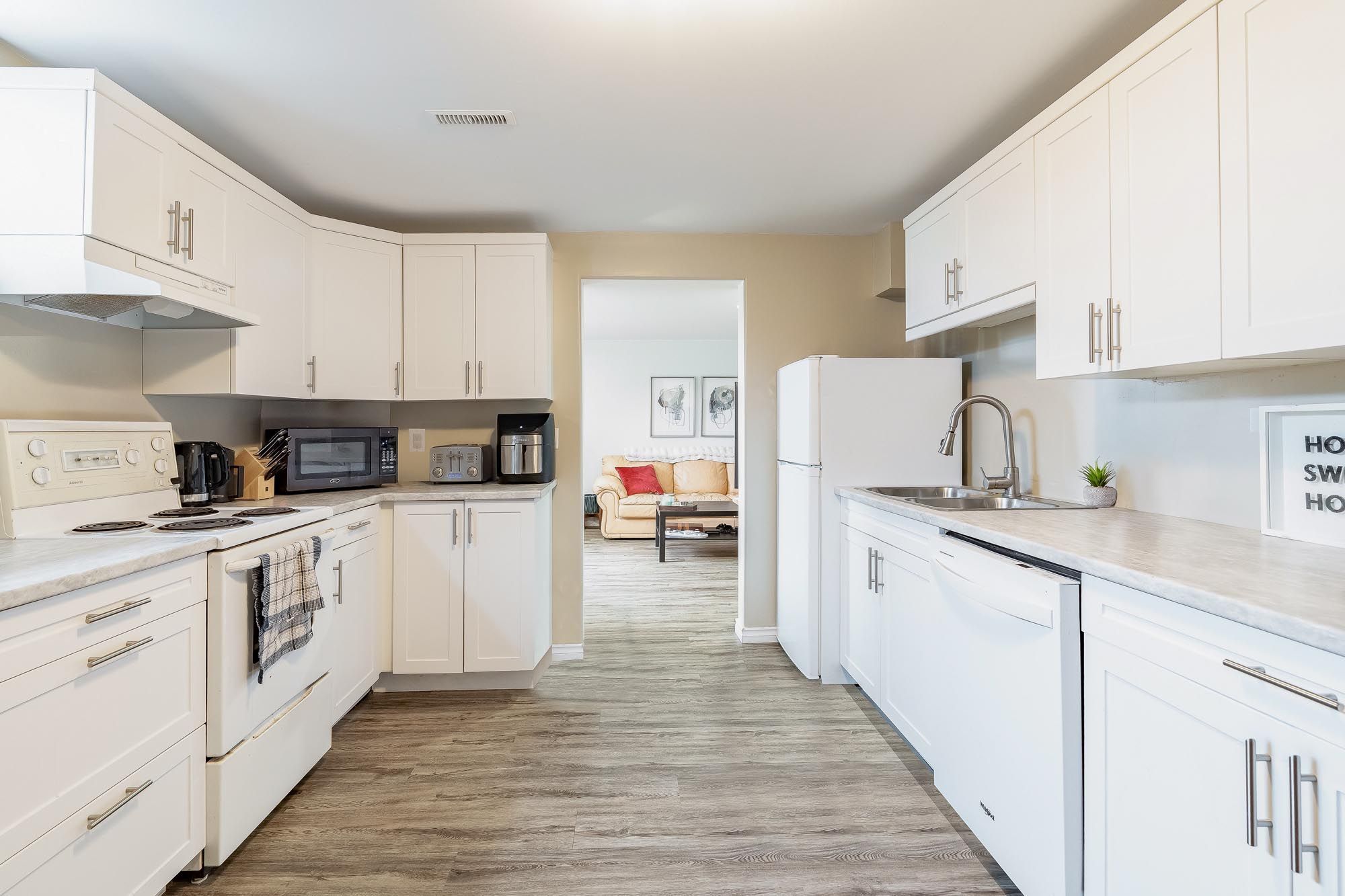 • Modern kitchen features quartz countertops and stainless-steel appliances.
