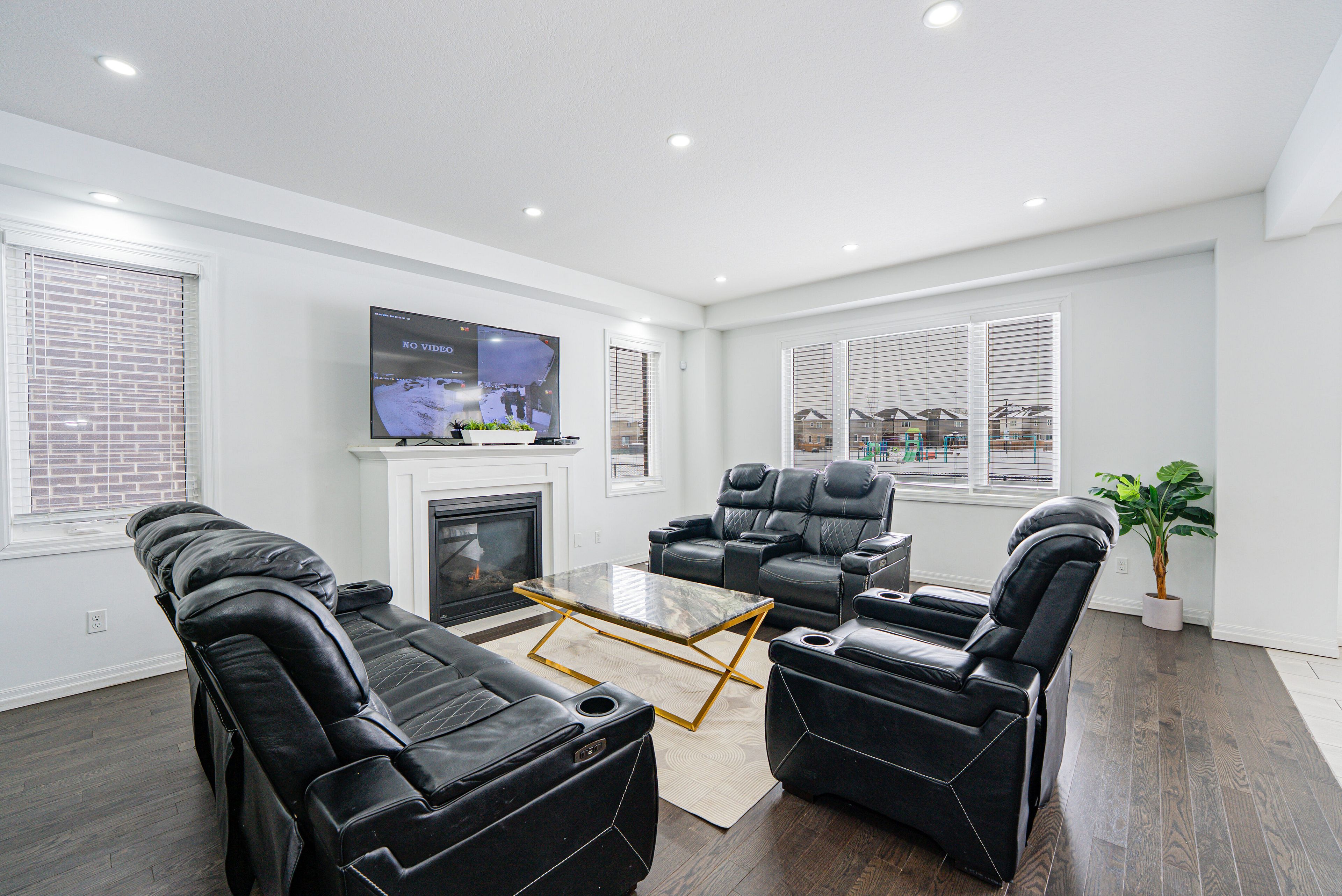 • Spacious open-concept main floor with a large kitchen and cozy fireplace.