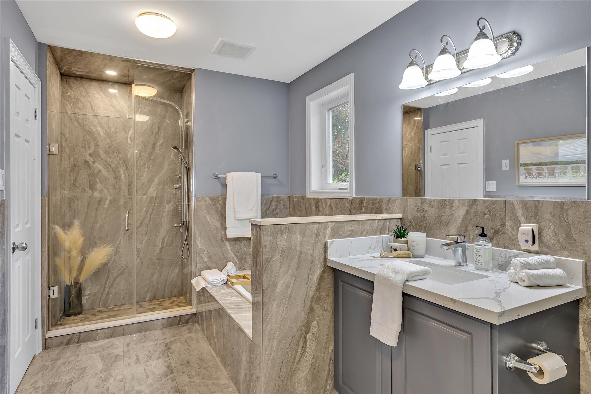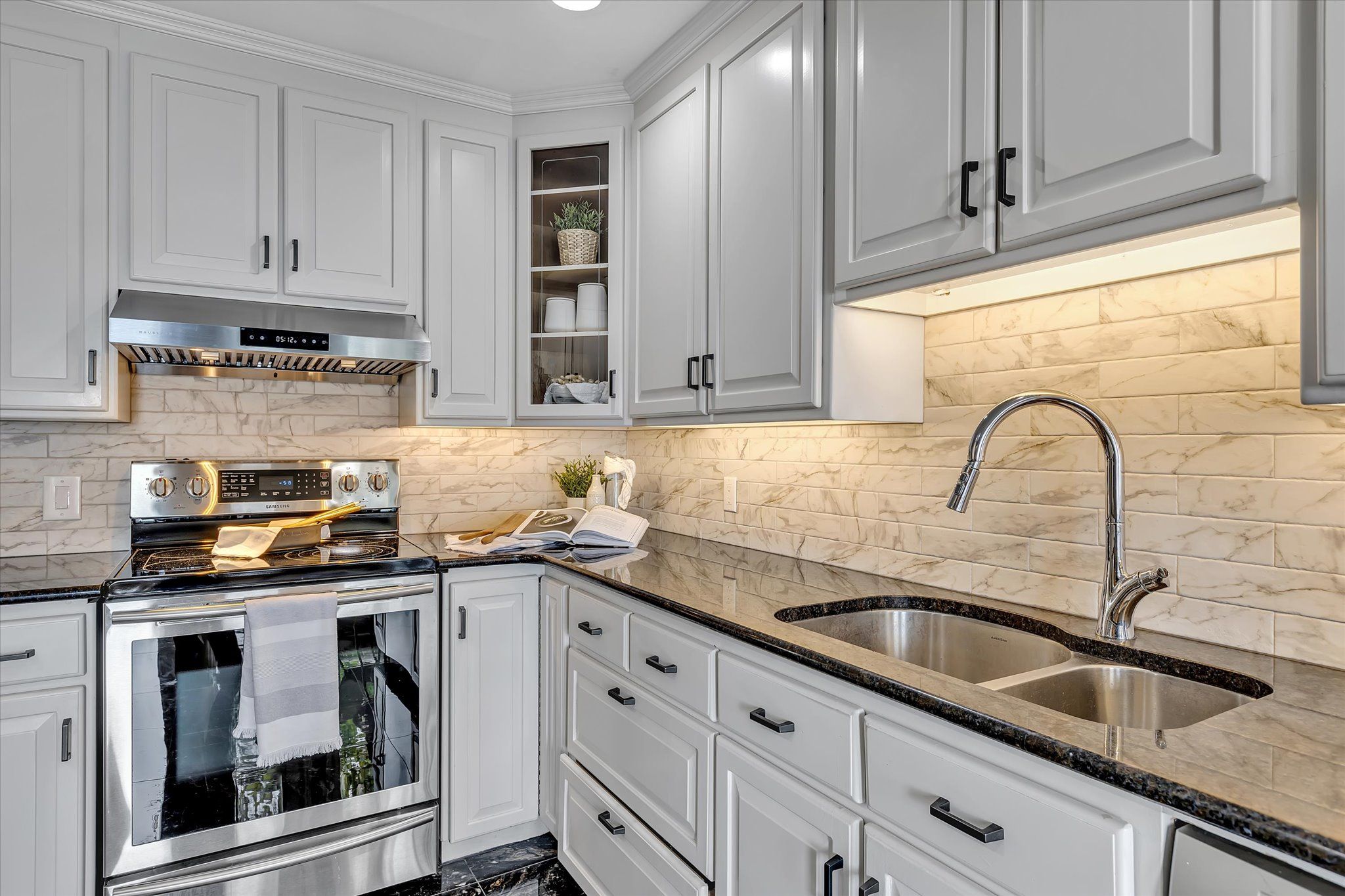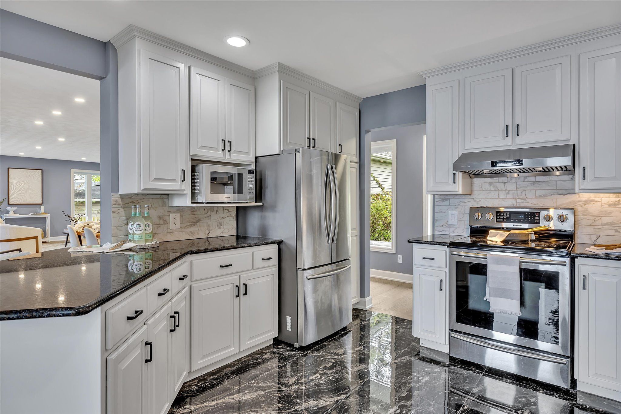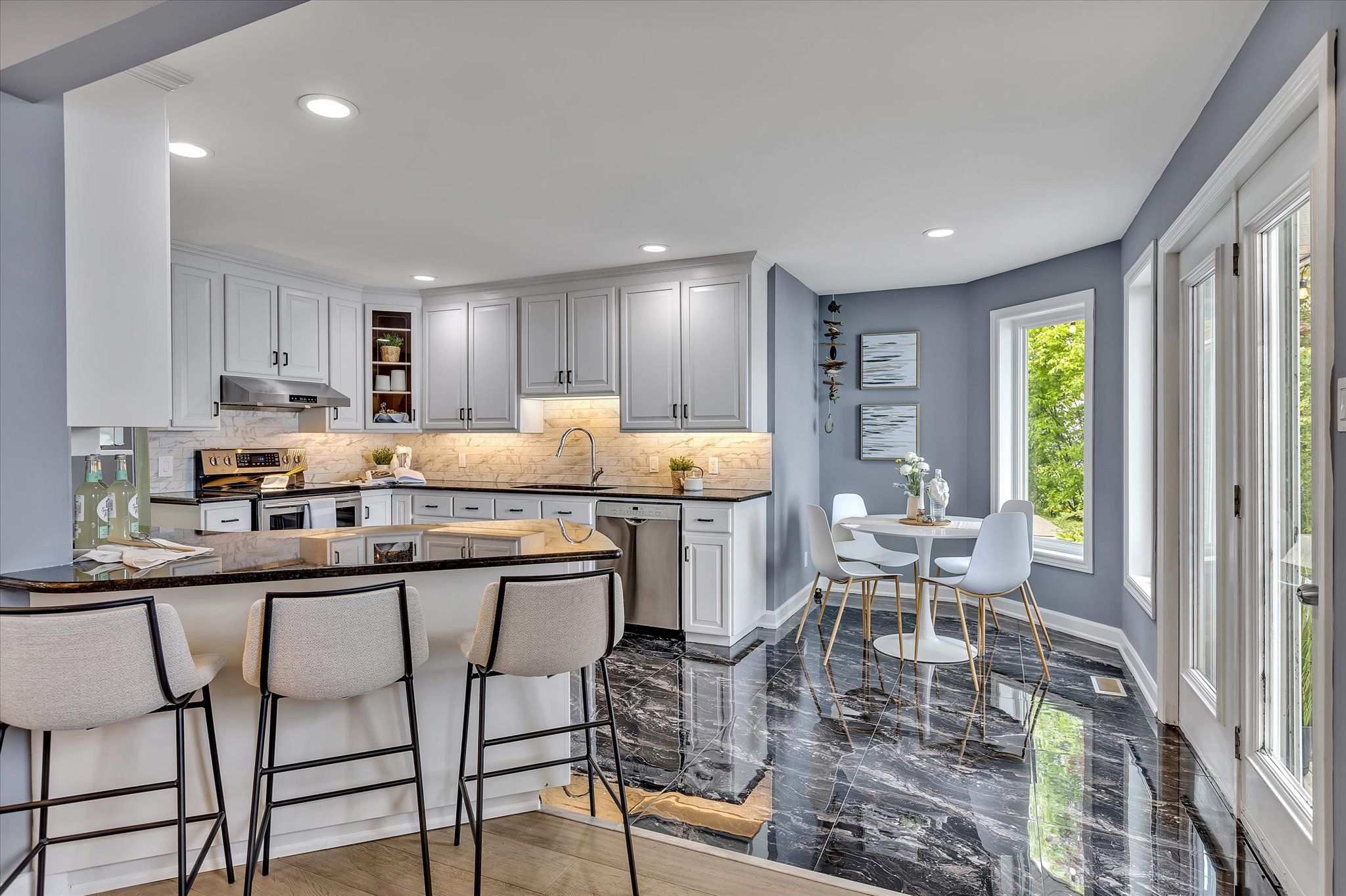 • Modern kitchen with granite countertops and stainless steel appliances.