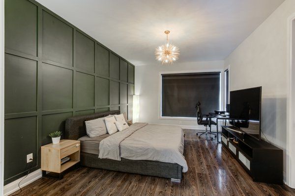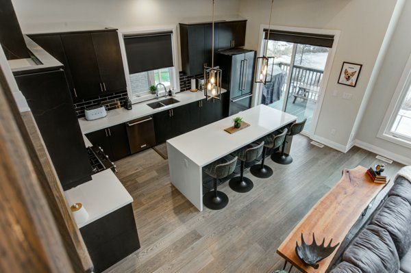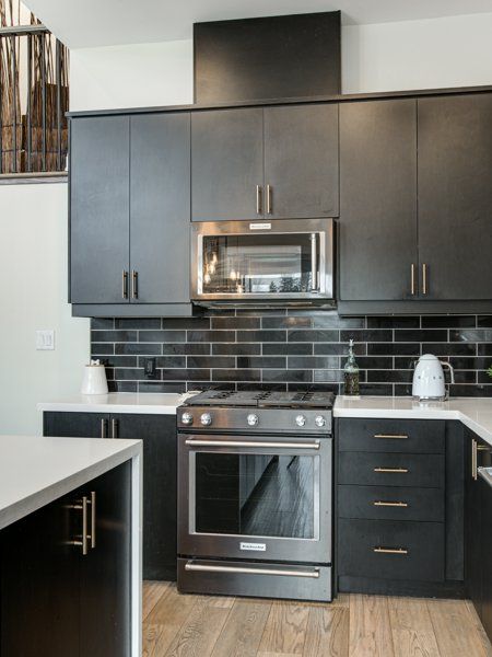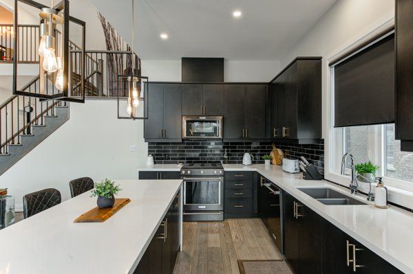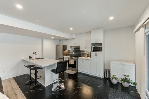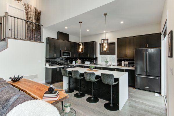 • Modern kitchen features a big island, quartz countertops, and premium appliances.