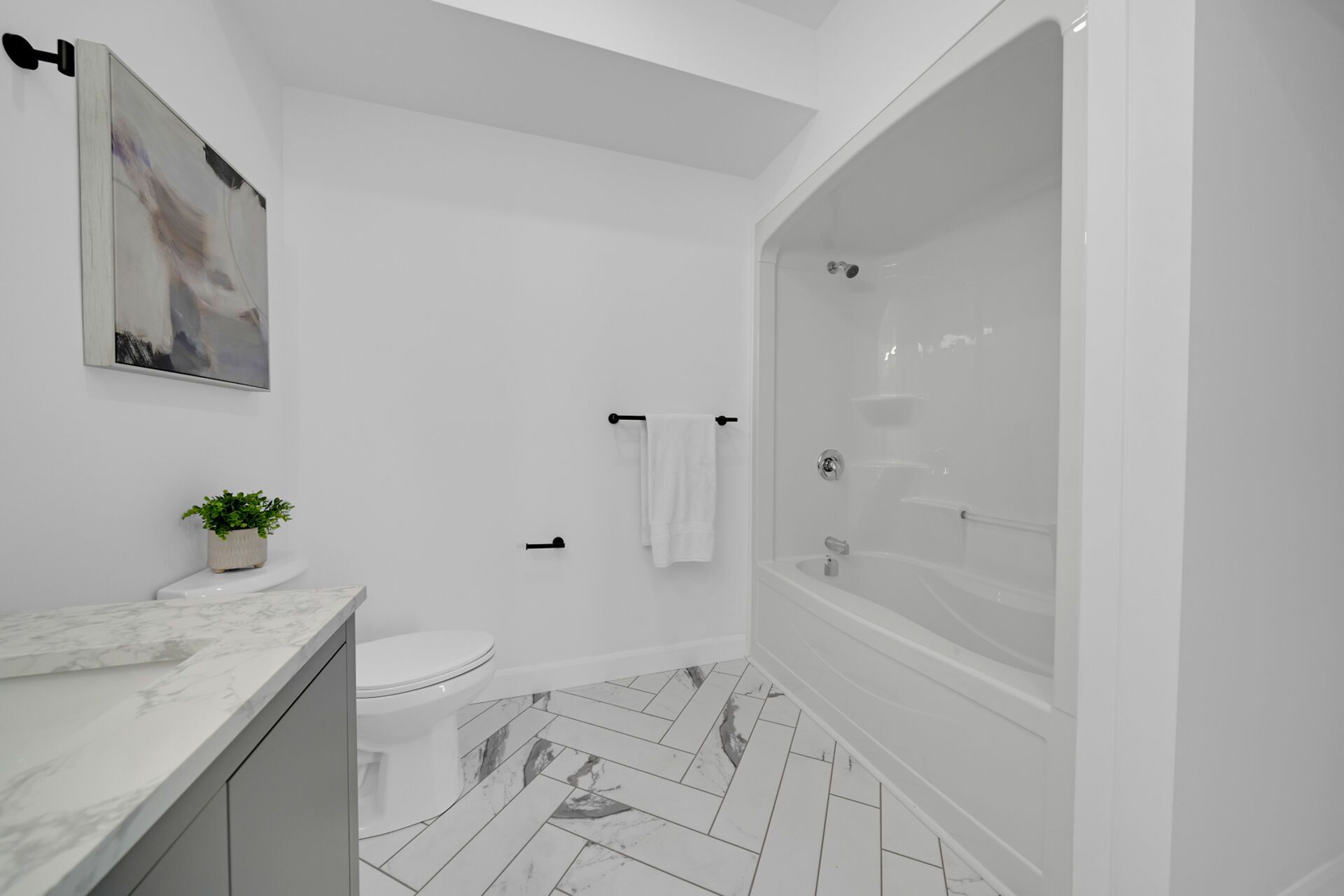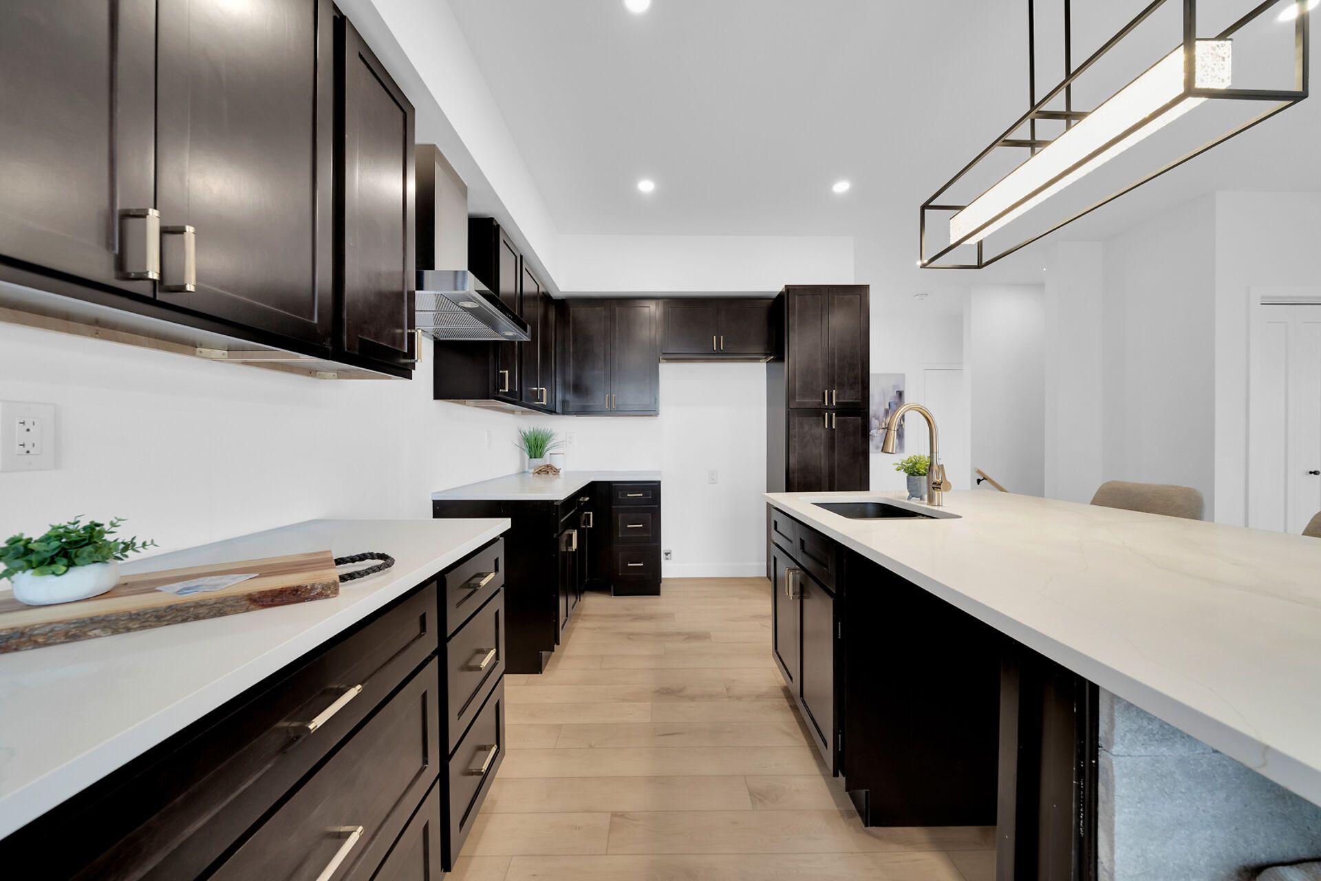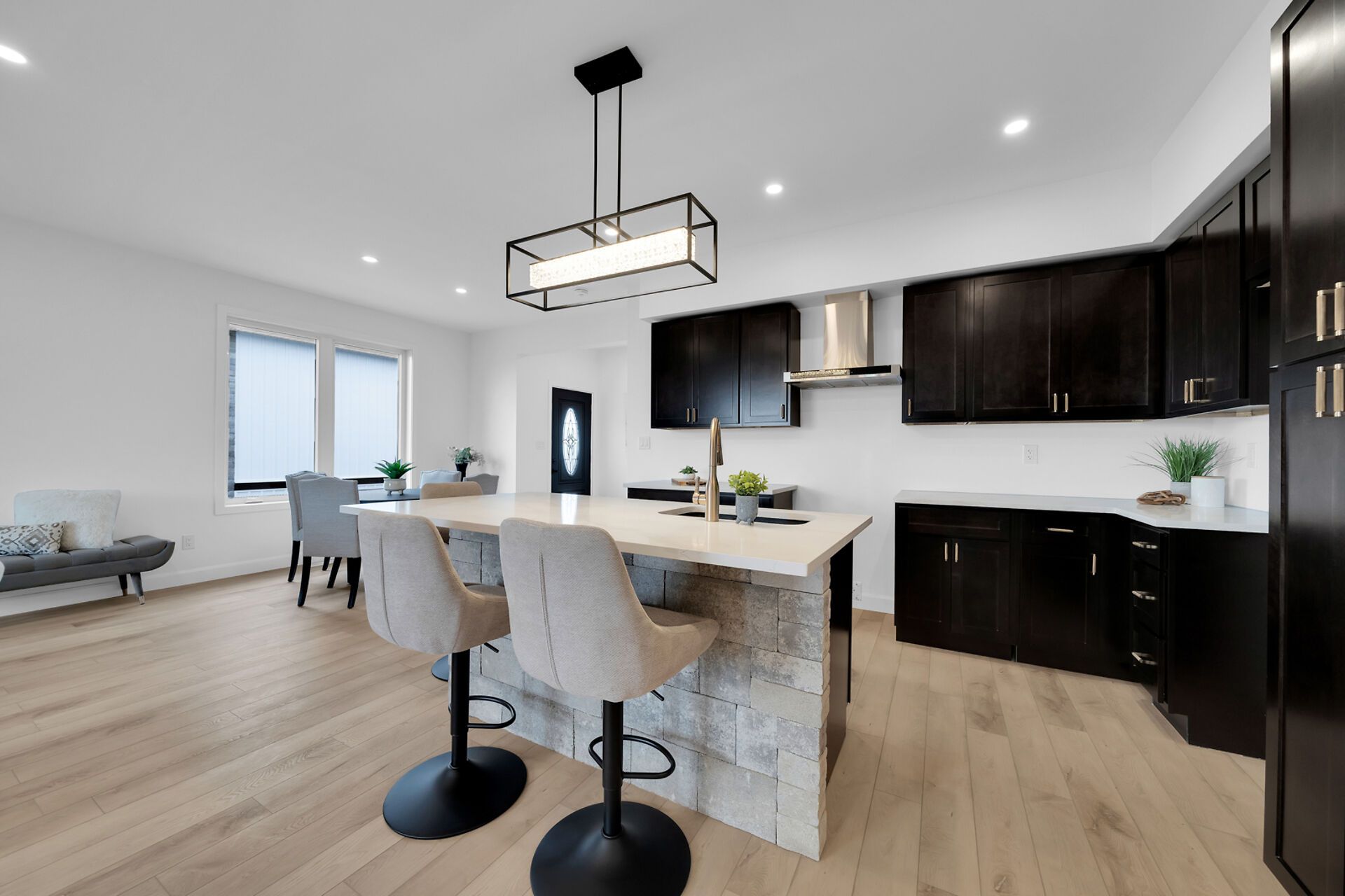• Open concept kitchen with quartz countertops and an eat-at island.
