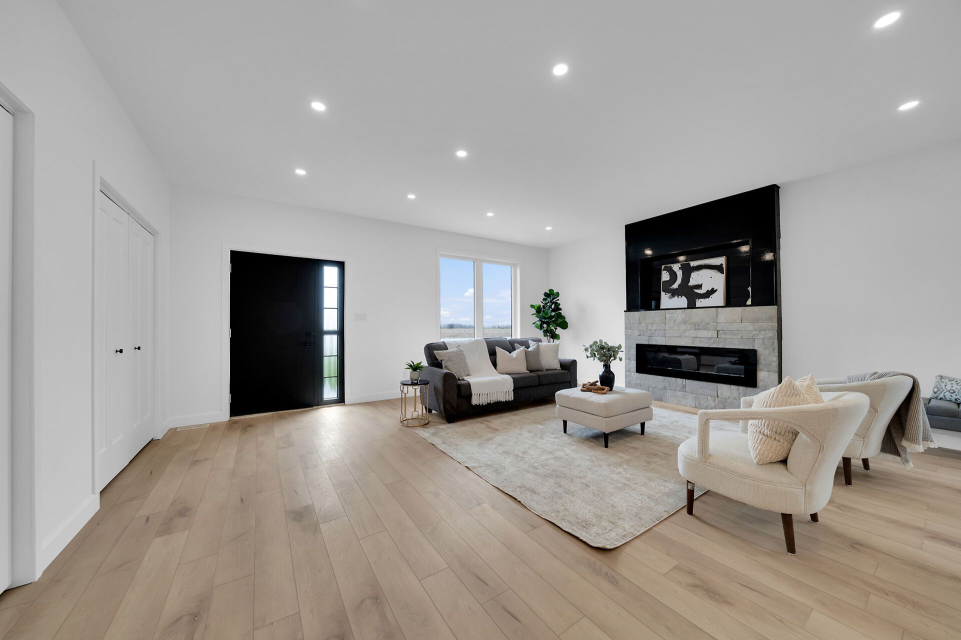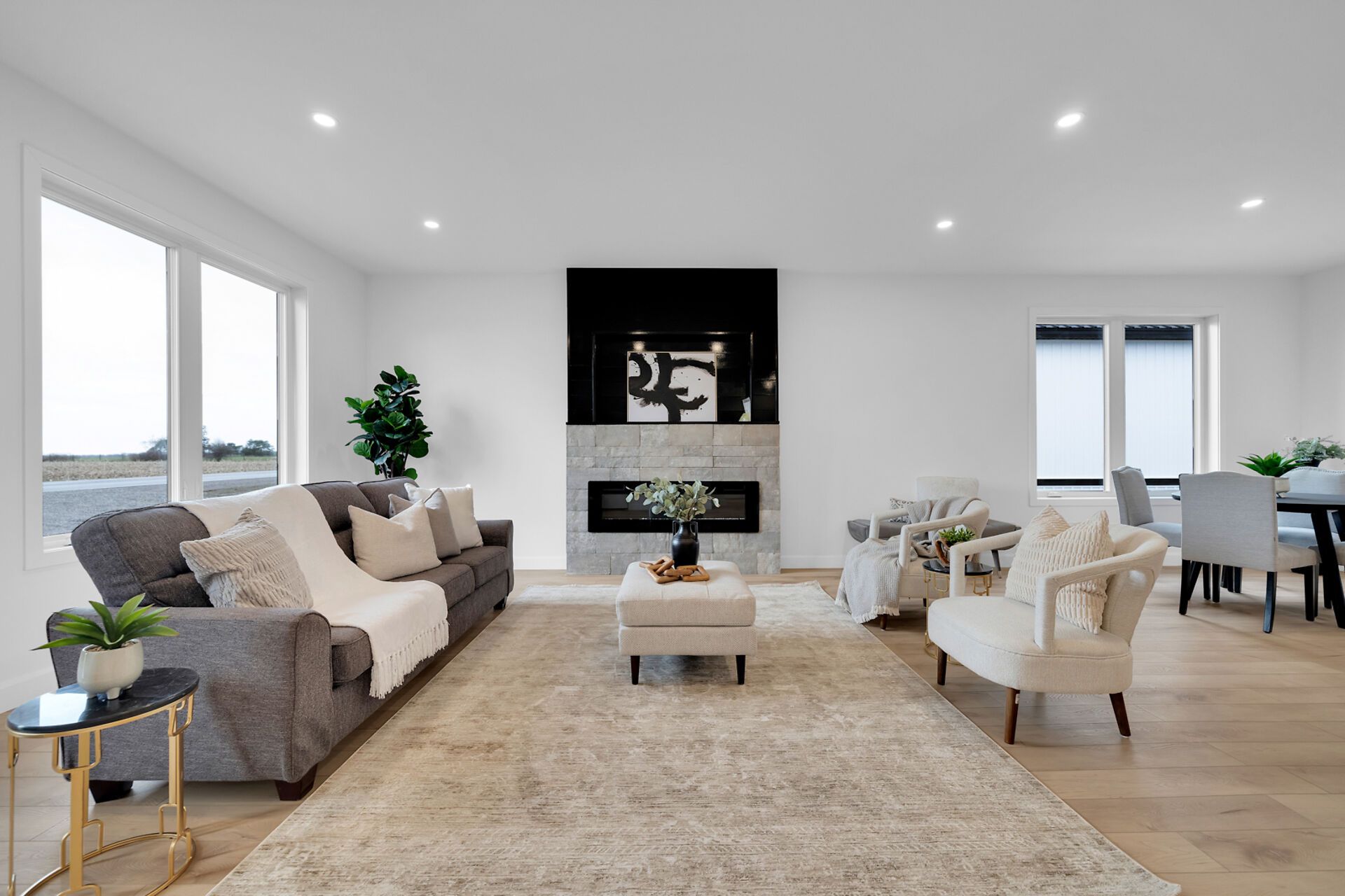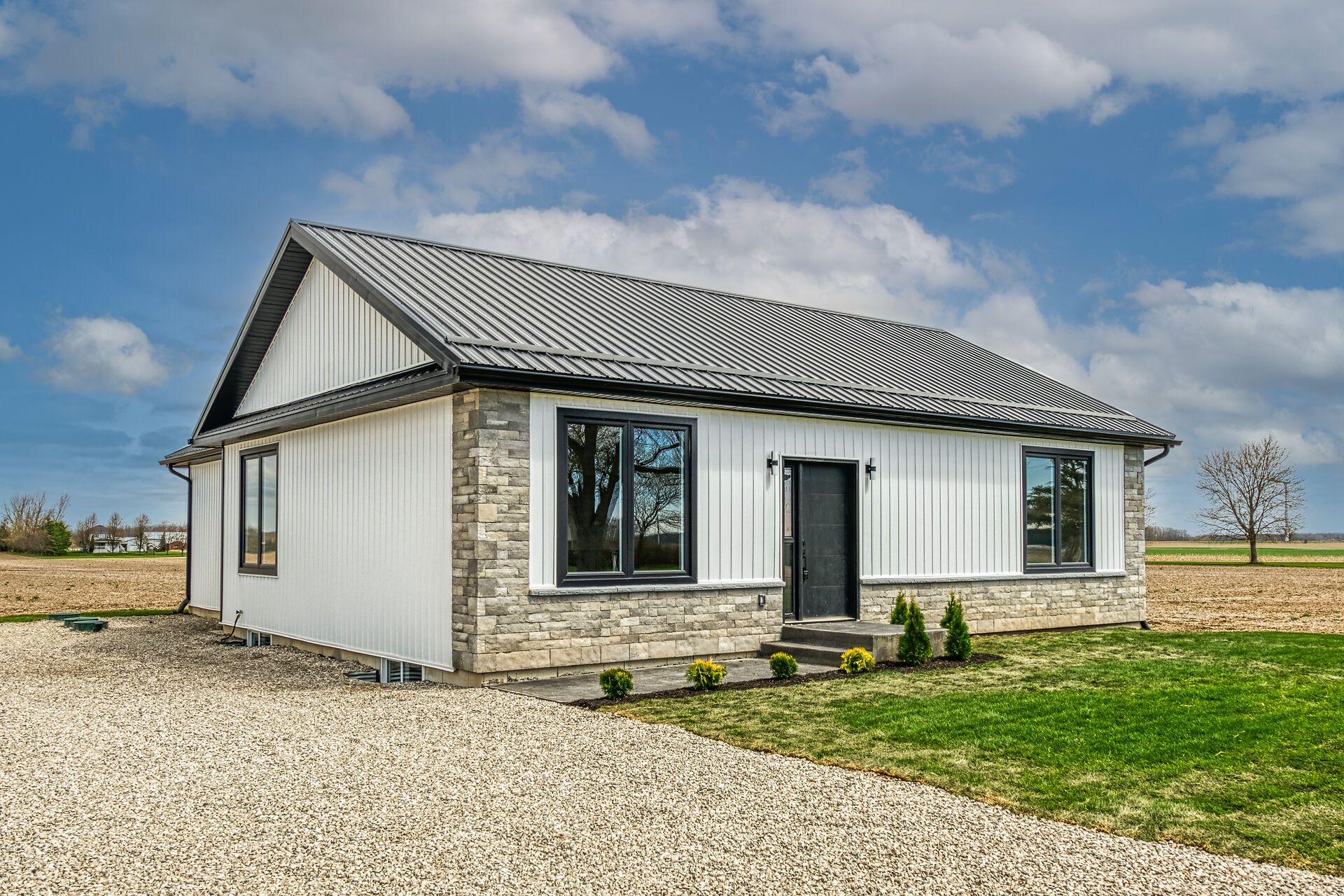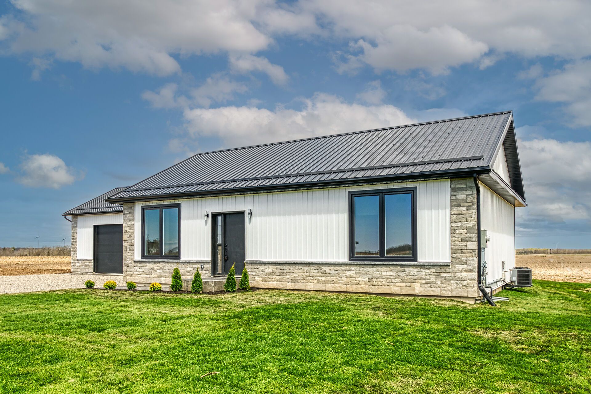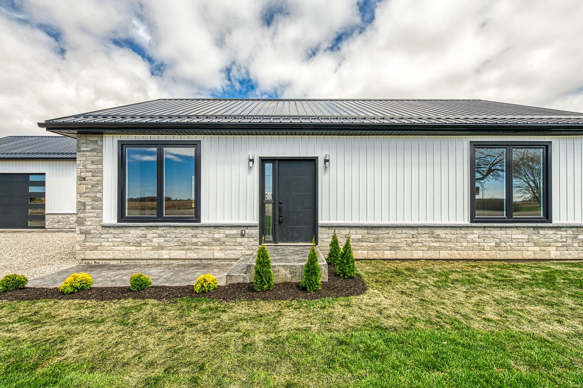 Stunning, custom built 1680 sq ft 3 bedroom, 2 bathroom bungalow with sought after 25' x 30' detached garage with concrete floor all situated on private country lot with 155 ft of frontage on rainham road. Incredible curb appeal with stone & complimenting vinyl sided exterior, welcoming front stamped concrete walkway, detached garage, & desired steel roof. The gorgeous open concept interior offers high quality finishes throughout highlighted by custom kitchen with quartz countertops & eat at island, dining area, living room with built in fireplace, 3 spacious bedrooms including primary bedroom with chic 5 pc ensuite with herringbone tile flooring, additional 4 pc bathroom, & mf laundry. The unfinished basement is fully studded and insulated allowing for it to be easily finished to add to overall living space and provides ample storage. Upgrades include high end finishes throughout including premium flooring, fixtures, pot lighting, quartz counters, & more! Quality workmanship throughout this custom built home.