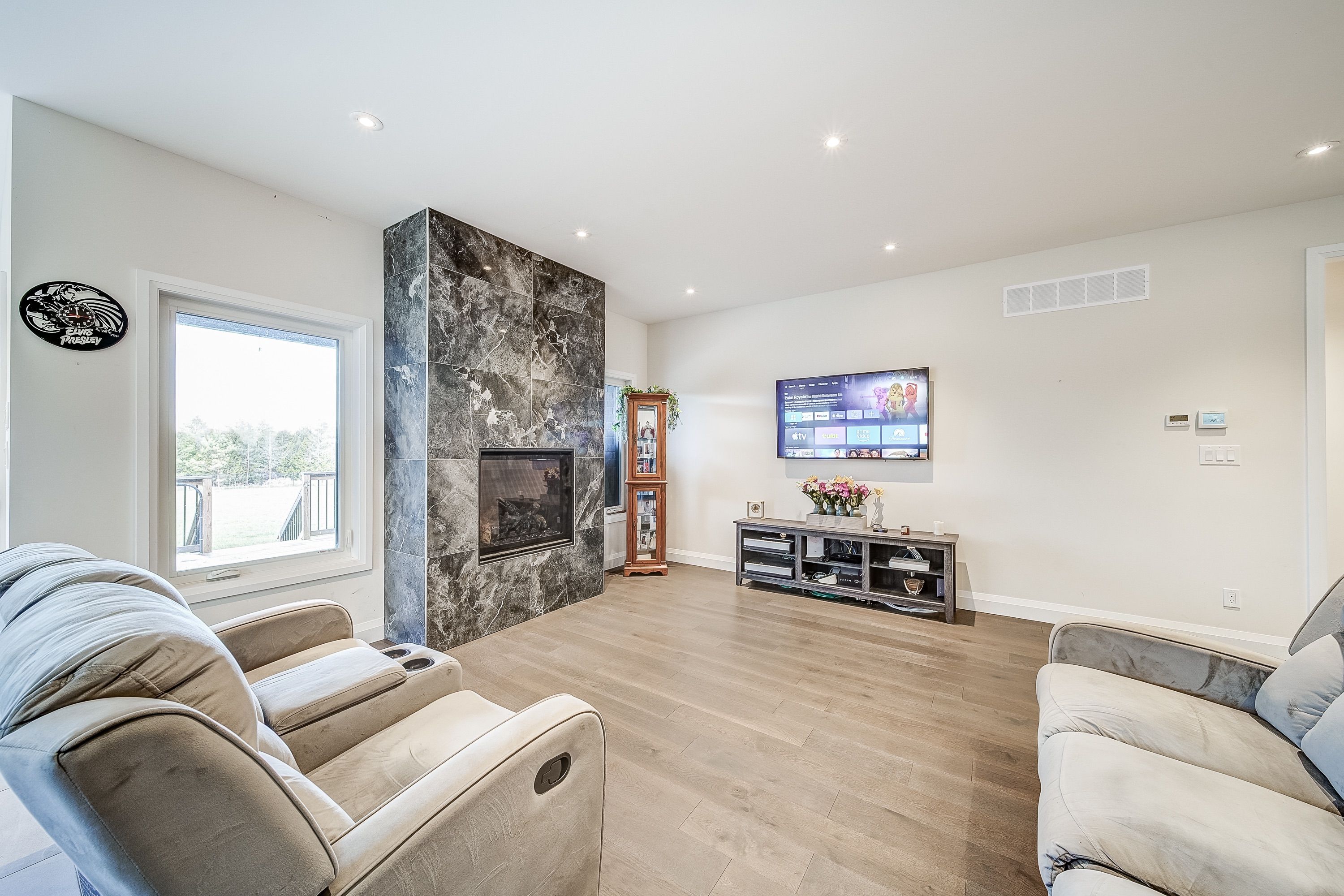 Welcome to a modern country home set on a spacious, professionally graded and level lot with peaceful tree lined surroundings. Built in 2021, this custom bungalow offers 1775 square feet of main floor living with mechanical systems and construction features rarely found in typical country homes. Featuring geothermal heating and cooling, a premium slate style metal roof rated for 70 years, and a full hrv air exchange system, this property is engineered for durability, comfort, and long term operating efficiency. Located just 10 minutes to both stayner and wasaga beach and 30 minutes to barrie, this home offers quiet rural living with easy access to nearby amenities. Inside, the open concept floor plan provides a bright and inviting living space highlighted by a floor to ceiling fireplace, spacious kitchen with quartz surfaces, stainless steel appliances, and walkout to the backyard. The home includes three main floor bedrooms including a generous primary suite with walk in closet and five piece ensuite with jetted tub. The main floor also features a second full bathroom. The basement is partially finished and includes radiant in floor heating for exceptional winter comfort, two bedrooms, and a completed three piece bathroom, with remaining space ready for future finishing. Additional systems include a propane boiler, privately owned propane tanks, well water with ultraviolet sterilization, water softener, oversized septic system, privately owned hot water tank, and 200 amp service with hydro disconnect ready for future off grid capability. Additional features include an insulated and drywalled garage with attic storage, whole home speakers in key rooms, central vacuum, alarm system, eight camera surveillance system, fourteen car paved driveway, and fully fenced perimeter. This property offers advanced infrastructure and efficiency rarely seen in comparable rural homes.