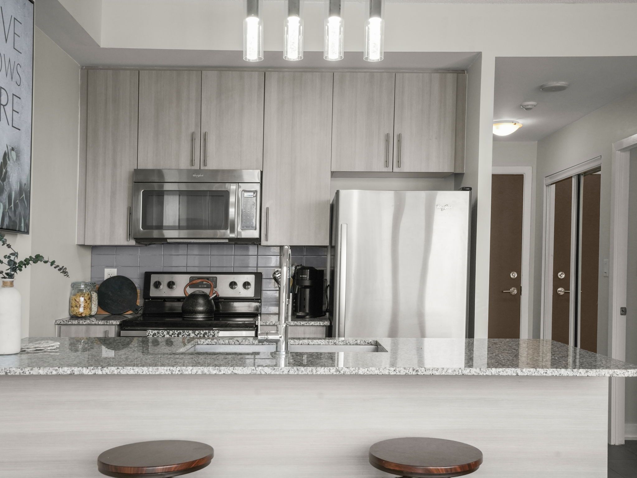 • Upgraded kitchen features granite countertops and stainless steel appliances.