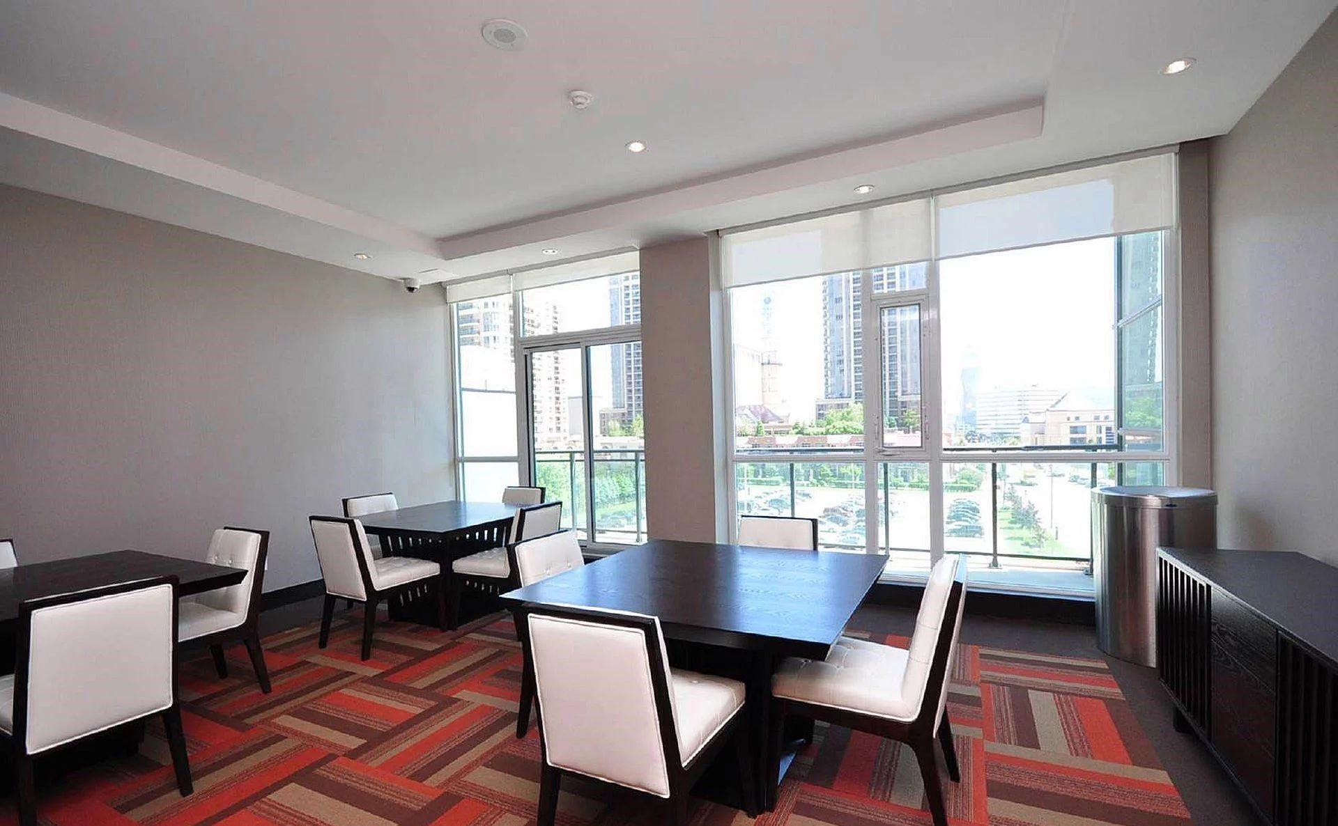 • Modern high-rise in Mississauga's vibrant downtown with floor-to-ceiling windows.