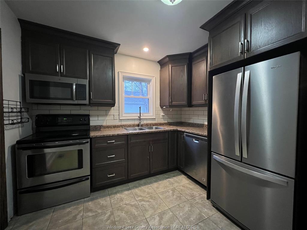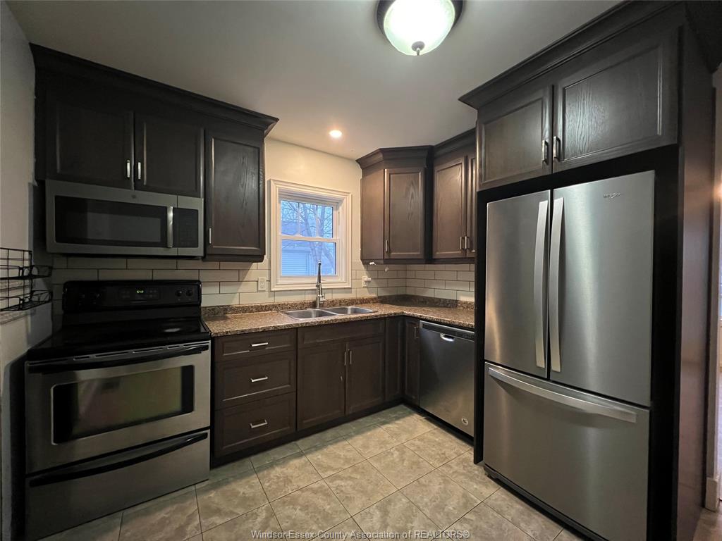 • Updated kitchen featuring stainless steel appliances and stylish backsplash.