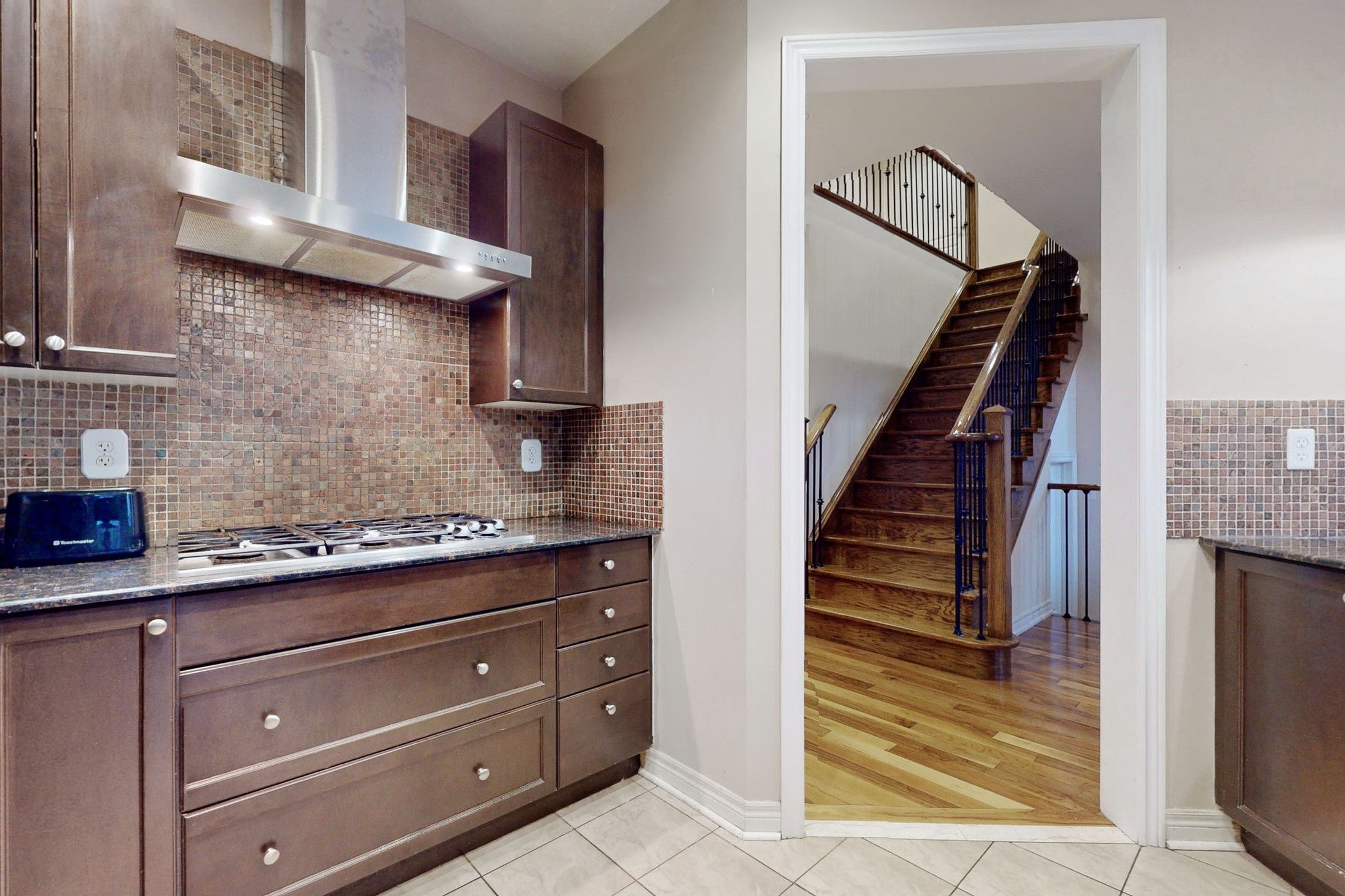 • High-end kitchen appliances with granite counters and plenty of storage.