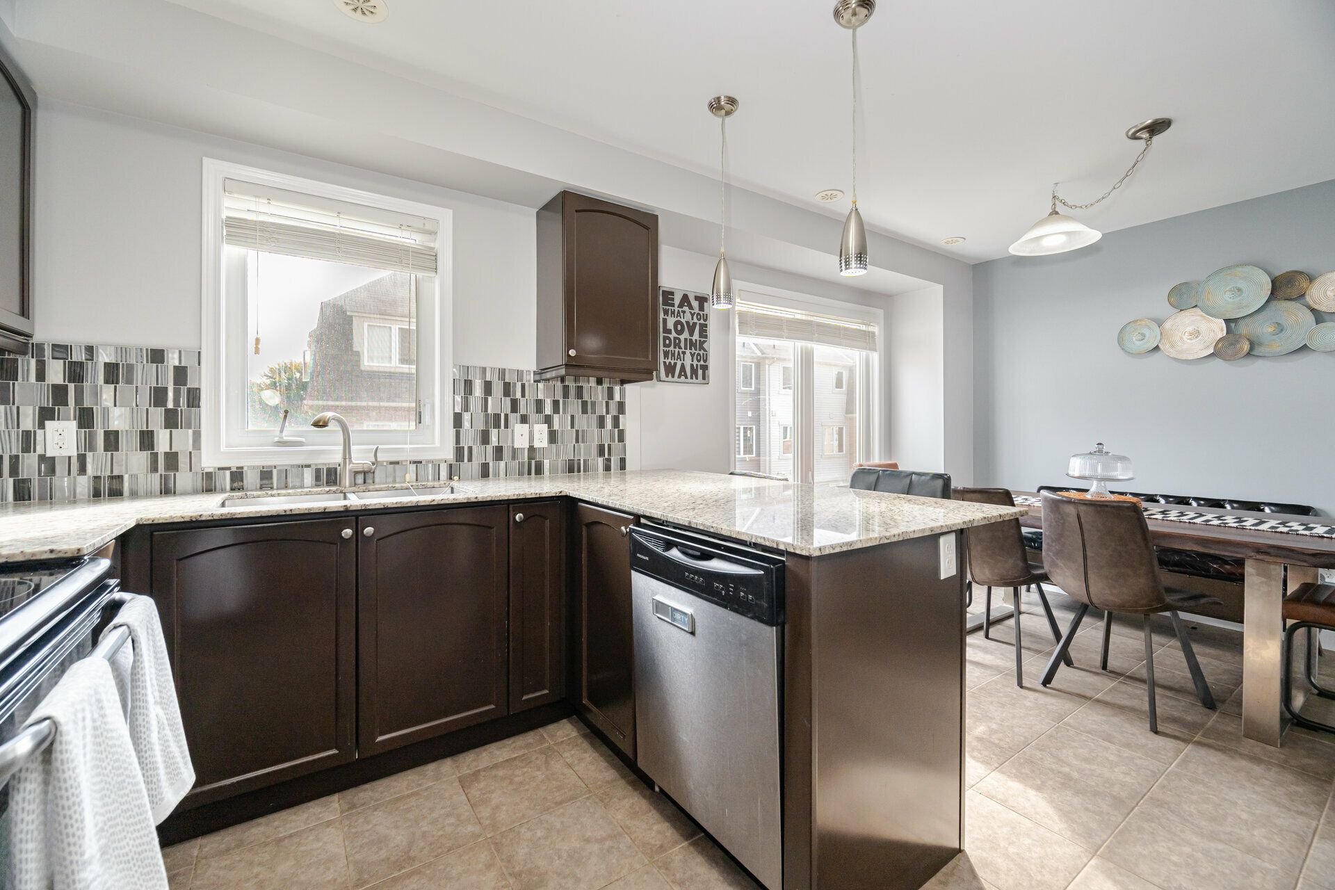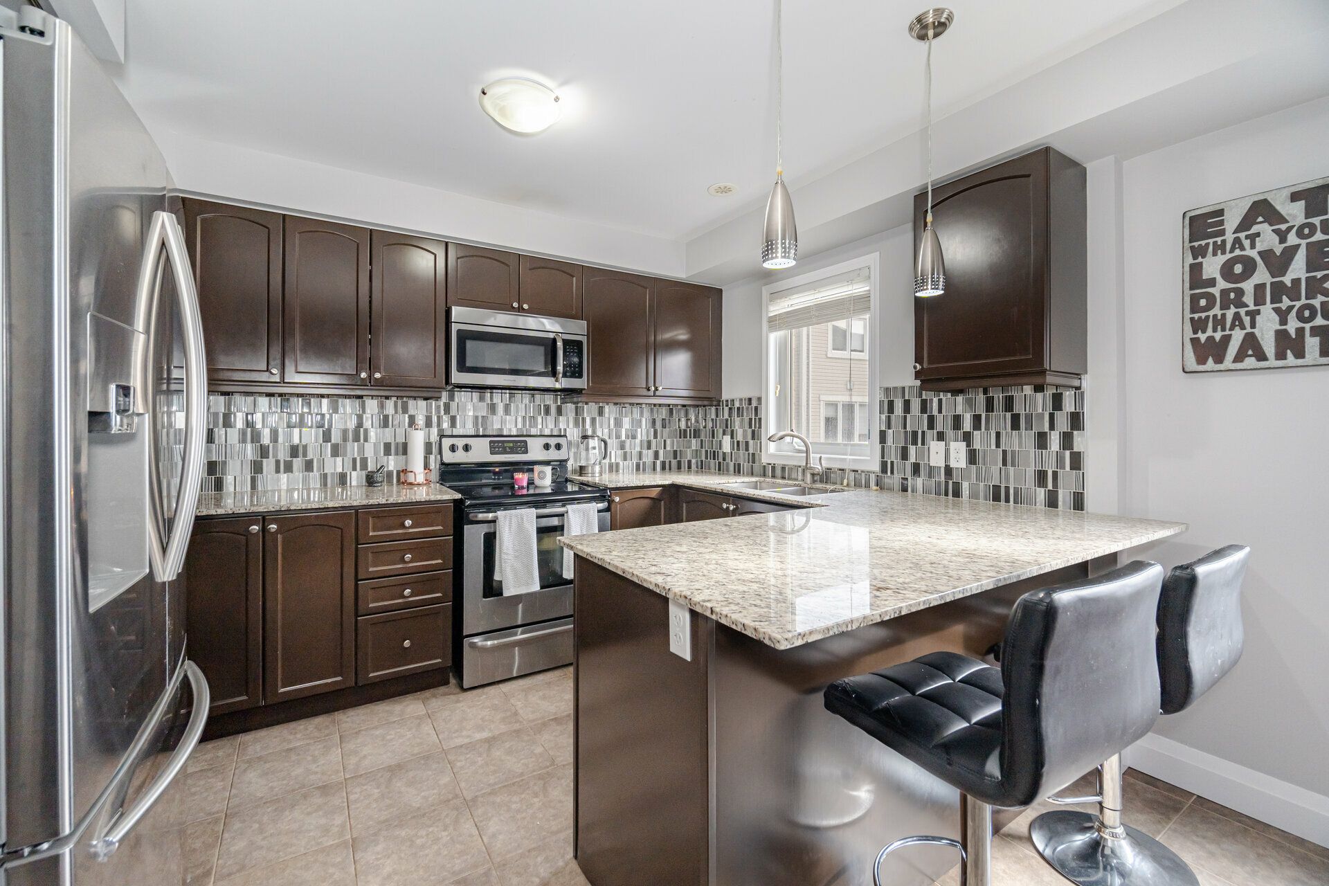 Welcome to this beautifully maintained freehold mattamy-built end unit, designed to feel like a semi-detached home. With a spacious and functional layout, this property offers the perfect blend of style, comfort, and convenience. Featuring 3 bathrooms and a bright, open-concept main floor, the home provides a generous living area ideal for relaxing or entertaining. Large windows flood the space with natural light, creating a warm and inviting atmosphere. The modern kitchen is a chef's delight, complete with stainless steel appliances, quartz countertops, a large center island, and ample cabinetry. A breakfast bar adds a convenient casual dining option, while the adjacent dining area makes hosting effortless. Upstairs, the spacious primary suite includes a private en-suite bathroom, providing a peaceful retreat at the end of the day. Two additional well-sized bedrooms offer plenty of room for family, guests, or a home office. The fully finished basement features a walk-out with direct garage access, adding functionality and versatility to the space. Step outside to your private, enclosed backyard the perfect spot to enjoy your morning coffee or unwind in the evening. Located in a highly desirable neighborhood, this home is just a short walk to the mount pleasant go station, and close to parks, shopping, dining, and top-rated schools. ? Don't miss this incredible opportunity to own a move-in-ready home in a prime location!