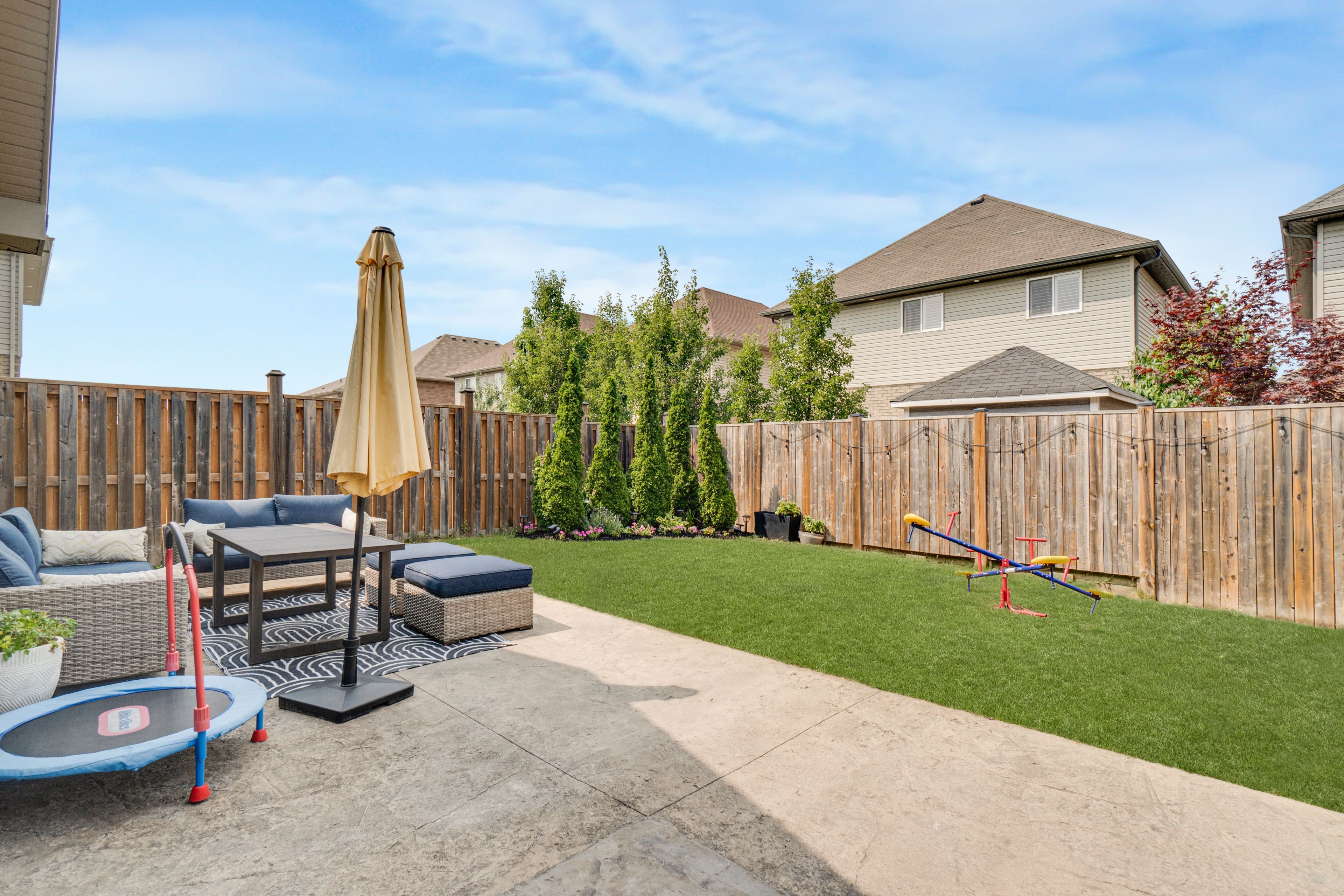 • Fenced yard includes a stamped concrete patio and gas line for grilling.