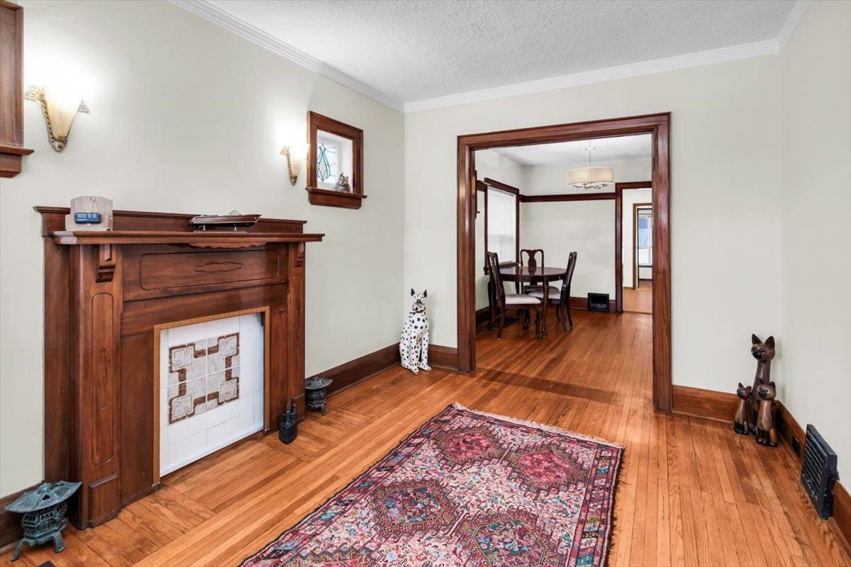 • Open-concept living and dining room with charming wood details.