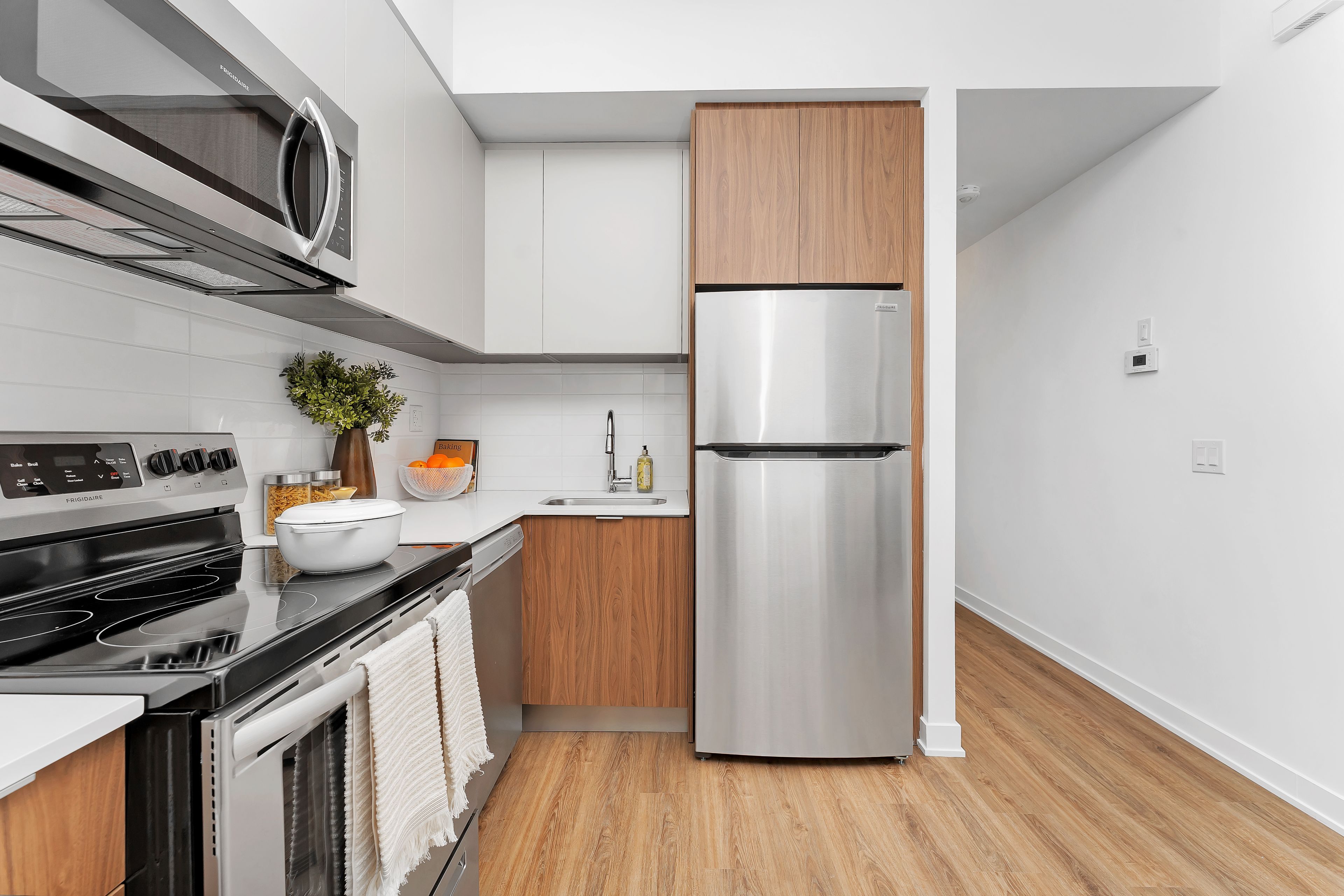 • Modern kitchen with stainless steel appliances and stone countertops.