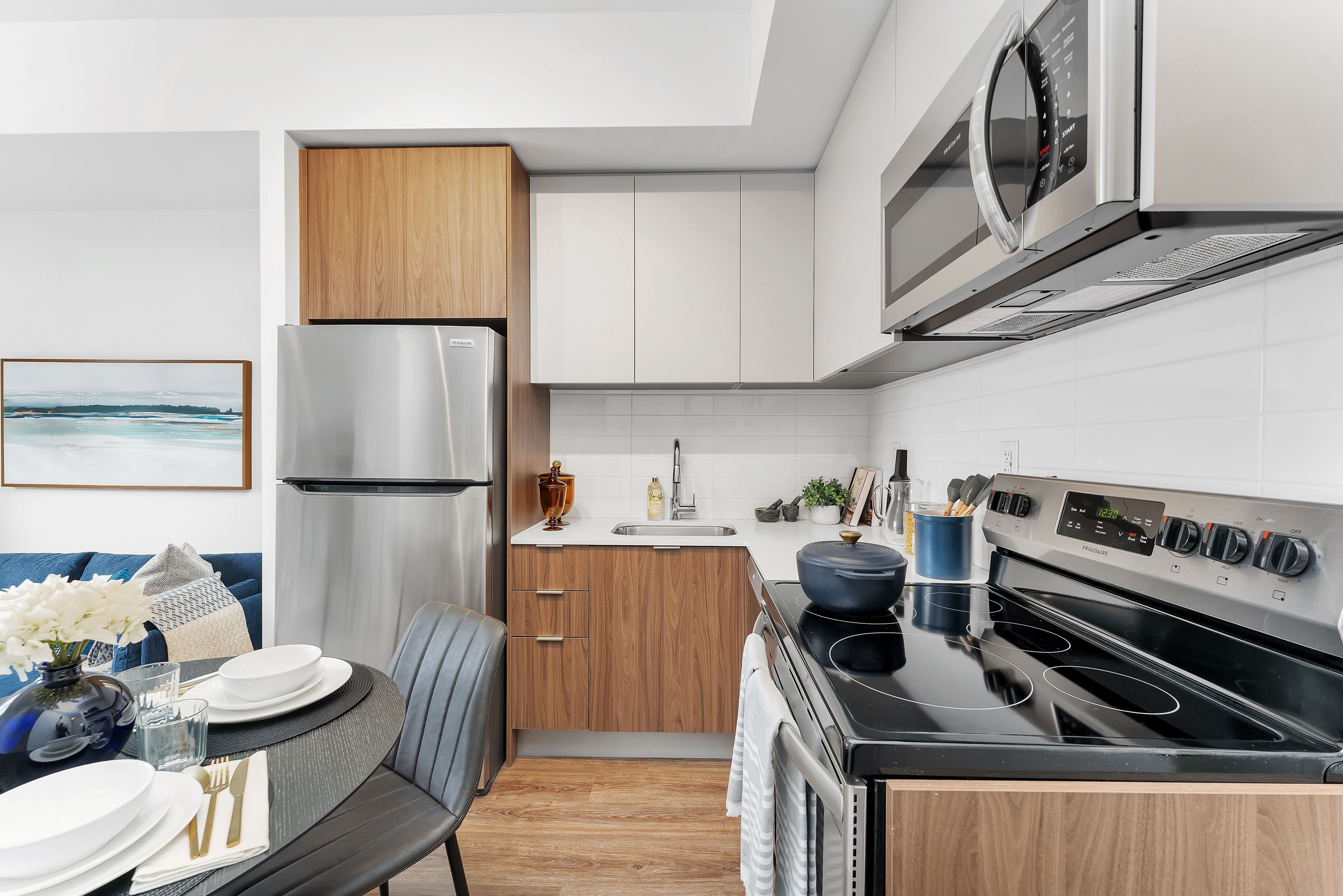 • Modern kitchen with stainless steel appliances and ample storage space.