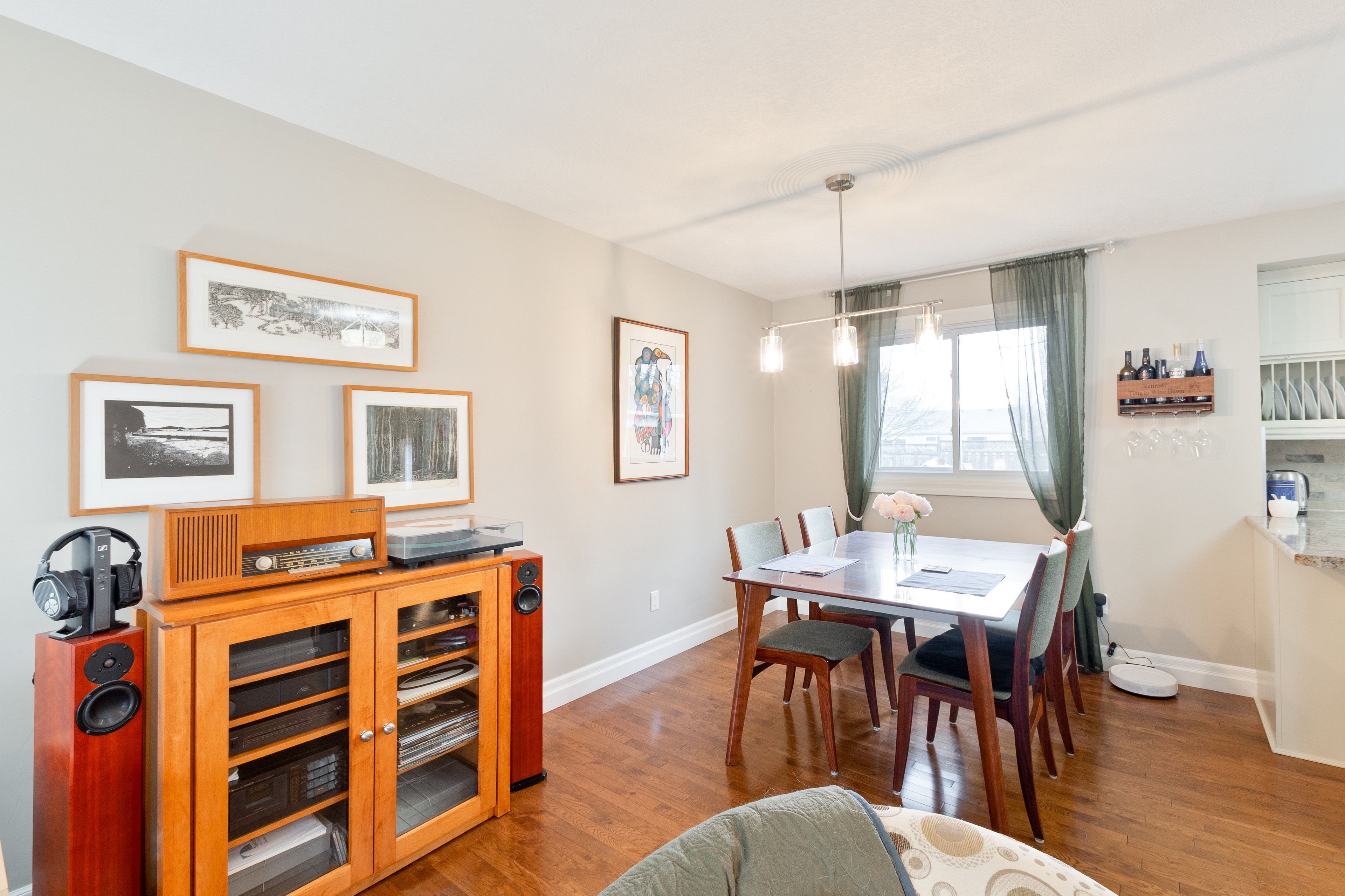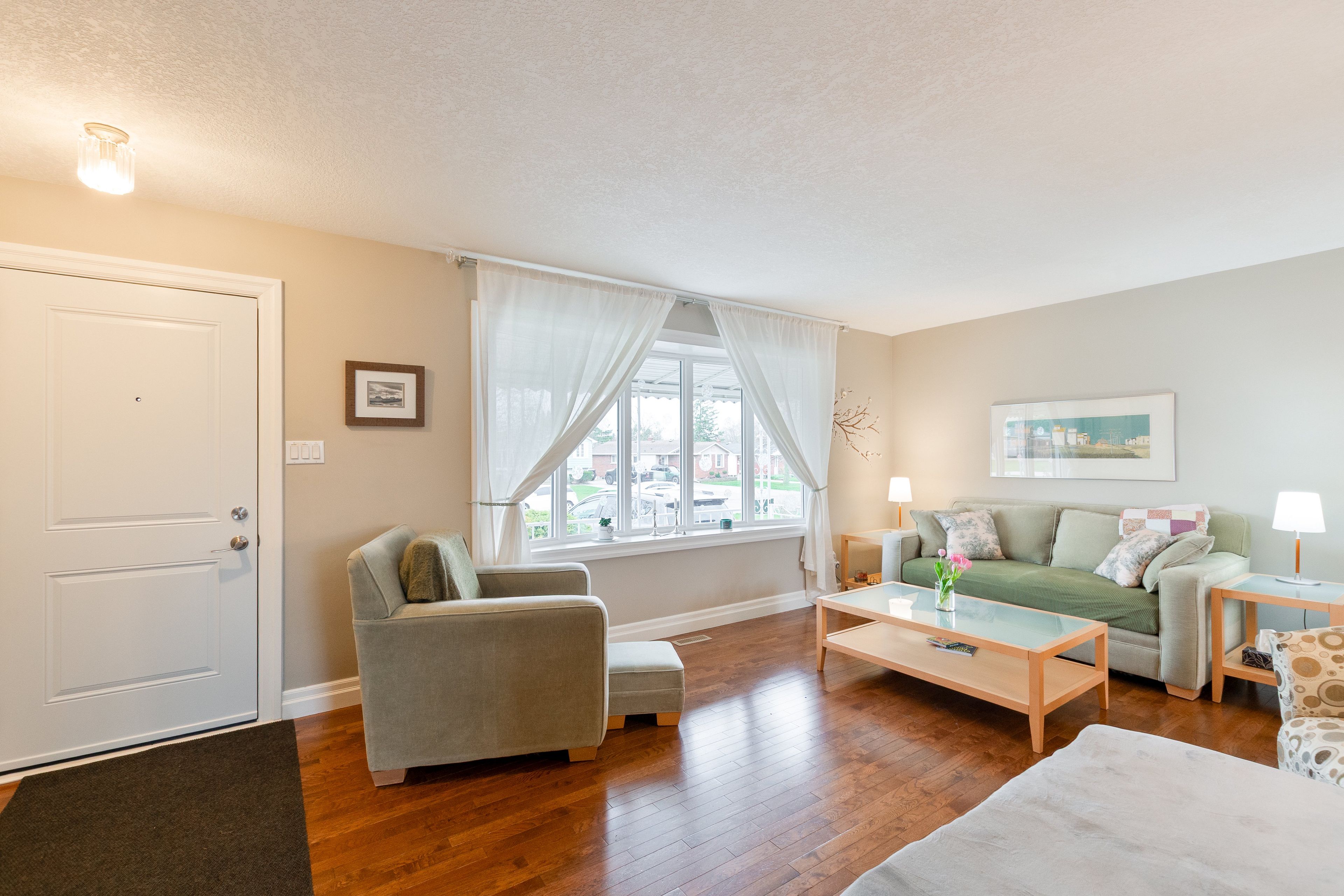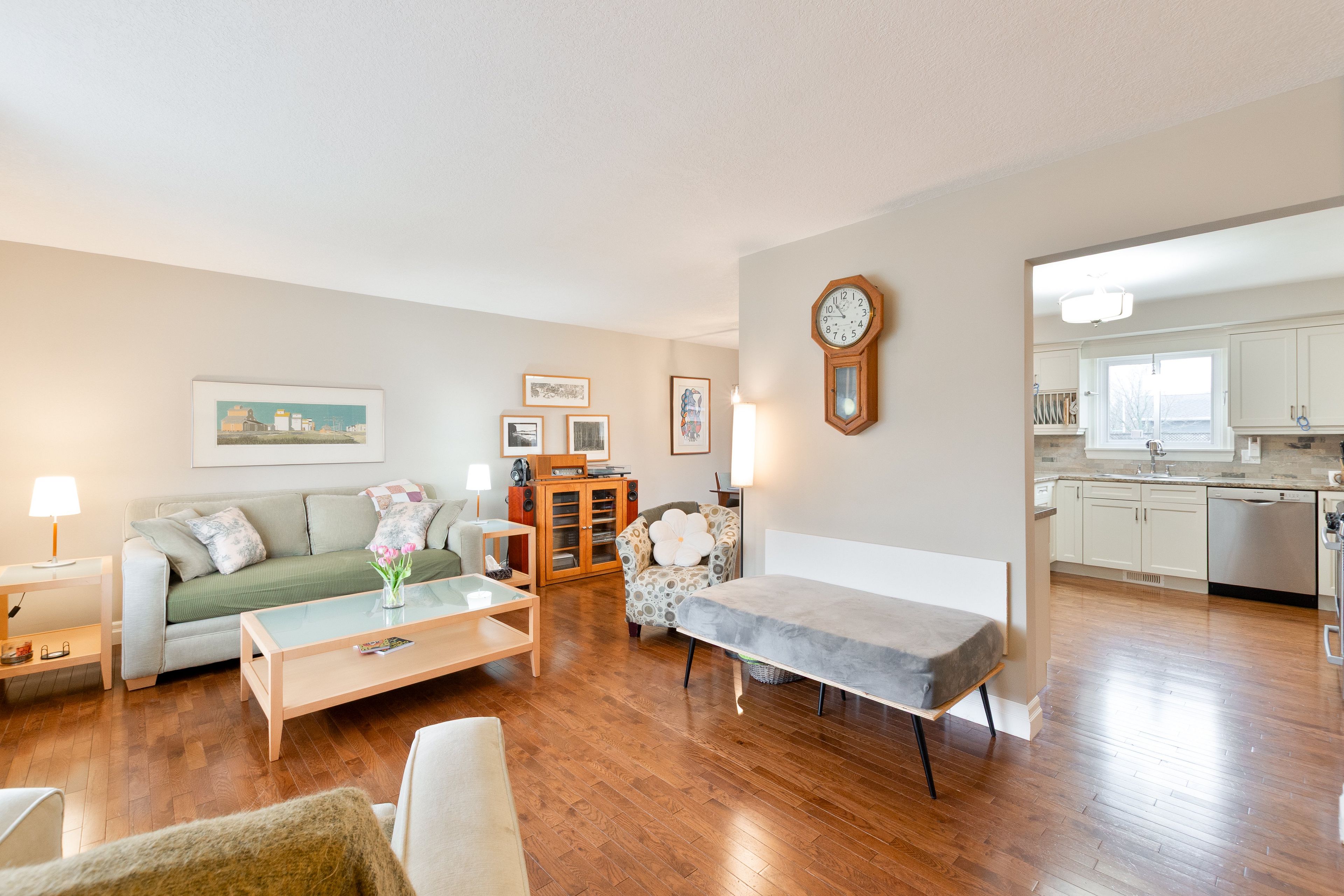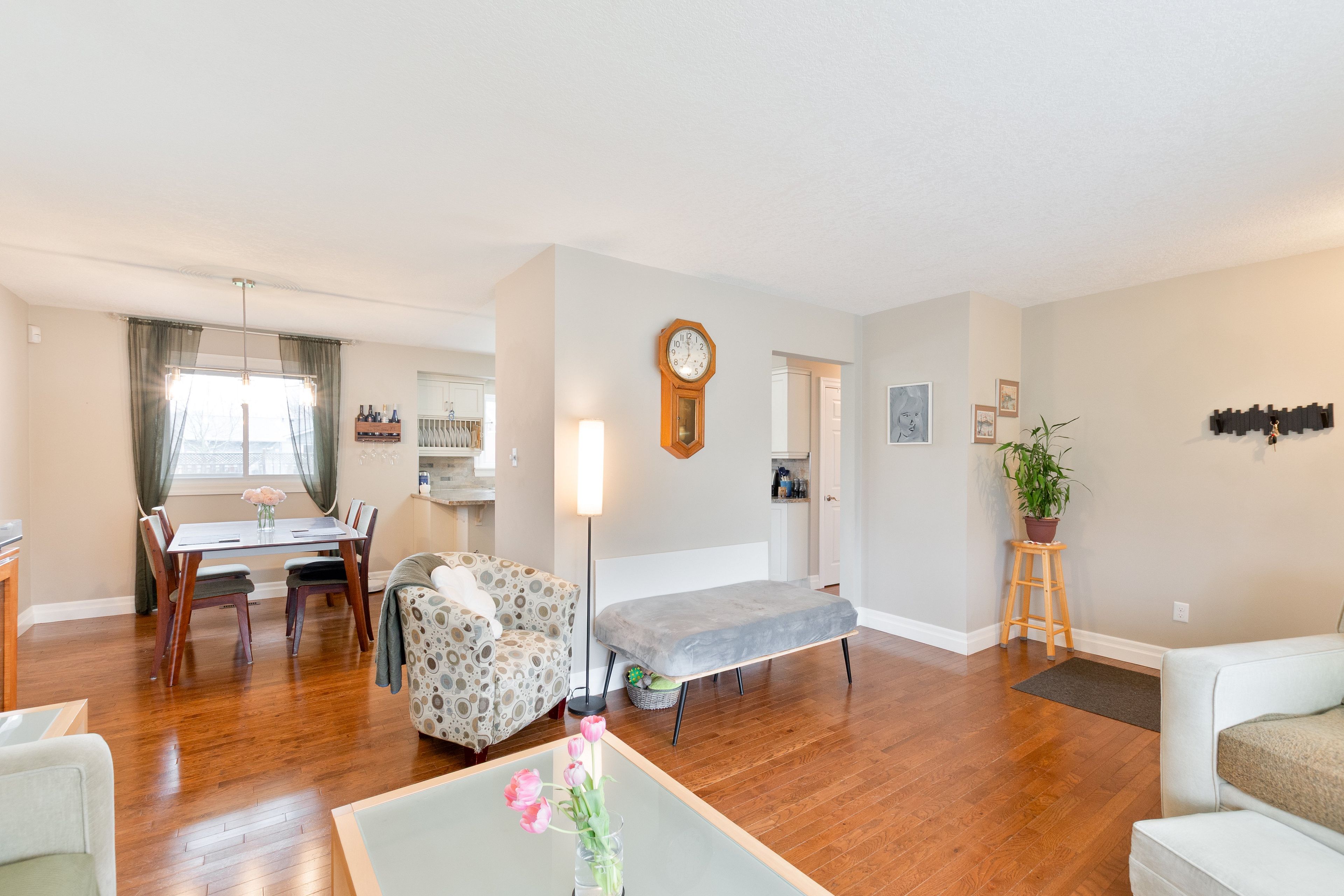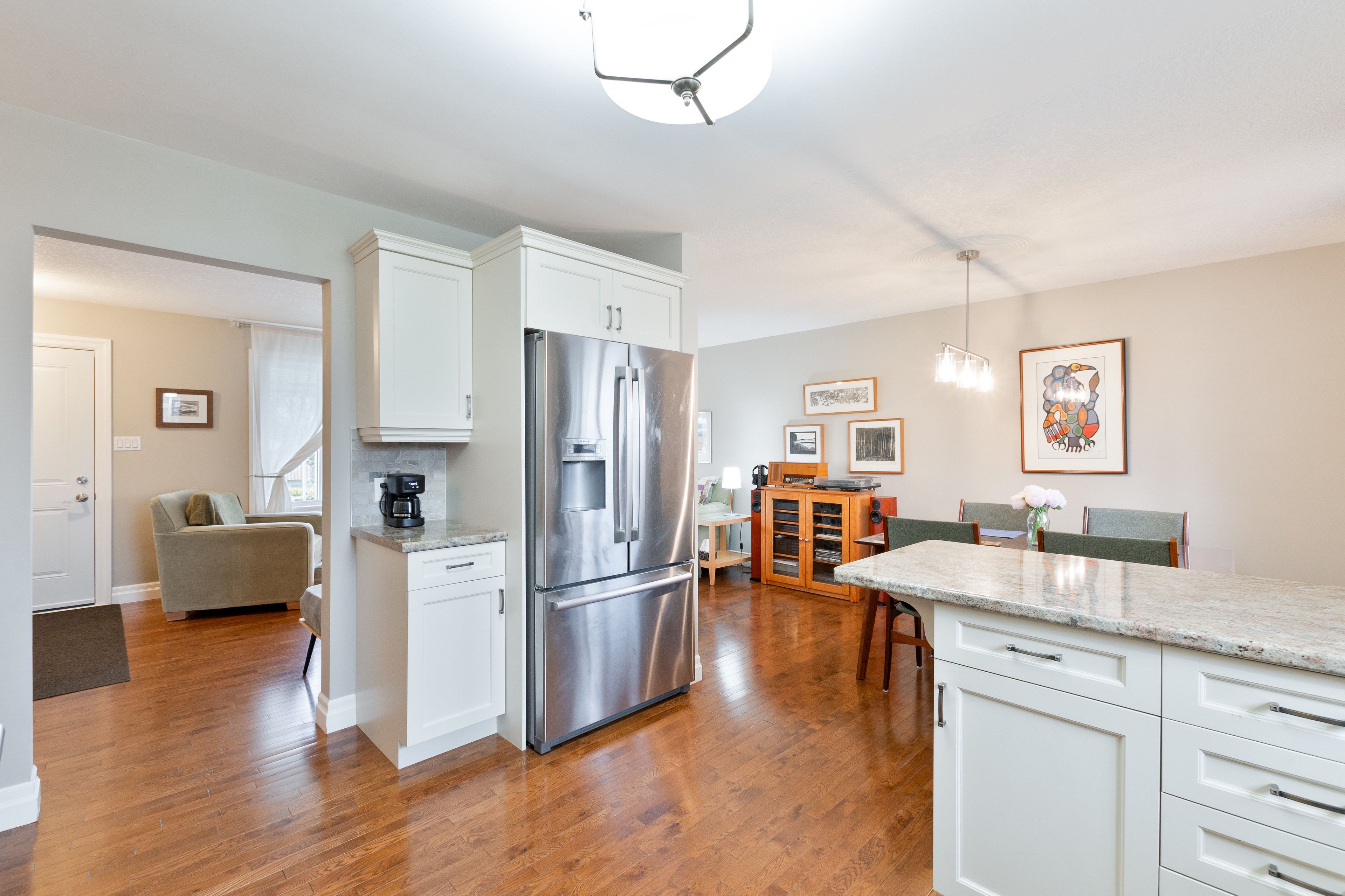 • Open-concept living area features beautiful hardwood floors and ample natural light.