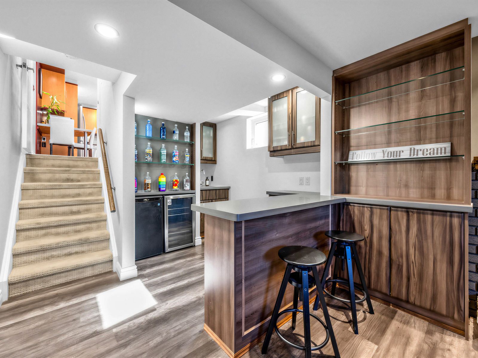 • Backsplit family room includes a fireplace, bar area, and heated floors.