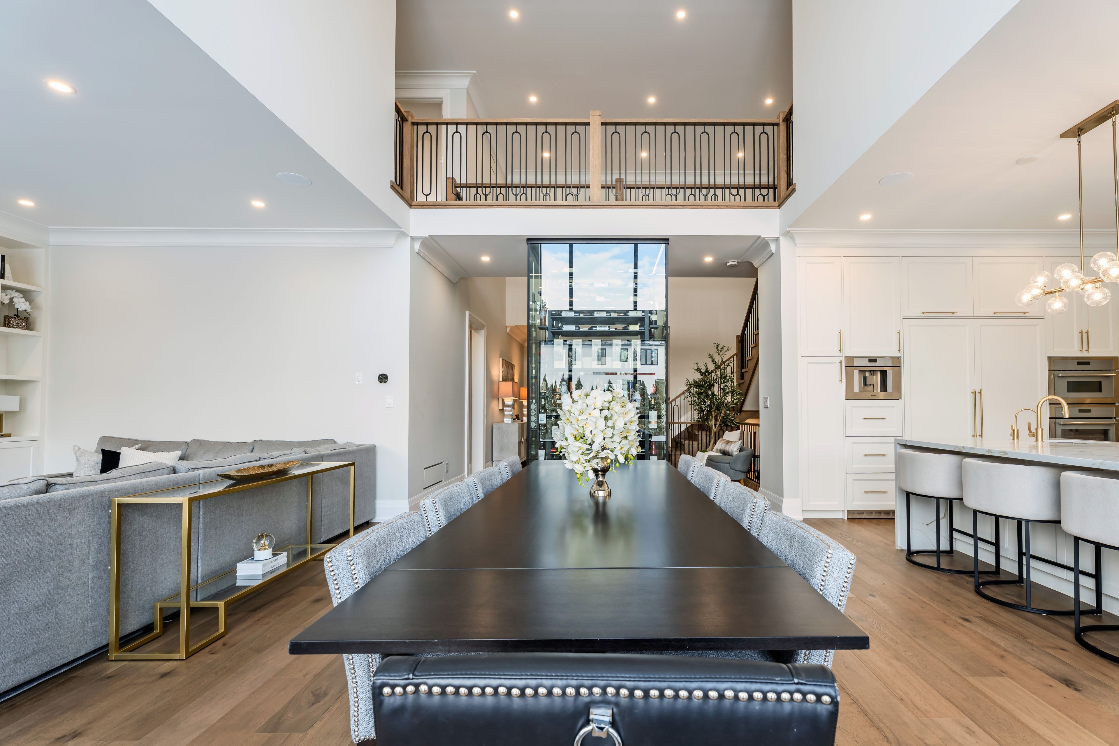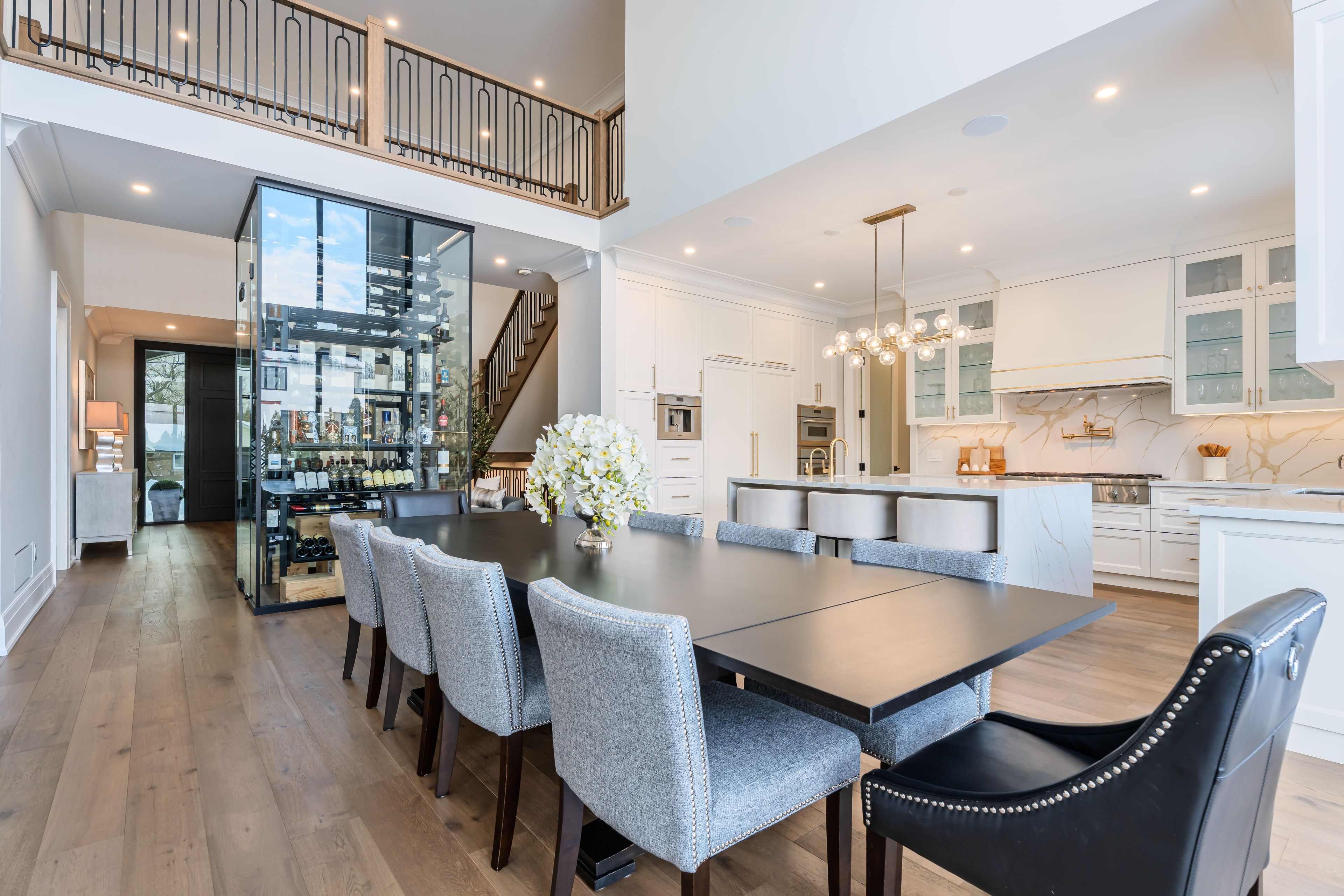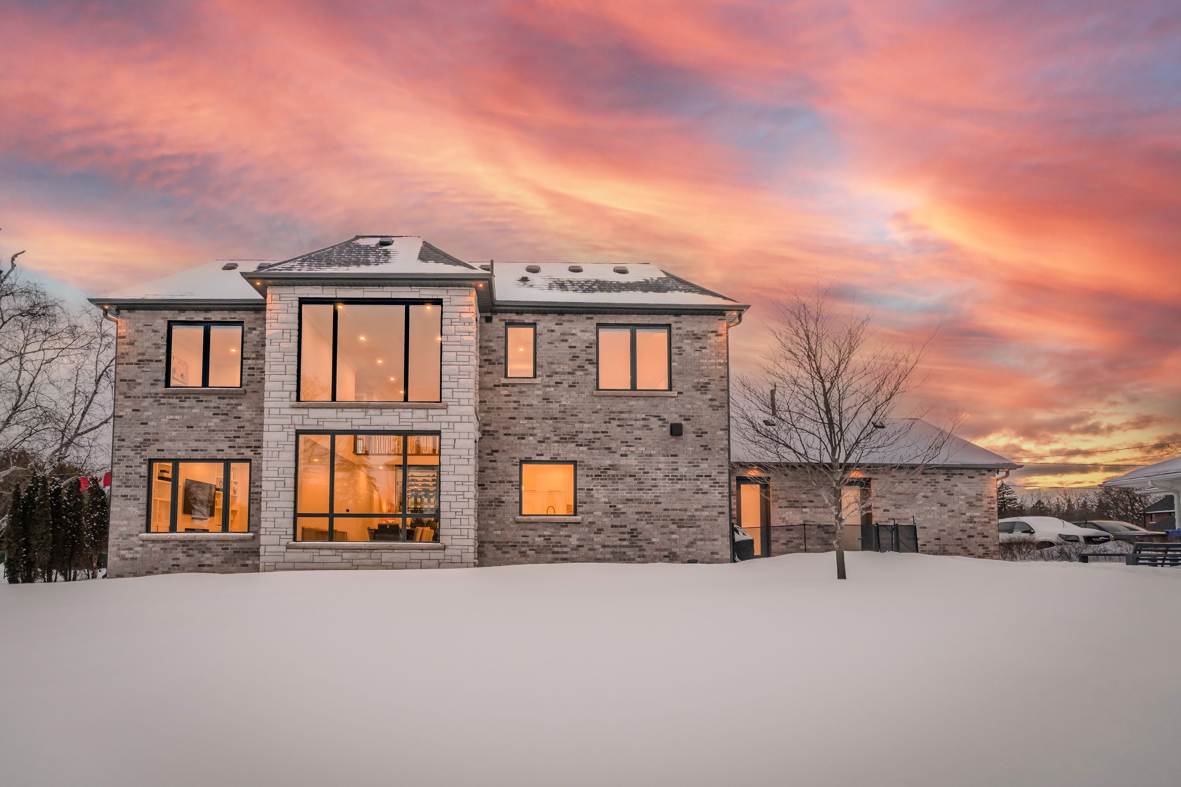Luxury custom-built executive residence, perfectly tailored for multigenerational living. This striking property showcases timeless stone craftsmanship, a custom 11 ft front door and an oversized 3. 5 car garage - ideal for car enthusiasts! Designed with both everyday comfort and upscale entertaining in mind, the main floor features a spacious primary bedroom retreat- ideal for elderly parents, extended family, or a live-in nanny- offering privacy and convenience without compromising luxury. The foyer features a striking custom wine cellar, complete w/a cooling system & capacity for 300 plus bottles-a wine connoisseur's dream. The heart of the home is the stunning custom kitchen w/large centre island w/breakfast bar, built-in thermador appliances and a generous servery with additional storage and a rare walk-in cooler. The kitchen's large eat-in area features soaring cathedral ceiling & expansive windows that floods the space with natural light & overlooking the inviting family room w/custom built-ins & a fireplace. The main floor also features a home office w/built-in cabinetry, perfectly suited for remote work or study. A large mudroom w/access door into garage & walk-out to yard plus a stackable washer/dryer. Upstairs, you will find an additional primary bedroom w/a large 5 piece ensuite with oversized glass steam shower & separate soak tub & a large walk-in closet. There are also two additional bedrooms each w/their own ensuite bathrooms & walk-in closets. Plus an additional upper level laundry room w/large window, b/i cabinetry & counters. This exceptional home masterfully blends elegance, functionality & flexibility!