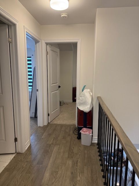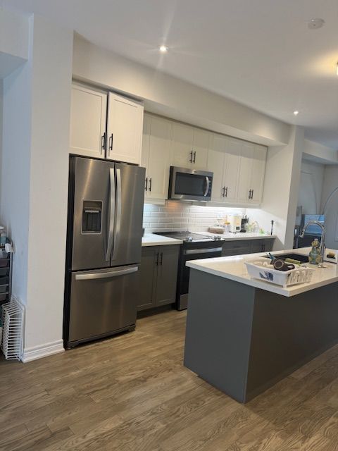 Elegant less than 2-year-old 3-bedroom, 3-bathroom town home in a peaceful neighborhood featuring modern finishes and a functional layout. The bright open-concept main floor connects the living and dining areas to a contemporary kitchen granite countertops, stainless steel appliances, island breakfast bar and ample cabinetry, plus a walk-out to a private deck perfect for relaxing or entertaining. Upstairs, the spacious master bedroom suite features a private ensuite and generous closet space. Two additional well-sized bedrooms and a full bathroom. Rec room at ground level can be used as a 4th bedroom. Additional highlights include the unfinished basement can be used as working /playing area / as an additional storage area and 2 parking spots total in the driveway and garage. Garage access from ground floor from inside door. The additional visitor parking available at common parking spots. Home is located just steps from a golf course and surrounded by established, high-end homes. Utilities are additional. Close to public transit, highways 410 & 407, shopping, parks, restaurants, go station and reputed schools.