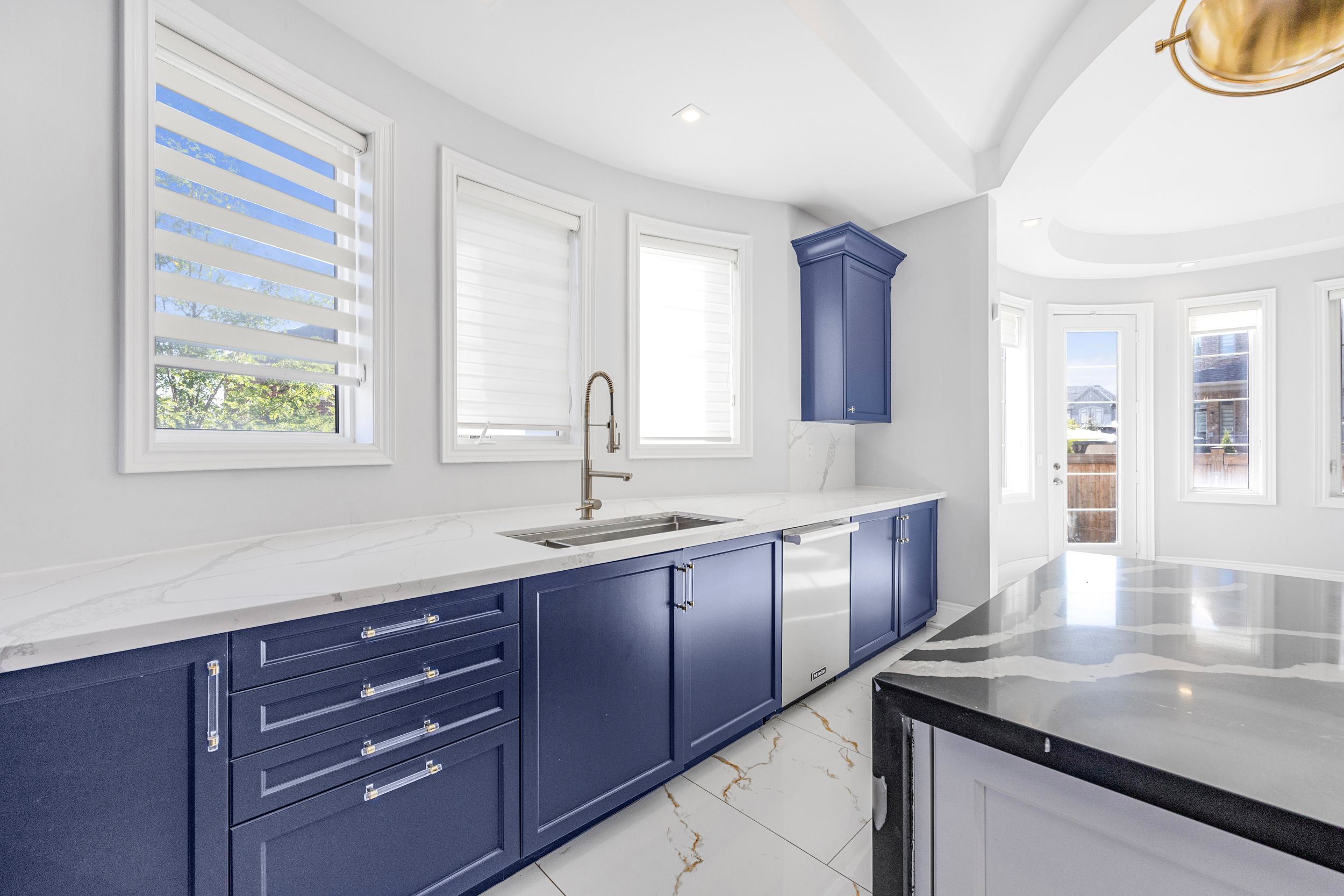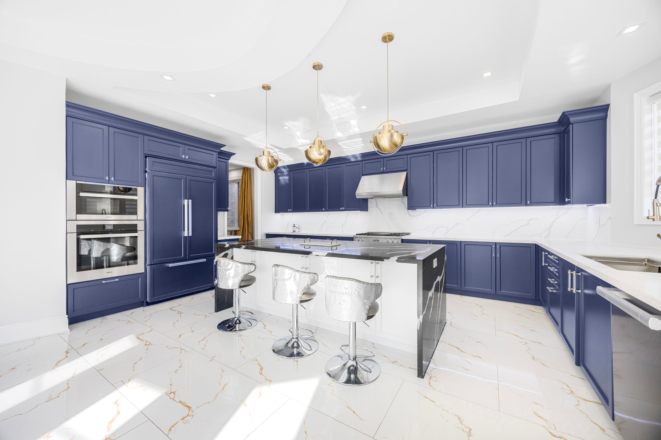 • Chef-inspired kitchen featuring a striking quartz waterfall island.