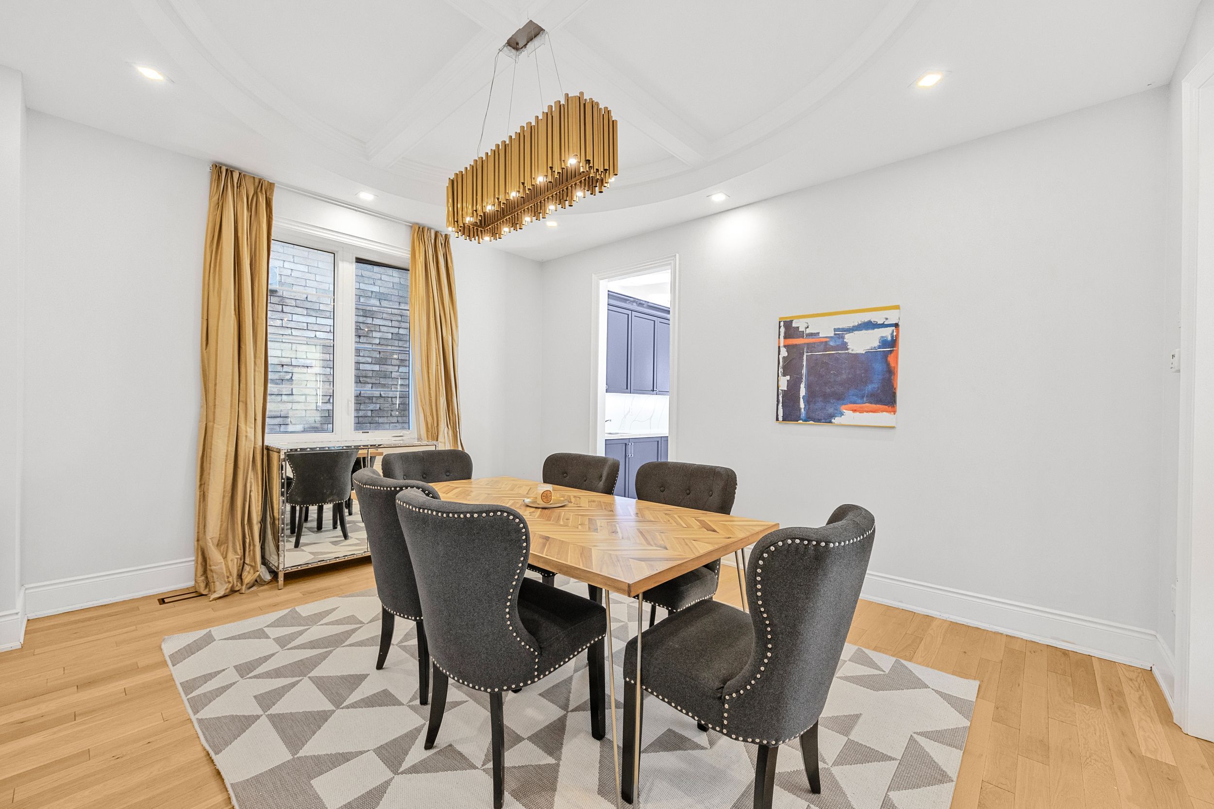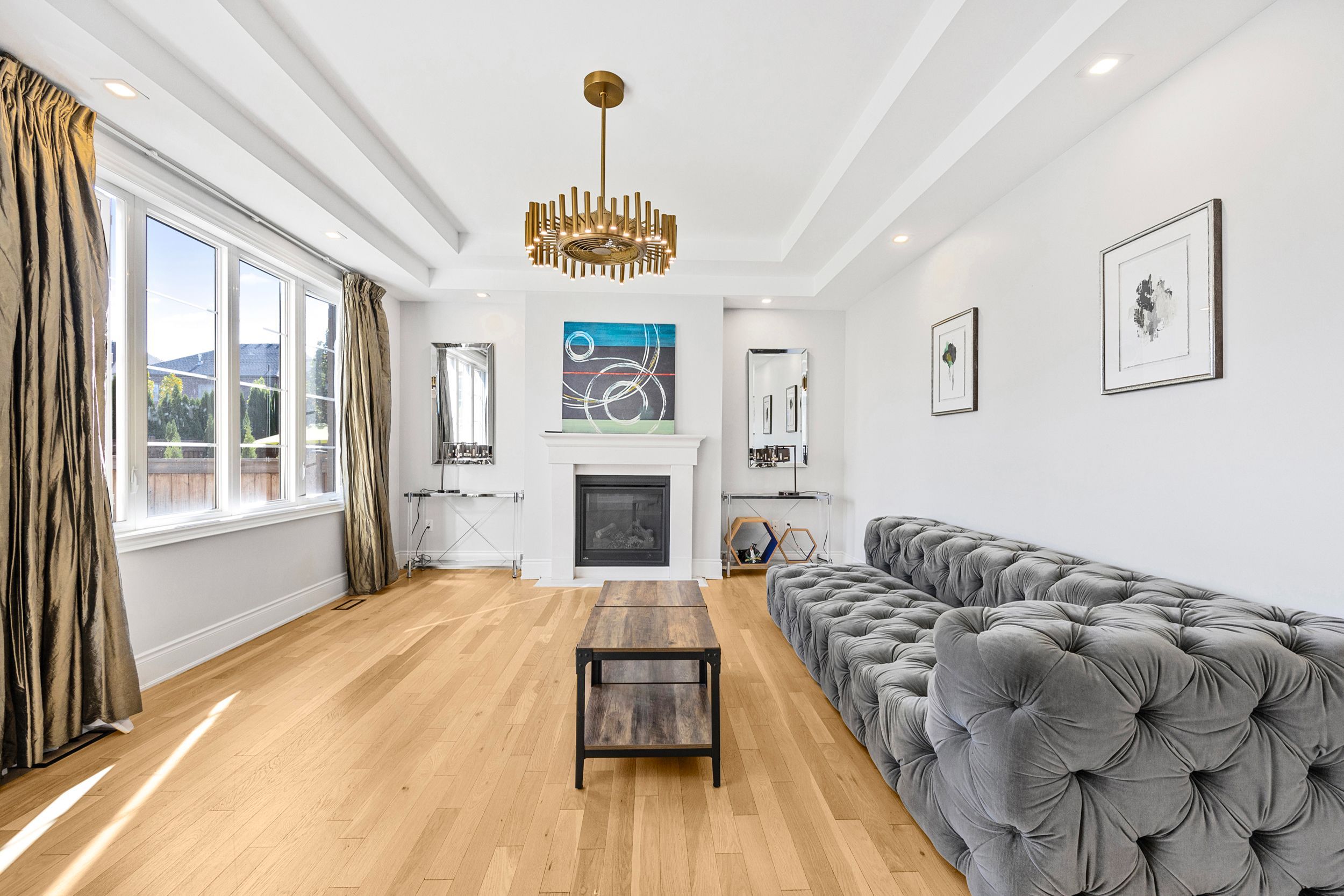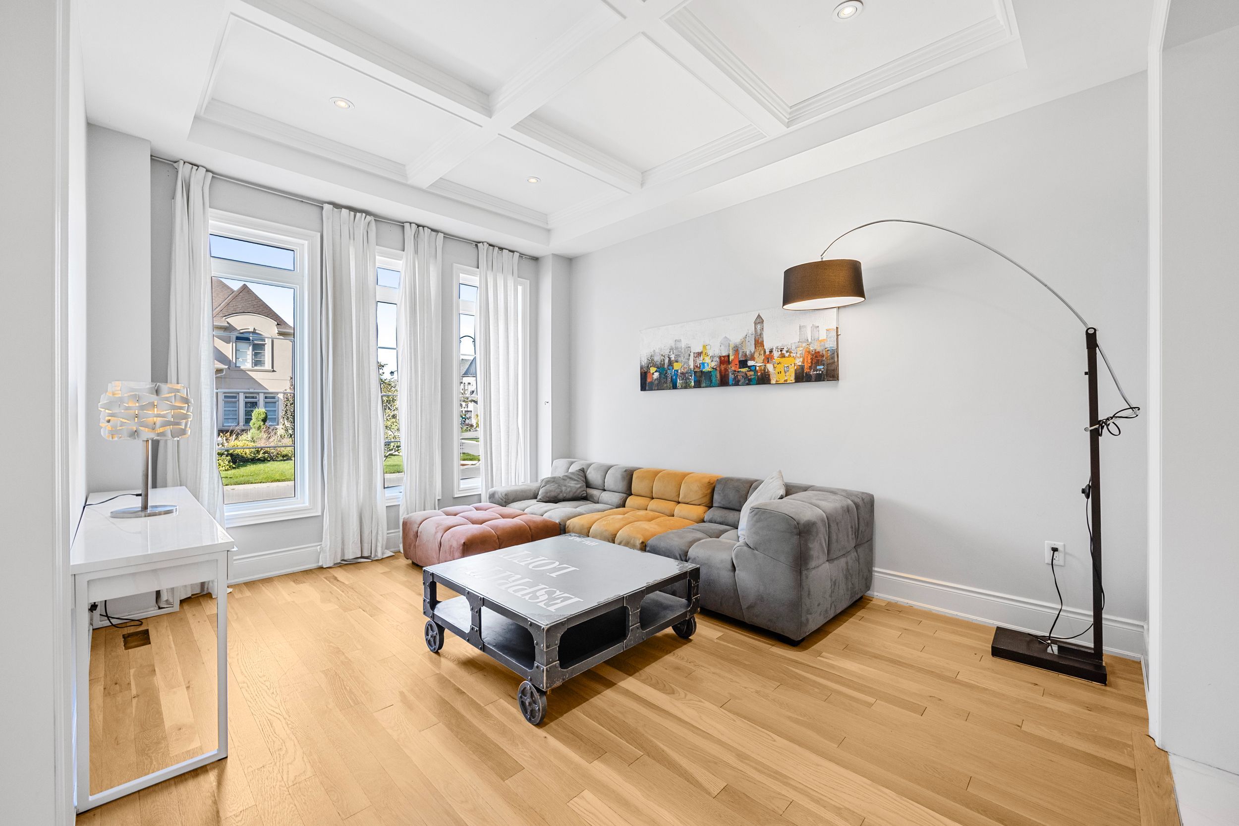 This stunning residence offers approximately 5,000 sq. Ft. Of luxurious living space, complete with a rare tandem three-car garage with ev charger!!! The grand main floor welcomes you with a soaring 21-foot hallway, elegant hardwood flooring throughout, and brand-new hardwood on the second level. Designed with 11-foot coffered ceilings, the home features a chef-inspired kitchen highlighted by a striking two-tone quartz waterfall island. The main level also offers a spacious formal dining room, a bright living room, a cozy family room with a gas fireplace, laundry on main, and a stylish powder room. Upstairs, 10-ft ceilings enhance the sense of openness. Four generously sized bedrooms each include a private ensuite and walk-in closet. A separate media room can easily function as a fifth bedroom. The spa-like primary retreat showcases a sun-filled half-circle sitting area, walk-in closet, and a luxurious ensuite with frameless glass showers. Included: 6 burner gas miele stove, miele oven, fridge, miele dishwasher, front load washer and dryer, custom window coverings and luxury light fixtures, security system.