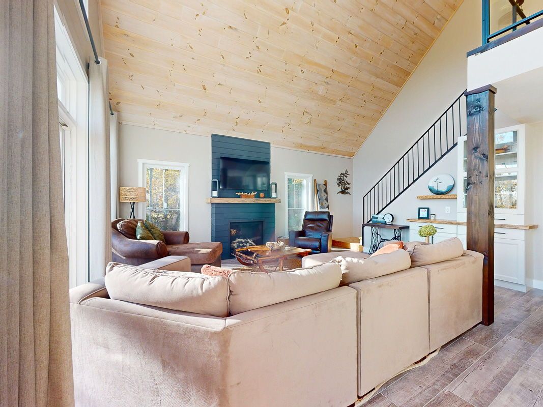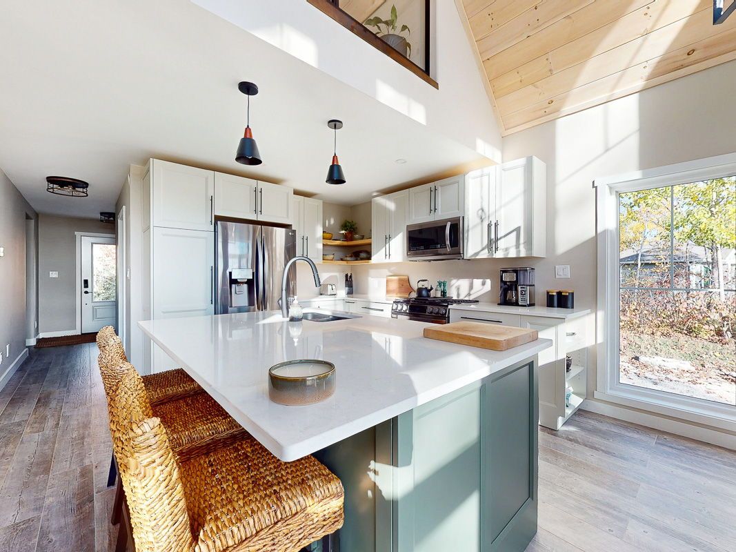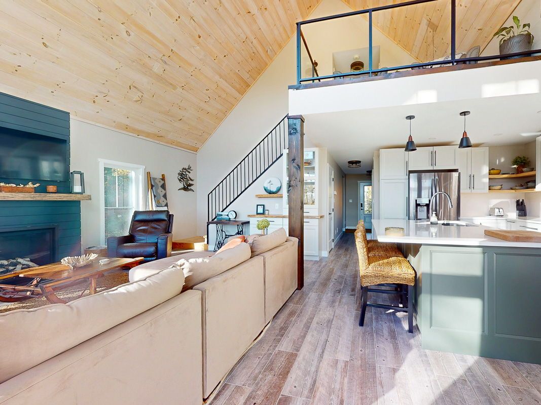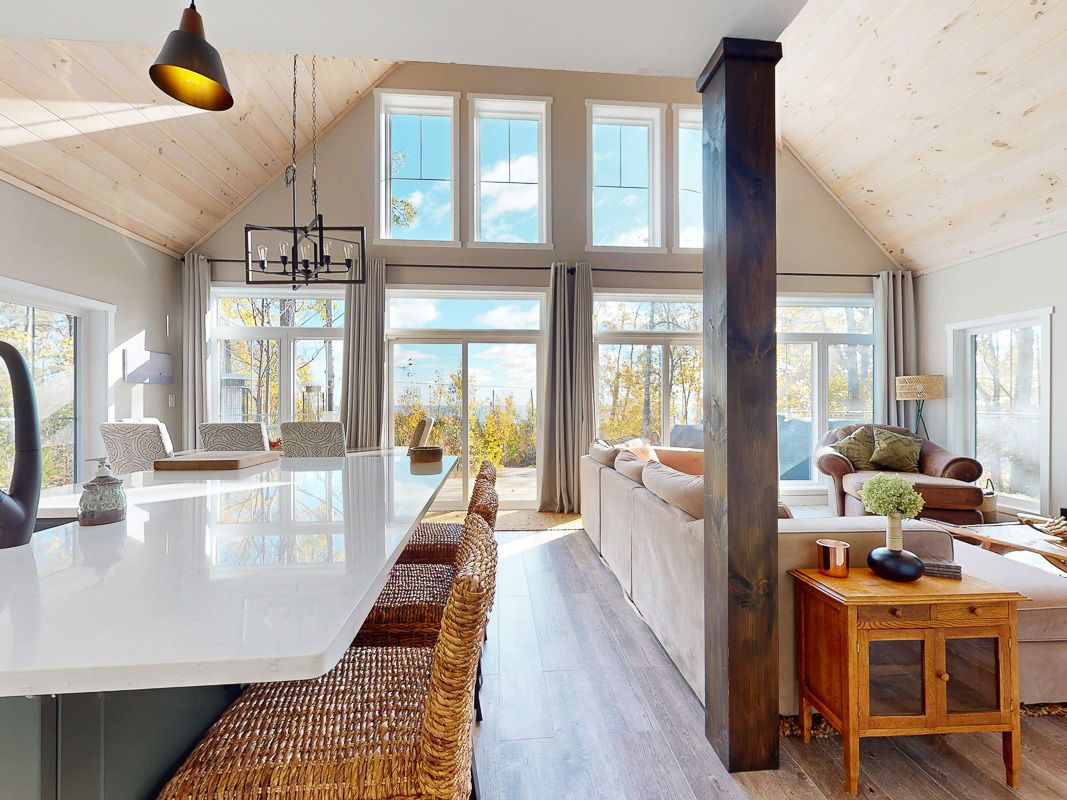 • Open-concept design with cathedral ceilings and a custom kitchen.