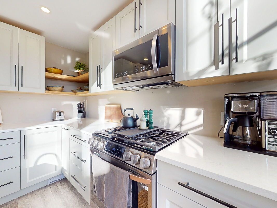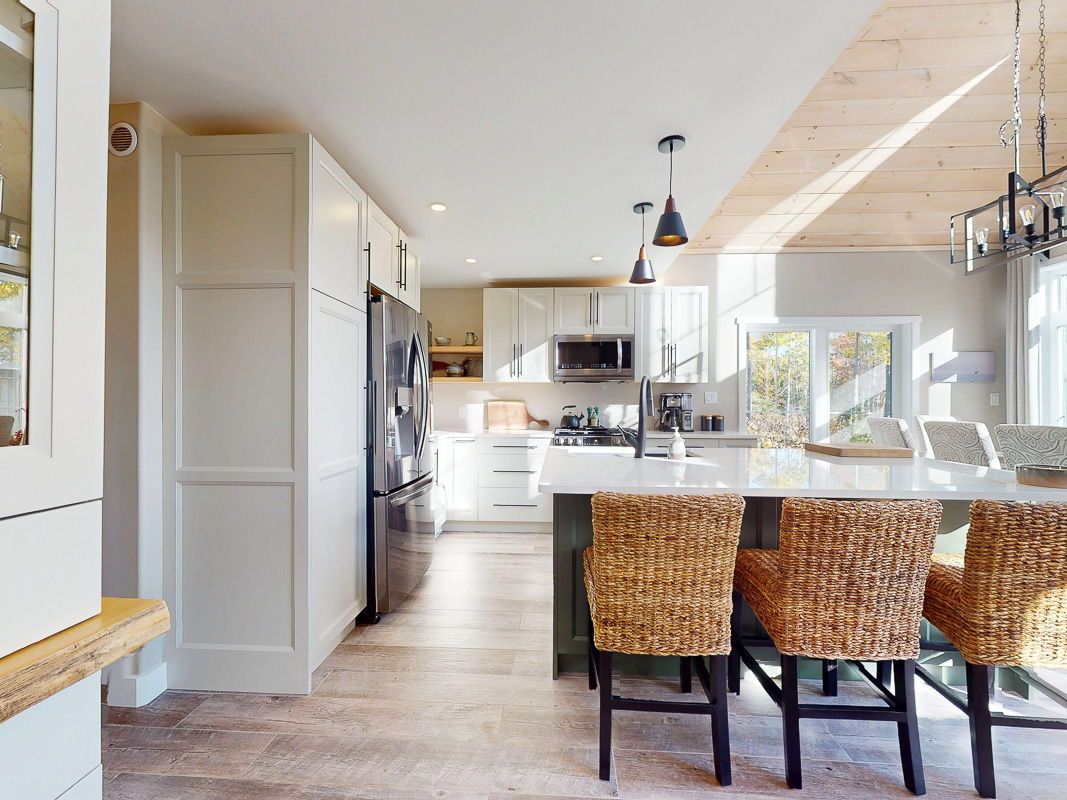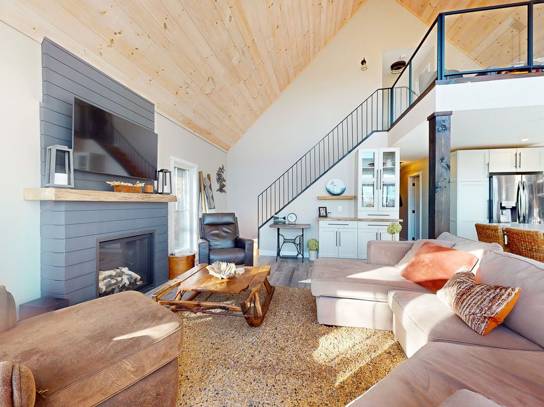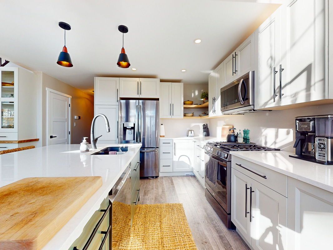 • Open-concept design with cathedral ceilings and a custom kitchen.
