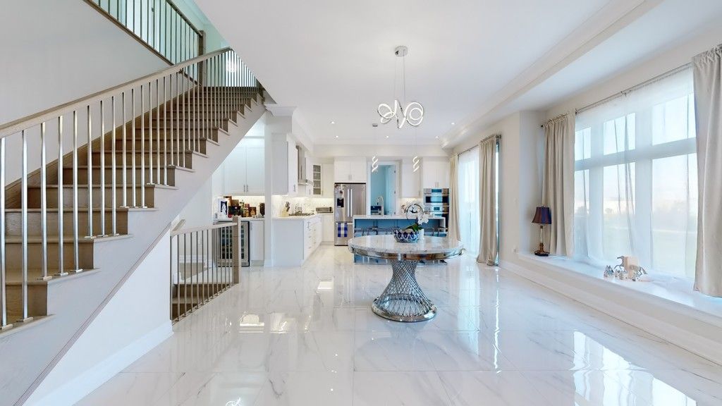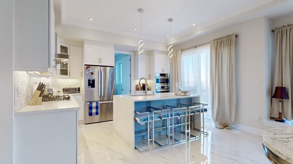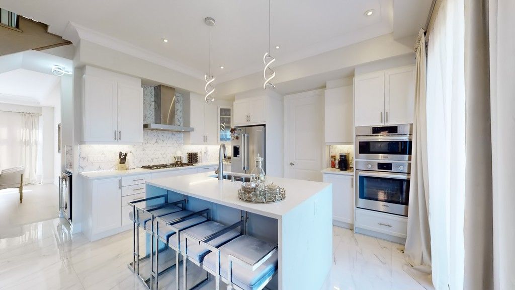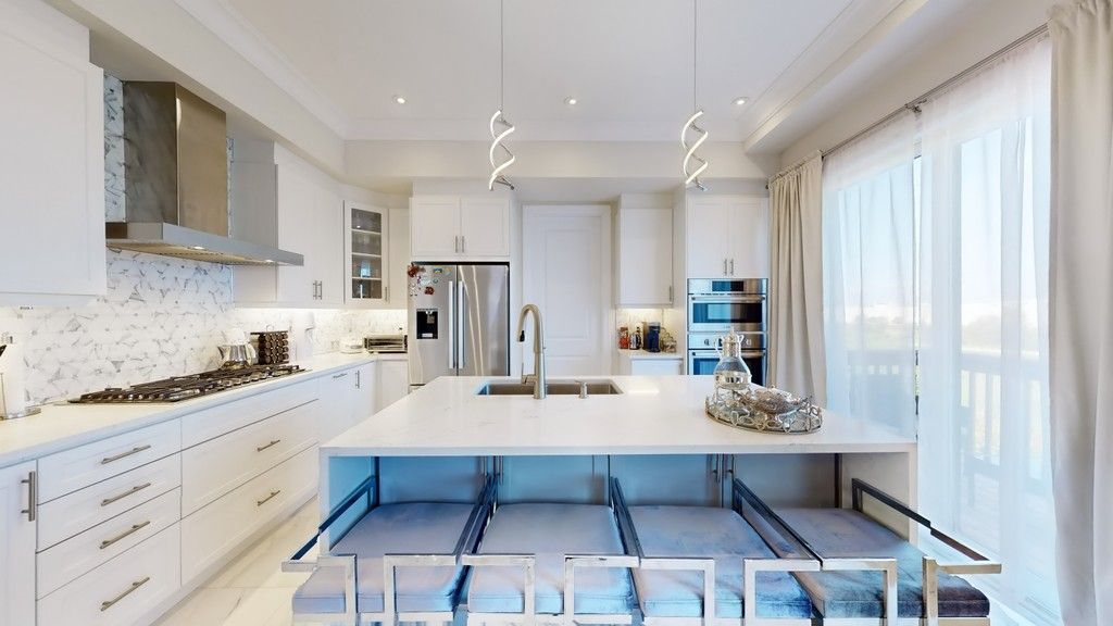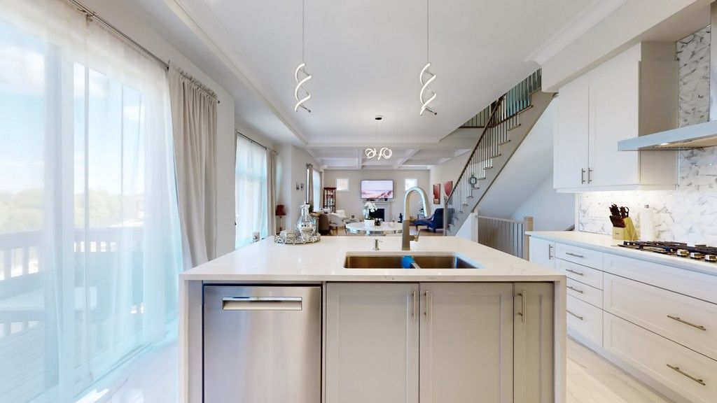 • Modern chef's kitchen with waterfall island and breakfast bar.
