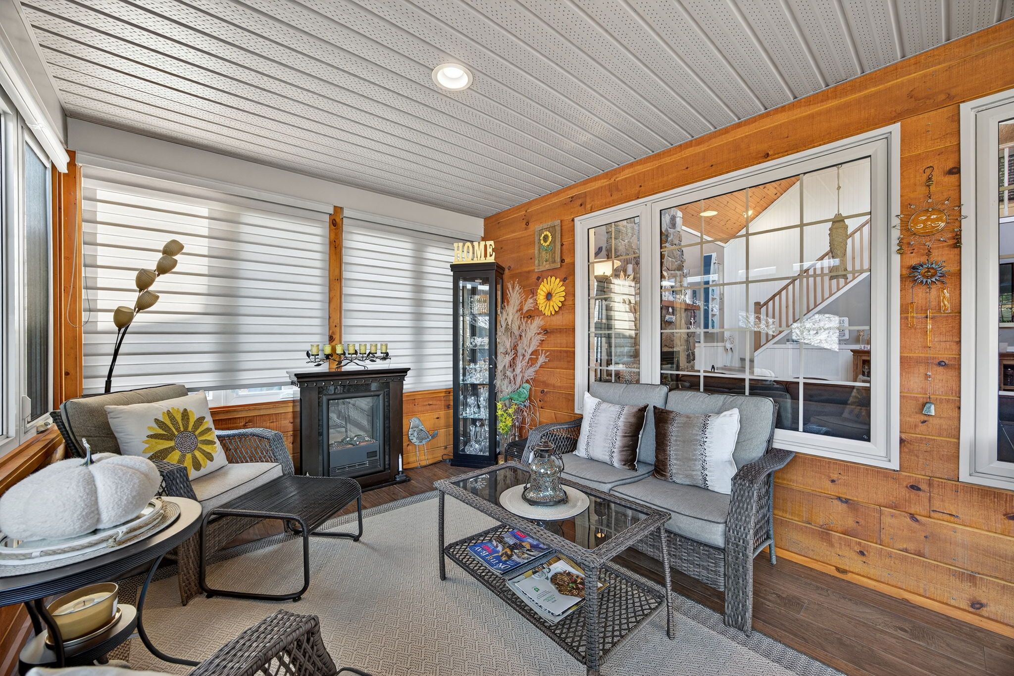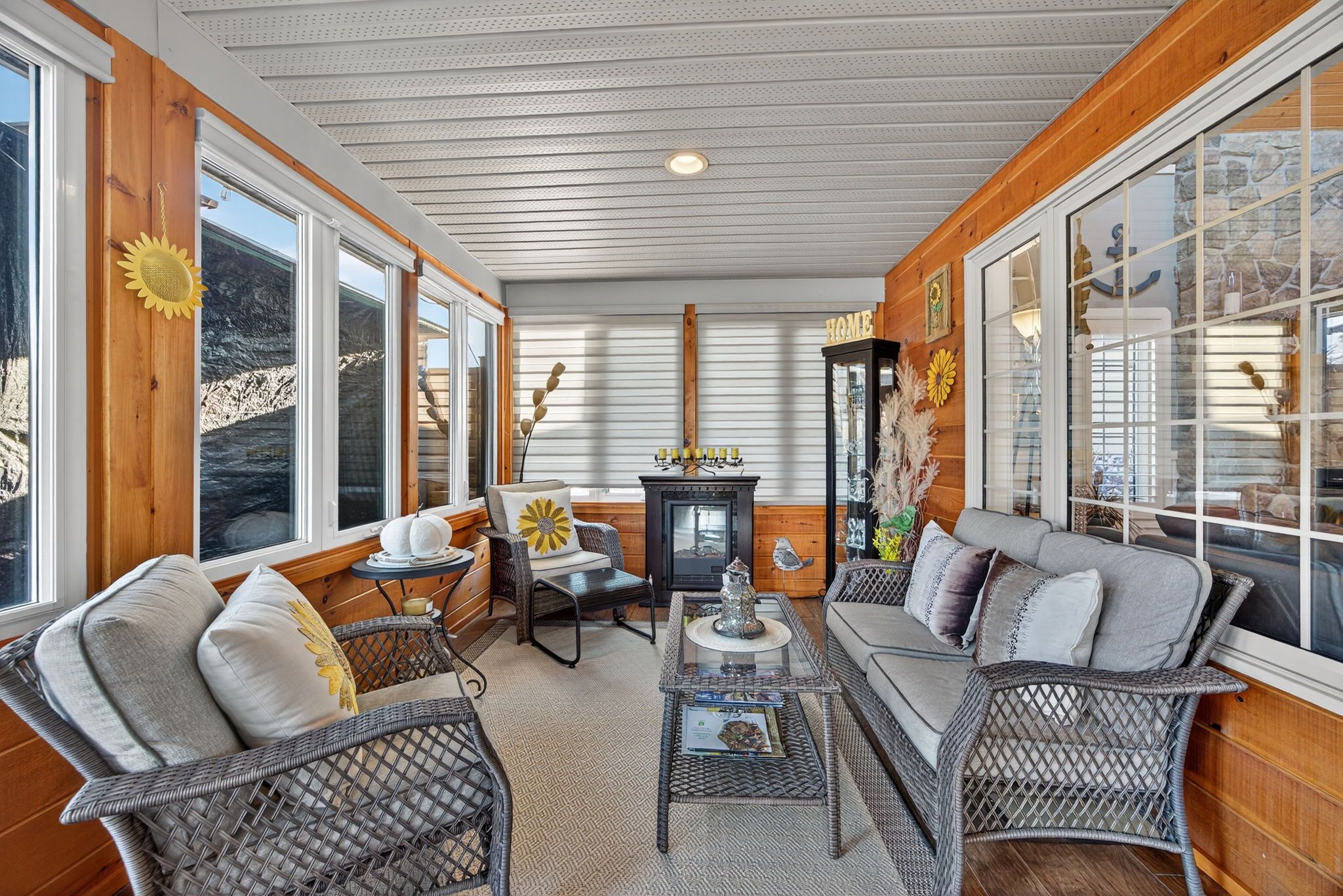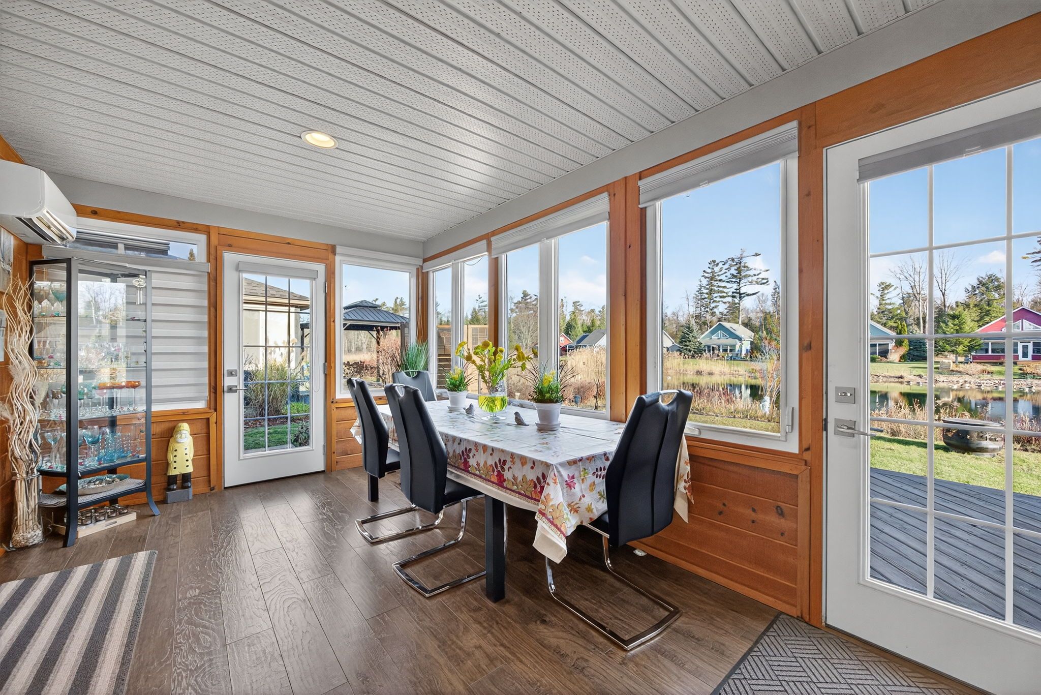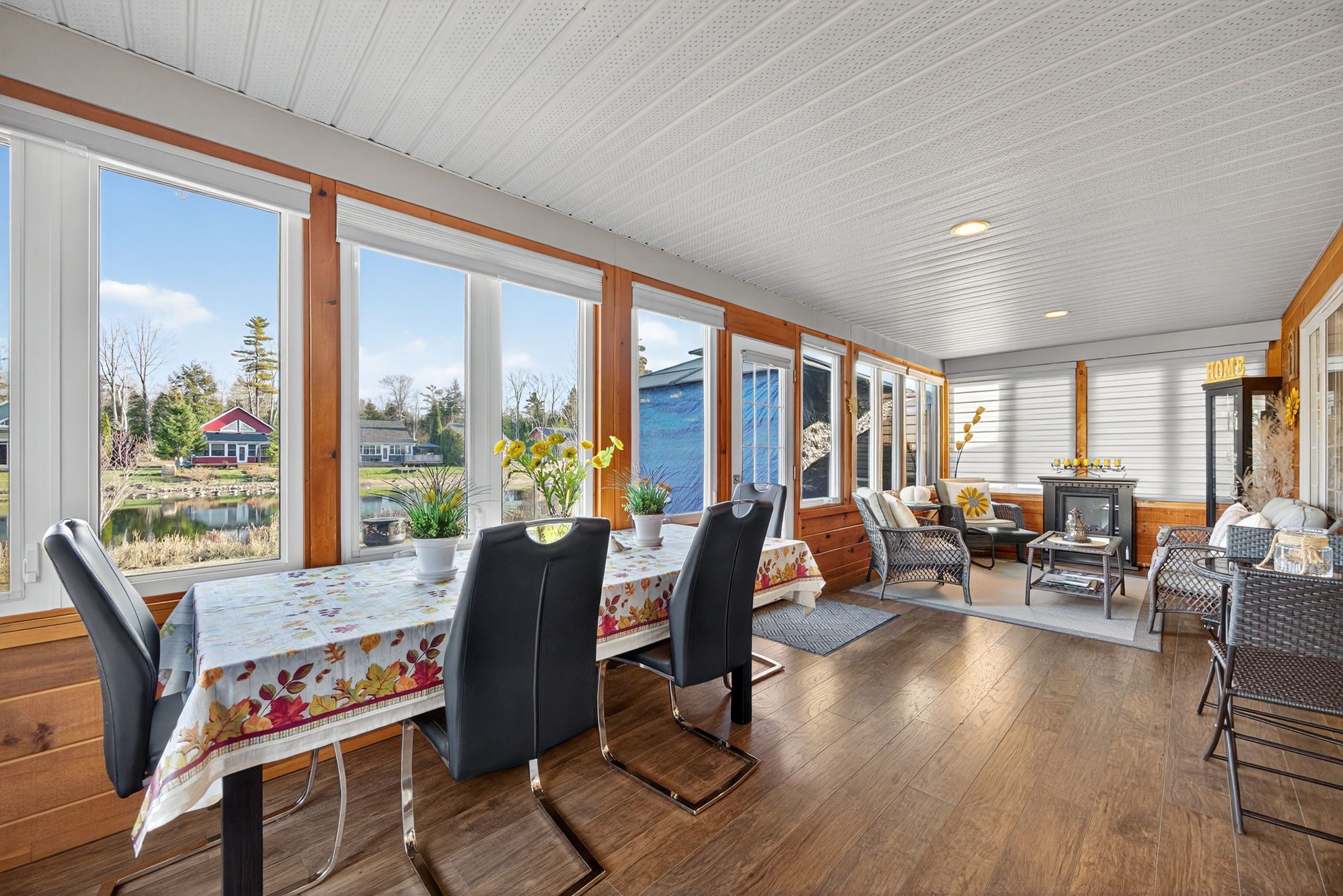 • Cozy gas fireplace and a sunroom with pond views.